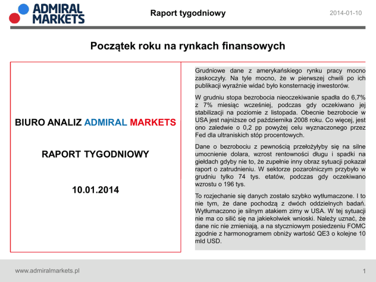 Raport tygodniowy 2014-01-10 Początek roku na rynkach finansowych Grudniowe dane z amerykańskiego rynku pracy mocno zaskoczyły. Na tyle mocno, że w pierwszej chwili po ich publikacji wyraźnie widać było konsternację inwestorów. BIURO ANALIZ ADMIRAL MARKETS RAPORT TYGODNIOWY 10.01.2014 www.admiralmarkets.pl W grudniu stopa bezrobocia nieoczekiwanie spadła do 6,7% z 7% miesiąc wcześniej, podczas gdy oczekiwano jej stabilizacji na poziomie z listopada. Obecnie bezrobocie w USA jest najniższe od października 2008 roku. Co więcej, jest ono zaledwie o 0,2 pp powyżej celu wyznaczonego przez Fed dla ultraniskich stóp procentowych. Dane o bezrobociu z pewnością przełożyłyby się na silne umocnienie dolara, wzrost rentowności długu i spadki na giełdach gdyby nie to, że zupełnie inny obraz sytuacji pokazał raport o zatrudnieniu. W sektorze pozarolniczym przybyło w grudniu tylko 74 tys. etatów, podczas gdy oczekiwano wzrostu o 196 tys. To rozjechanie się danych zostało szybko wytłumaczone. I to nie tym, że dane pochodzą z dwóch oddzielnych badań. Wytłumaczono je silnym atakiem zimy w USA. W tej sytuacji nie ma co silić się na jakiekolwiek wnioski. Należy uznać, że dane nic nie zmieniają, a na styczniowym posiedzeniu FOMC zgodnie z harmonogramem obniży wartość QE3 o kolejne 10 mld USD. 1 Raport tygodniowy 2014-01-10 Początek roku na rynkach finansowych Początek 2014 roku na rynkach finansowych został zdominowany przez politykę Rezerwy Federalnej (Fed). Mianowicie grudniową, w dużej mierze zaskakującą, decyzję o rozpoczęciu procesu ograniczania miesięcznie kupowanych obligacji przez Fed. Wówczas władze monetarne nie tylko zdecydowały o ograniczeniu wartości programu QE3 o 10 mld USD do 75 mld USD kupowanych miesięcznie obligacji, ale też nakreśliły harmonogram wyjścia z tego programu. Ben Bernanke zapowiedział, że jeżeli tylko oczekiwania Fed co do koniunktury gospodarczej w USA sprawdzą się, to na każdym kolejnym posiedzeniu skup obligacji będzie cięty po około 10 mld USD. Oczywiście prezes Fed otworzył sobie jednocześnie furtkę do zmiany tego harmonogramu mówiąc, że jeżeli wzrost gospodarczy będzie silniejszy to cięcia mogą być większe. I odwrotnie. Jeżeli gospodarka zacznie zwalniać to Fed może wstrzymać się z ograniczaniem QE3. Rynki z opóźnieniem zareagowały na rozpoczęcie procesu normalizacji polityki monetarnej w USA. W końcówce 2013 roku zdawały się tego nie zauważać. Wyglądało to tak, jakby inwestorzy i zarządzający chcieli dotrwać do końca roku. Dopiero pierwsze dni 2014 roku przyniosły zauważalną reakcję. Dolara zaczął się umacniać, słabiej zaczęły spisywać się rynki wschodzące, a na giełdach rozpoczęła się www.admiralmarkets.pl realizacja zysków. Wszystkie te reakcje są charakterystyczne dla procesu normalizacji polityki monetarnej. Oczywiście opublikowane dziś dane z rynku pracy stawiają pewien znak zapytania, co może wprowadzić nieco chaosu w decyzje inwestorów, ale nie zmieniają ogólnej tendencji. W tym nie powinny przeszkodzić w kolejnym cięciu QE3 na posiedzeniu FOMC w dniach 28-29 stycznia br. Najmniej zaskakuje umocnienie dolara. W naszych komentarzach już wielokrotnie powtarzaliśmy, że rok 2014 będzie rokiem amerykańskiego dolara na forexie. Nie tylko dlatego, że Fed rozpoczął proces normalizacji polityki monetarnej. Również dlatego, że sytuacja amerykańskiej gospodarki jest lepsza niż wielu innych czołowych gospodarek. Lepsze są też jej perspektywy (chociażby powinien poprawiać się bilans handlowy). Oczekujemy ponadto, że Europejski Bank Centralny oraz europejscy politycy spróbują werbalnie osłabić euro, działania Banku Japonii będą osłabiać jena, szwajcarski frank rozpocznie powolny proces osłabienia do większości walut, a sytuacja gospodarcza w Chinach będzie wpływać na osłabienie walut rynków wschodzących. 2 Raport tygodniowy 2014-01-10 Początek roku na rynkach finansowych cd. Dlatego oczekujemy, że na koniec roku kurs EUR/USD spadnie poniżej 1,30 i przetestuje okolice 1,27 dolara. Jednocześnie USD/JPY wzrośnie przynajmniej do 110 jenów. Natomiast kurs USD/PLN wzrośnie w okolice 3,18-3,20 zł. Realizacja zysków na giełdach również nie jest zaskoczeniem w kontekście polityki Fed. Chyba, że mamy na myśli polski rynek akcji, który w ostatnich dniach spisywał sie tak słabo, że znalazł się w 10 najsłabiej spisujących się giełd. W przypadku giełd, w odróżnieniu od sytuacji na rynku walutowym, cięcie QE3 jest jedynie pretekstem do realizacji zysków, a nie początkiem trwalszego trendu. Oczekiwane w tym roku przyspieszenie wzrostu gospodarczego na świecie, jakie będzie mieć miejsce w środowisku wciąż rekordowo niskich stóp procentowych, w naturalny sposób premiuje akcje kosztem innych aktywów. oczekuje, że w IV kwartale 2013 amerykańskie spółki poprawiły zyski o 7,6%. To dość niskie oczekiwania. Dlatego relatywnie łatwiej będzie o pozytywne niespodzianki niż rozczarowania. A to będzie wspierać nastroje na Wall Street i na innych rynkach akcji. W przyszłym tygodniu wyniki spółek zaczną odgrywać pierwszoplanową rolę. Nie mniej jednak nie można zapominać o publikacjach danych makroekonomicznych. Inwestorzy poznają m.in. dane o inflacji i sprzedaży w USA, raporty z tamtejszego rynku nieruchomości, indeksy Fed z Filadelfii, Uniwersytetu Michigan i NY Empire State, czy też niemieckie dane o PKB za 2013 roku. O tym, czy w przyszłym tygodniu na giełdach wciąż będzie trwała realizacja zysków, zdecydują przede wszystkim doniesienia z amerykańskich spółek, które wkroczyły w kolejny sezon publikacji wyników kwartalnych. Raportami finansowymi pochwalą się m.in. banki JPMorgan, Bank of America, Goldman Sachs, Citigroup i Morgan Stanley, a także American Express, Intel i General Electric. Rynek www.admiralmarkets.pl 3 Raport tygodniowy 2014-01-10 