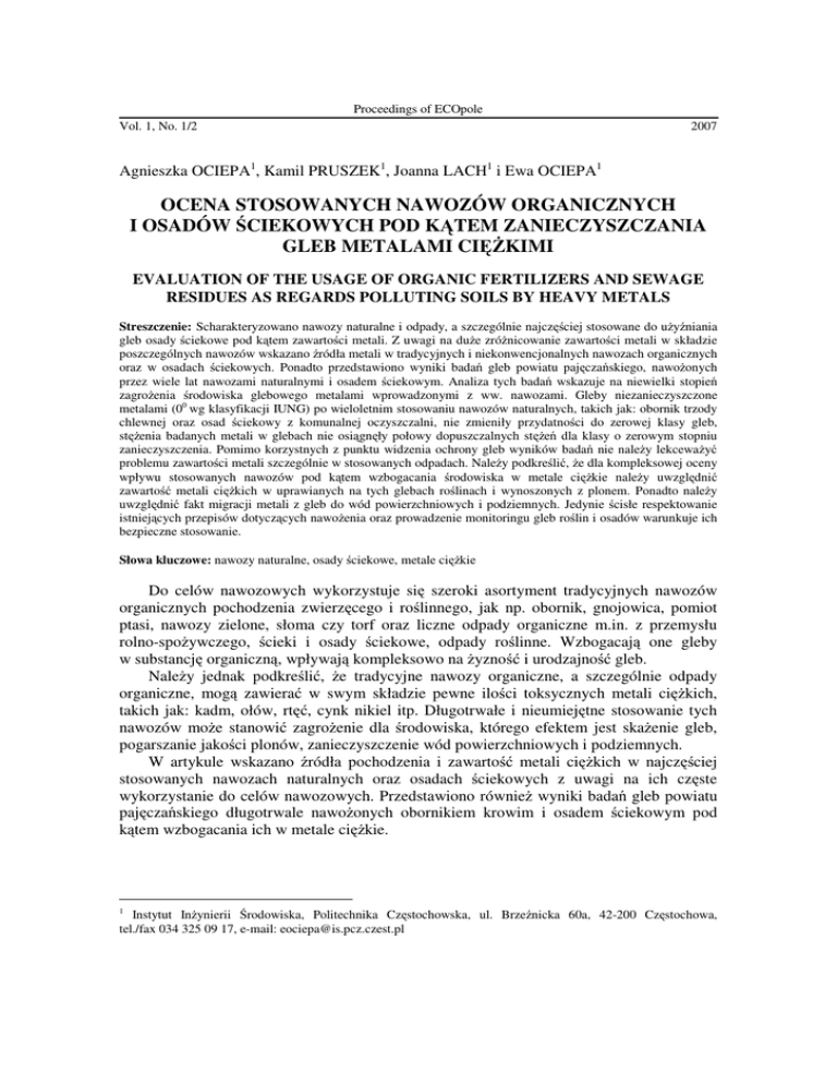 Proceedings of ECOpole Vol. 1, No. 1/2 2007 Agnieszka OCIEPA1, Kamil PRUSZEK1, Joanna LACH1 i Ewa OCIEPA1 OCENA STOSOWANYCH NAWOZÓW ORGANICZNYCH I OSADÓW ŚCIEKOWYCH POD KĄTEM ZANIECZYSZCZANIA GLEB METALAMI CIĘŻKIMI EVALUATION OF THE USAGE OF ORGANIC FERTILIZERS AND SEWAGE RESIDUES AS REGARDS POLLUTING SOILS BY HEAVY METALS Streszczenie: Scharakteryzowano nawozy naturalne i odpady, a szczególnie najczęściej stosowane do użyźniania gleb osady ściekowe pod kątem zawartości metali. Z uwagi na duże zróżnicowanie zawartości metali w składzie poszczególnych nawozów wskazano źródła metali w tradycyjnych i niekonwencjonalnych nawozach organicznych oraz w osadach ściekowych. Ponadto przedstawiono wyniki badań gleb powiatu pajęczańskiego, nawożonych przez wiele lat nawozami naturalnymi i osadem ściekowym. Analiza tych badań wskazuje na niewielki stopień zagrożenia środowiska glebowego metalami wprowadzonymi z ww. nawozami. Gleby niezanieczyszczone metalami (00 wg klasyfikacji IUNG) po wieloletnim stosowaniu nawozów naturalnych, takich jak: obornik trzody chlewnej oraz osad ściekowy z komunalnej oczyszczalni, nie zmieniły przydatności do zerowej klasy gleb, stężenia badanych metali w glebach nie osiągnęły połowy dopuszczalnych stężeń dla klasy o zerowym stopniu zanieczyszczenia. Pomimo korzystnych z punktu widzenia ochrony gleb wyników badań nie należy lekceważyć problemu zawartości metali szczególnie w stosowanych odpadach. Należy podkreślić, że dla kompleksowej oceny wpływu stosowanych nawozów pod kątem wzbogacania środowiska w metale ciężkie należy uwzględnić zawartość metali ciężkich w uprawianych na tych glebach roślinach i wynoszonych z plonem. Ponadto należy uwzględnić fakt migracji metali z gleb do wód powierzchniowych i podziemnych. Jedynie ścisłe respektowanie istniejących przepisów dotyczących nawożenia oraz prowadzenie monitoringu gleb roślin i osadów warunkuje ich bezpieczne stosowanie. Słowa kluczowe: nawozy naturalne, osady ściekowe, metale ciężkie Do celów nawozowych wykorzystuje się szeroki asortyment tradycyjnych nawozów organicznych pochodzenia zwierzęcego i roślinnego, jak np. obornik, gnojowica, pomiot ptasi, nawozy zielone, słoma czy torf oraz liczne odpady organiczne m.in. z przemysłu rolno-spożywczego, ścieki i osady ściekowe, odpady roślinne. Wzbogacają one gleby w substancję organiczną, wpływają kompleksowo na żyzność i urodzajność gleb. Należy jednak podkreślić, że tradycyjne nawozy organiczne, a szczególnie odpady organiczne, mogą zawierać w swym składzie pewne ilości toksycznych metali ciężkich, takich jak: kadm, ołów, rtęć, cynk nikiel itp. Długotrwałe i nieumiejętne stosowanie tych nawozów może stanowić zagrożenie dla środowiska, którego efektem jest skażenie gleb, pogarszanie jakości plonów, zanieczyszczenie wód powierzchniowych i podziemnych. W artykule wskazano źródła pochodzenia i zawartość metali ciężkich w najczęściej stosowanych nawozach naturalnych oraz osadach ściekowych z uwagi na ich częste wykorzystanie do celów nawozowych. Przedstawiono również wyniki badań gleb powiatu pajęczańskiego długotrwale nawożonych obornikiem krowim i osadem ściekowym pod kątem wzbogacania ich w metale ciężkie. 1 Instytut Inżynierii Środowiska, Politechnika Częstochowska, ul. Brzeźnicka 60a, 42-200 Częstochowa, tel./fax 034 325 09 17, e-mail: [email protected] 196 Agnieszka Ociepa, Kamil Pruszek, Joanna Lach i Ewa Ociepa Źródła i zawartość metali ciężkich w tradycyjnych nawozach organicznych i osadach ściekowych Metale ciężkie obecne w składzie naturalnych nawozów pochodzenia zwierzęcego pochodzą głównie z podawanych zwierzętom pokarmów, wody, a także stosowanych leków weterynaryjnych. Ponadto mogą być obecne w składzie preparatów higienicznych stosowanych do czyszczenia obór czy w materiałach używanych jako składniki ściółki. Z uwagi na różne warunki chowu zwierząt zawartość metali w tym samym nawozie, np. oborniku, może znacznie się różnić w zależności od gospodarstwa. W tabeli 1 przedstawiono średnie wartości metali ciężkich w najczęściej stosowanych nawozach organicznych. Tabela 1 Średnia zawartość metali ciężkich w wybranych nawozach organicznych [1, 2] Nawóz Obornik Gnojowica bydlęca Gnojowica trzody chlewnej Pomiot ptasi Hg 0,12 0,03 0,07 0,08 Cd 1,8 0,019 0,24 0,06 Zawartość [mg/kg s.m.] Cr Ni 45,3 1,9 1,65 0,70 1,86 1,20 15,4 10,05 Pb 12,8 4,11 3,65 7,52 Zn 156 12,0 14,6 108,3 Znacznie większe i na ogół bardzo zróżnicowane są zawartości metali ciężkich w osadach ściekowych w porównaniu z wyżej przedstawionymi naturalnymi nawozami. Do celów nawozowych nadają się osady obciążone zanieczyszczeniami pochodzenia naturalnego, czyli bytowo-gospodarcze oraz z przemysłu rolnego i spożywczego. Analizując wyniki licznych badań, stwierdza się, że w osadach ściekowych ilość metali ciężkich może wahać się w bardzo szerokim zakresie [3, 4], np.: • cynku - od kilkudziesięciu do kilku tysięcy mg/kg s.m., • chromu - od kilku do kilku tysięcy mg/kg s.m., • ołowiu - od kilku do kilkuset mg/kg s.m. W związku z powyższym wykorzystanie osadów ściekowych do celów nawozowych jest możliwe tylko pod warunkiem przestrzegania rygorystycznych przepisów dotyczących zawartości metali w osadzie oraz glebie, do której będą wprowadzane [5, 6]. Cel i zakres badań Celem badań było określenie wpływu długoletniego nawożenia gleb obornikiem i osadem ściekowym na ich wzbogacenie w metale ciężkie. Badania były prowadzone w listopadzie i grudniu 2006 r. Zakres badań obejmował określenie całkowitej zawartości kadmu, ołowiu, cynku i niklu w oborniku krowim i osadzie ściekowym, określenie całkowitej zawartości Cd, Pb, Ni, i Zn w glebach wzorcowych, określenie całkowitej zawartości Cd, Pb, Ni, i Zn w glebach nawożonych prz