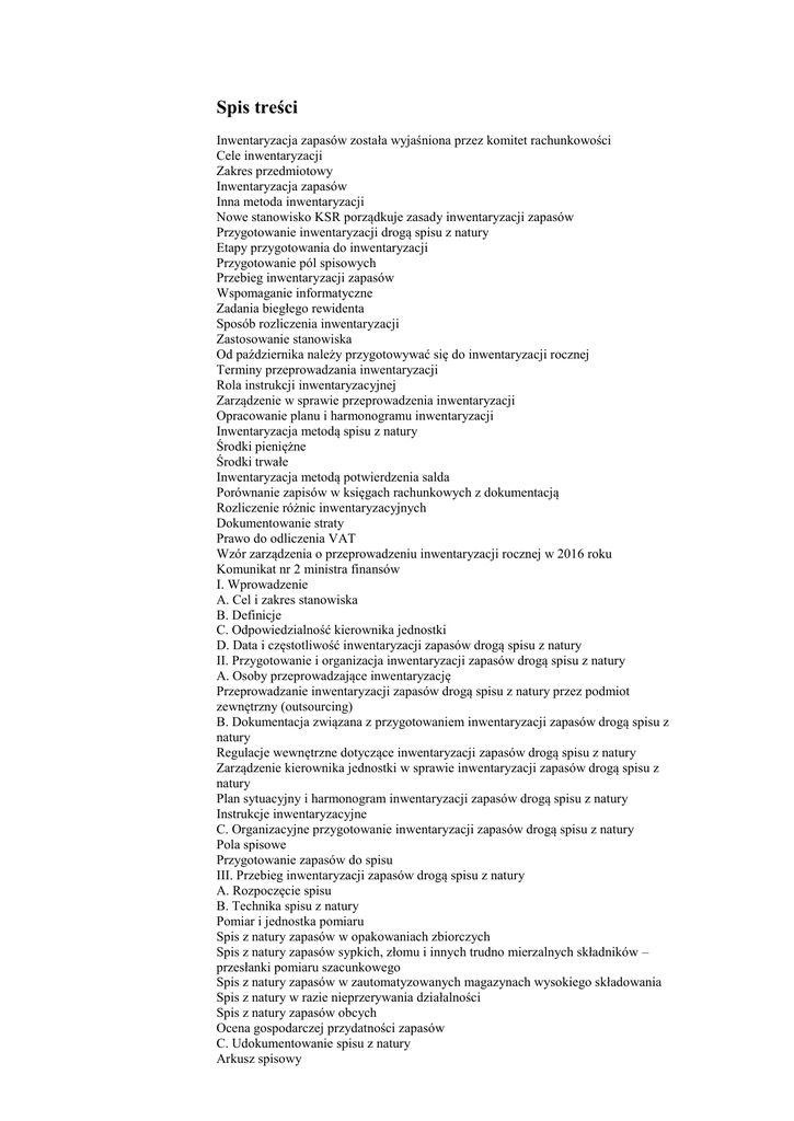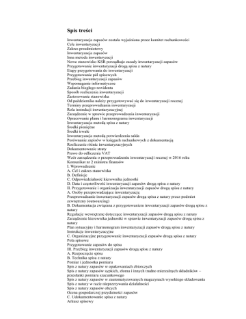 Spis treści Inwentaryzacja zapasów została wyjaśniona przez komitet rachunkowości Cele inwentaryzacji Zakres przedmiotowy Inwentaryzacja zapasów Inna metoda inwentaryzacji Nowe stanowisko KSR porządkuje zasady inwentaryzacji zapasów Przygotowanie inwentaryzacji drogą spisu z natury Etapy przygotowania do inwentaryzacji Przygotowanie pól spisowych Przebieg inwentaryzacji zapasów Wspomaganie informatyczne Zadania biegłego rewidenta Sposób rozliczenia inwentaryzacji Zastosowanie stanowiska Od października należy przygotowywać się do inwentaryzacji rocznej Terminy przeprowadzania inwentaryzacji Rola instrukcji inwentaryzacyjnej Zarządzenie w sprawie przeprowadzenia inwentaryzacji Opracowanie planu i harmonogramu inwentaryzacji Inwentaryzacja metodą spisu z natury Środki pieniężne Środki trwałe Inwentaryzacja metodą potwierdzenia salda Porównanie zapisów w księgach rachunkowych z dokumentacją Rozliczenie różnic inwentaryzacyjnych Dokumentowanie straty Prawo do odliczenia VAT Wzór zarządzenia o przeprowadzeniu inwentaryzacji rocznej w 2016 roku Komunikat nr 2 ministra finansów I. Wprowadzenie A. Cel i zakres stanowiska B. Definicje C. Odpowiedzialność kierownika jednostki D. Data i częstotliwość inwentaryzacji zapasów drogą spisu z natury II. Przygotowanie i organizacja inwentaryzacji zapasów drogą spisu z natury A. Osoby przeprowadzające inwentaryzację Przeprowadzanie inwentaryzacji zapasów drogą spisu z natury przez podmiot zewnętrzny (outsourcing) B. Dokumentacja związana z przygotowaniem inwentaryzacji zapasów drogą spisu z natury Regulacje wewnętrzne dotyczące inwentaryzacji zapasów drogą spisu z natury Zarządzenie kierownika jednostki w sprawie inwentaryzacji zapasów drogą spisu z natury Plan sytuacyjny i harmonogram inwentaryzacji zapasów drogą spisu z natury Instrukcje inwentaryzacyjne C. Organizacyjne przygotowanie inwentaryzacji zapasów drogą spisu z natury Pola spisowe Przygotowanie zapasów do spisu III. Przebieg inwentaryzacji zapasów drogą spisu z natury A. Rozpoczęcie spisu B. Technika spisu z natury Pomiar i jednostka pomiaru Spis z natury zapasów w opakowaniach zbiorczych Spis z natury zapasów sypkich, złomu i innych trudno mierzalnych składników – przesłanki pomiaru szacunkowego Spis z natury zapasów w zautomatyzowanych magazynach wysokiego składowania Spis z natury w razie nieprzerywania działalności Spis z natury zapasów obcych Ocena gospodarczej przydatności zapasów C. Udokumentowanie spisu z natury Arkusz spisowy Trwałość zapisów w dokumentach spisowych i poprawianie błędów D. Inwentaryzacja zapasów drogą spisu z natury wspomagana informatycznie E. Kontrola przebiegu i dokumentów spisu z natury Kontrolerzy spisowi Udział biegłego rewidenta w spisie z natury zapasów Zastrzeżenia osoby odpowiedzialnej do spisu z natury F. Zakończenie spisu G. Inwentaryzacja ciągła IV. Rozliczenie inwentaryzacji zapasów drogą spisu z natury A. Wycena spisu z natury Miejsce i przedmiot wyceny Ceny stosowane do wyceny spisu Wycena spisu B. Ustalanie różnic inwentaryzacyjnych – porównanie stanów stwierdzonych drogą spisu z natury ze stanami wykazanymi w ewidencji księgowej Warunki porównania wyników spisu ze stanami księgowymi C. Wyjaśnienie i rozliczenie różnic inwentaryzacyjnych Wyjaśnienie przyczyn różnic inwentaryzacyjnych Różnice pozorne Różnice ilościowe – niedobory Różnice jakościowe (szkody) Różnice ilościowe – nadwyżki Kompensata Protokół z rozliczenia różnic inwentaryzacyjnych Zakończenie prac komisji inwentaryzacyjnej D. Archiwizacja dokumentacji inwentaryzacyjnej