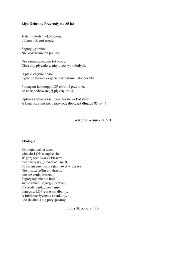 Liga Ochrony Przyrody ma 85 lat Jestem młodym ekologiem, I dbam o Ziemi urodę. Segreguję śmieci, Nie wyrzucam ich jak leci. Nie zanieczyszczam też wody, Chcę aby pływało w niej dużo ryb młodych. O ptaki chętnie dbam Sypię do karmnika garść okruszków i słonecznika. Pomagam jak mogę LOP chronić przyrodę, bo chcę podziwiać jej piękną urodę. Upływa szybko czas i zmienia się wokół świat, A Liga uczy nas jak o przyrodę dbać, już długich 85 lat!!! Wiktoria Wiśniak kl. VB Ekologia Ekologia ważna rzecz, więc do LOP-u zapisz się, W górę ręce skacz i klaszcz niech usłyszy „Czwórkę” świat, Po swym psie posprzątaj nawet w deszcz, Nie niszcz roślin ani drzew, one też czują dreszcz, Segregacja nic nie boli, swoje śmieci segreguj dowoli, Przyrodę bardzo kochamy, dlatego z LOP-em o nią dbamy, A jubilatce życzenia składamy, i do działania się przyłączamy. Julia Skrobisz kl. Vb „85 lat LOP” Już 85 lat, LOP wiedzie prym, W czym? No w czym? By środowisko nasze chronić i zwierzęta wszystkie bronić. Dlatego ochrona środowiska to rzecz mi bardzo bliska. Bo ja chcę na czystej Ziemi żyć, i czystą wodę pić. Dlatego staram się codziennie, wszystkie śmieci zbierać dzielnie. Później chętnie je segreguję i do kontenerów ładuję. O zwierzęta też chętnie dbam, zawsze świeżą karmę dla nich mam. Oliver Laskowski kl. Vb Kochajmy przyrodę By w lasach rosły jagody Teraz i także w przyszłości W jeziorach błękitnej wody Nie brakowało dla naszej radości. By piękne Słońca zachody Podziwiać mógł każdy na nowo Doświadczyć świata urody Odżywiać się tylko zdrowo. By białe bezkresne lody W dalekich krainach przetrwały Fabryki i samochody Powietrza nie zatruwały. W Lidze Ochrony Przyrody Ja i inni pracują Zwyciężą wszystkie przeszkody I dla nas świat uratują. Natalia Goryńska kl. Vb Urodziny LOP Minęło 85 lat odkąd LOP o naturę dba. Czas płynął szybko jak woda w rzece. Choć na swej drodze Liga przeszkód miała wiele, Ona wciąż do przodu rwie przez lat wiele. Wciągnęła i nas. Więc wszyscy razem pracujemy dzielnie, w naszym szkolnym kole bardzo rzetelnie. Dbamy o przyrodę, podziwiamy łąk, jezior i lasów urodę. Wszyscy razem starzy, młodzi przyrodę wspierajmy i do LOP-u się przyłączajmy. A Ty Ligo działaj nam jeszcze wiele lat tego potrzebuje zmęczony cywilizacją świat. Nikola Wiśniak kl. Va