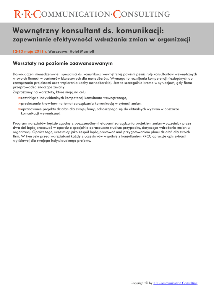 Wewnętrzny konsultant ds. komunikacji: zapewnianie efektywności wdrażania zmian w organizacji 12-13 maja 2011 r. Warszawa, Hotel Marriott Warsztaty na poziomie zaawansowanym Doświadczeni menedżerowie i specjaliści ds. komunikacji wewnętrznej powinni pełnić rolę konsultantów wewnętrznych w swoich firmach – partnerów biznesowych dla menedżerów. Wymaga to rozwijania kompetencji niezbędnych do zarządzania projektami oraz wspierania kadry menedżerskiej. Jest to szczególnie istotne w sytuacjach, gdy firma przeprowadza znaczące zmiany. Zapraszamy na warsztaty, które mają na celu: • rozwinięcie indywidualnych kompetencji konsultanta wewnętrznego, • przekazanie know-how na temat zarządzania komunikacją w sytuacji zmian, • opracowanie projektu działań dla swojej firmy, odnoszącego się do aktualnych wyzwań w obszarze komunikacji wewnętrznej. Program warsztatów będzie zgodny z poszczególnymi etapami zarządzania projektem zmian – uczestnicy przez dwa dni będą pracować w oparciu o specjalnie opracowane studium przypadku, dotyczące wdrażania zmian w organizacji. Oprócz tego, uczestnicy jako zespół będą pracować nad przygotowaniem planu działań dla swoich firm. W tym celu przed warsztatami każdy z uczestników wspólnie z konsultantem RRCC opracuje opis sytuacji wyjściowej dla swojego indywidualnego projektu. Copyright © by RR Communication Consulting Trener Roman Rostek to jeden z wiodących specjalistów w Polsce w zakresie budowania zaangażowania pracowników i zarządzania komunikacją. Jego bogate doświadczenia, zgromadzone w ciągu kilkunastu lat, obejmują realizację takich projektów, jak budowanie i wdrażanie projektów zaangażowania pracowników, strategii komunikacji, wdrożenia nowych instrumentów komunikacji, badania opinii pracowników i audyty komunikacyjne, treningi komunikacyjne, oraz warsztaty doskonalące innowacyjność, performance management, zarządzanie personelem, zarządzanie wiedzą. Opublikował kilkadziesiąt artykułów w takich czasopismach, jak Journal of Employee Communication Management, Ragan Report, Harvard Business Review Polska, Personel, Businessman Magazine, Rzeczpospolita. Jest absolwentem Central Connecticut State University w New Britain, USA (komunikacja organizacyjna) i Uniwersytetu Wrocławskiego (socjologia). Należy do International Association of Business Communicators. Organizator RR Communication Consulting istnieje od 2005 roku. Od tego czasu zrealizowaliśmy wiele projektów badawczych, doradczych i szkoleniowych dla wiodących firm działających w Polsce. Opublikowaliśmy kilkadziesiąt artykułów i raportów z badań. Czym się zajmujemy? Wykorzystując wiedzę ekspercką z obszaru komunikacji wewnętrznej, wspieramy naszych Klientów w tworzeniu takiego środowiska pracy, w którym pracuje się efektywnie, z silnym poczuciem identyfikacji i satysfakcji. Dlatego, dzięki zaangażowanej kadrze, nasi Klienci mogą osiągać bardzo dobre efekty biznesowe. W czym się specjalizujemy? Oferujemy kompleksowe wsparcie w następujących obszarach: • Strategiczne zarządzanie komunikacją organizacyjną • Doskonalenie komunikacji kierowniczej • Zarządzanie zmianą • Budowanie zaangażowania pracowników • Internal Branding • Doskonalenie narzędzi komunikacji wewnętrznej Copyright © by RR Communication Consulting Program szkolenia Przed szkoleniem Określenie najważniejszych wyzwań w organizacji Konsultant RRCC przeprowadzi wywiad telefoniczny, co pozwoli na dookreślenie sytuacji wyjściowej dla projektu działań komunikacyjnych, który będzie rozwijany w ramach ćwiczeń podczas szkolenia. Dzień I / 12 maja 2011 /10:00 Rozpoczęcie szkolenia/ Kompetencje wewnętrznego konsultanta ds. komunikacji ● Jakie specyficzne umiejętności musi posiadać wewnętrzny konsultant? ● Na czym polega strategiczne doradzanie? ● Jakie są czynniki sukcesu dla efektywnego konsultanta? ● • • • • • Ewolucja zadań specjalisty ds. komunikacji wewnętrznej. Od korektora do strategicznego doradcy. Konsultant wewnętrzny a konsultant zewnętrzny. Kluczowe kompetencje konsultanta wewnętrznego. Autodiagnoza: moje kompetencje jako konsultanta wewnętrznego (test). Budowanie relacji z menedżerami ● Na czym polegają zdrowe relacje wewnętrznego konsultanta z menedżerami? ● Jak pomagać menedżerom? ● Jak wzmacniać rzeczowe relacje? ● • • • • • Zasady tworzenia efektywnej relacji konsultant wewnętrzny – menedżer. Zmiana ról – od korektora do strategicznego doradcy. Sposoby wzmacniania relacji z menedżerami. Rozpoznawanie rzeczywistego komunikatu. Ćwiczenie: prowadzenie doradztwa dla menedżera – studium przypadku (praca w podgrupach). Metody diagnozowania sytuacji wyjściowej ● Jakie informacje należy zdobyć w fazie diagnozy? ● Jak rozpoznawać rzeczywiste problemy w organizacji? ● W jaki sposób ustrukturyzować wyniki diagnozy? ● • Prowadzenie pogłębionego wywiadu diagnostycznego. • Ćwiczenie: prowadzenie pogłębionego wywiadu diagnostycznego – praca w parach. /14:00 – 15:00 Lunch/ Metody diagnozowania sytuacji wyjściowej – c.d. • • • • Prowadzenie fokusowego wywiadu grupowego. Ćwiczenie: prowadzenie pogłębionego wywiadu diagnostycznego – praca w parach. Analiza pola sił. Ćwiczenie: określanie grup docelowych w oparciu o analizę pola sił – praca w podgrupach. /17:00 Zakończenie pierwszego dnia szkolenia/ Copyright © by RR Communication Consulting Dzień II / 13 maja 2011 /9:00 Rozpoczęcie szkolenia/ Opracowywanie planu działań komunikacyjnych ● Jak opracować efektywny plan? ● Jak rozpoznawać i eliminować ryzyka dla planu działań komunikacyjnych? ● Kto powinien opracowywać plan działań? ● • • • • Planowanie scenariuszowe. Diagnoza ryzyk. Grupowe wypracowywanie planu działań komunikacyjnych. Ćwiczenie: Opracowanie planu działań komunikacyjnych dla projektu – praca w po