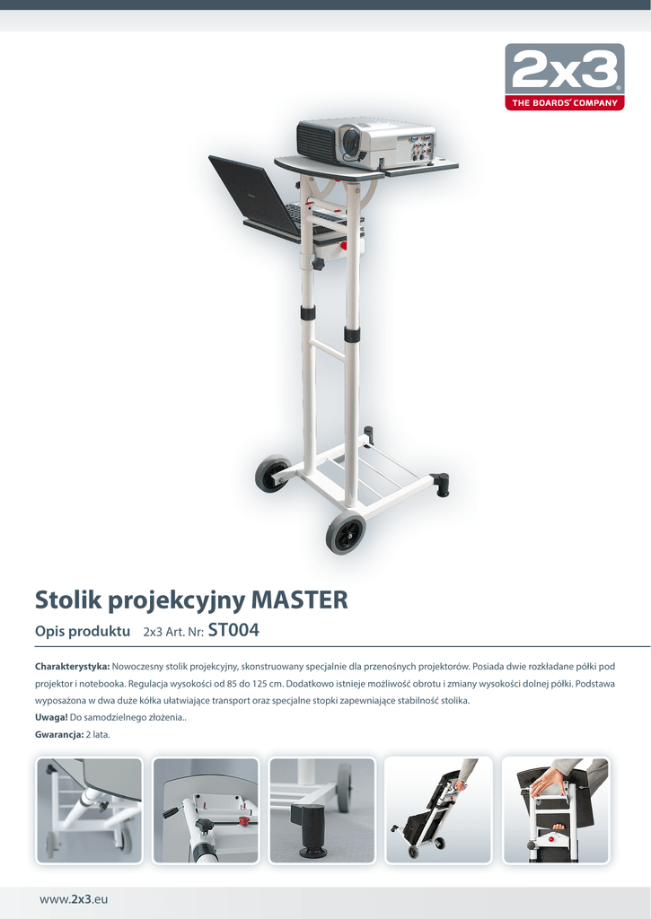 Stolik projekcyjny MASTER Opis produktu 2x3 Art. Nr: ST004 Charakterystyka: Nowoczesny stolik projekcyjny, skonstruowany specjalnie dla przenośnych projektorów. Posiada dwie rozkładane półki pod projektor i notebooka. Regulacja wysokości od 85 do 125 cm. Dodatkowo istnieje możliwość obrotu i zmiany wysokości dolnej półki. Podstawa wyposażona w dwa duże kółka ułatwiające transport oraz specjalne stopki zapewniające stabilność stolika. Uwaga! Do samodzielnego złożenia.. Gwarancja: 2 lata. www.2x3.eu SPECYFIKACJA TECHNICZNA Stolik projekcyjny MASTER 2x3 Art. Nr ST004 Wysokość całkowita (regulowana) [cm] 85-125 Konstrukcja stalowa Wymiary blatów [cm] blat górny 42×35 blat dolny 36×24 Grubość blatów [mm] 18 Powierzchnia blatów antyposlizgowa Maksymalne obciążenie blatów [kg] Wysokość blatów (regulowana) [cm] blat górny 10,0 blat dolny 5,0 blat górny 85-125 blat dolny 73-113 Podstawa 2 kółka i 2 stopki Średnica kółek [cm] 12,5 Waga [kg] 14,0 Gwarancja 2 lata ST004 Master 2x3 S.A. 73-231 Krzęcin, ul. Słoneczna 3, Polska [i]: 801 23 00 23 [t]: +48 95 765 3848 [f]: +48 95 765 3850 [e]: [email protected] [w]: www.2x3.eu innowacje w komunikacji wizualnej
