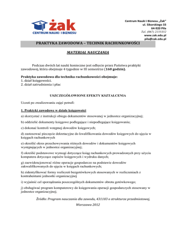 Centrum Nauki i Biznesu „Żak” ul. Sikorskiego 33 64-920 Piła Tel. (067) 2155352 www.zak.edu.pl [email protected] PRAKTYKA ZAWODOWA – TECHNIK RACHUNKOWOŚCI MATERIAŁ NAUCZANIA Podczas dwóch lat nauki konieczne jest odbycie przez Państwa praktyki zawodowej, która obejmuje 4 tygodnie w III semestrze (160 godzin). Praktyka zawodowa dla technika rachunkowości obejmuje: 1. dział księgowości. 2. dział zatrudnienia i płac USZCZEGÓŁOWIONE EFEKTY KSZTAŁCENIA Uczeń po zrealizowaniu zajęć potrafi: 1. Praktyki zawodowe w dziale księgowości a) skorzystać z instrukcji obiegu dokumentów stosowanej w jednostce organizacyjnej; b) oddzielić dokumenty księgowe podlegające i niepodlegające księgowaniu; c) dokonać kontroli wstępnej dowodów księgowych; d) zastosować pieczęcie dekretacyjne do kwalifikowania dowodów księgowych do ujęcia w księgach rachunkowych e) określić okres przechowywania różnych dowodów i dokumentów księgowych występujących w jednostce organizacyjnej; f) określić podstawowe wymogi dotyczące ksiąg rachunkowych prowadzonych przy użyciu komputera dotyczące zapisów księgowych i wydruku danych; g) zaewidencjonować różne operacje gospodarcze na podstawie dowodów zakwalifikowanych do ujęcia w księgach rachunkowych; h) zidentyfikować formy rozliczeń bezgotówkowych stosowanych w rozliczeniach z kontrahentami jednostki organizacyjnej i) wyjaśnić cel sporządzania poszczególnych dokumentów obrotu gotówkowego; j) obsługiwać program komputerowy do księgowania operacji gospodarczych stosowany w jednostce organizacyjnej; Źródło: Program nauczania dla zawodu, 431103 o strukturze przedmiotowej, Warszawa 2012 k) rozróżniać metody inwentaryzacji l) określić przyczyny powstałych różnic inwentaryzacyjnych m) podać treść ekonomiczną powstałych różnic inwentaryzacyjnych MATERIAŁ KSZTAŁCENIA - Struktura organizacyjna działu głównego księgowego. − Kryteria podziału prac księgowych. − Zakres obowiązków pracowników działu księgowości. − Zasady (polityka) rachunkowości jednostki organizacyjnej. − Tworzenie i obieg dokumentacji księgowej. − Archiwizowanie dokumentacji księgowej. − Ewidencja komputerowa. − Formy rozliczeń z kontrahentami jednostki organizacyjnej. − System komunikowania się z bankiem (Home Banking). − Zadania działu inwentaryzacji. - Przygotowanie dowodów do księgowania i księgowanie operacji gospodarczych dokumentowanych tymi dowodami w programie finansowo – księgowym. 2. Praktyki zawodowe w dziale zatrudnienia i płac a) sporządzić dokumenty związane z zatrudnieniem pracownika; b) sporządzić dokumenty związane z rozwiązaniem stosunku pracy c) określić warunki przechowywania dokumentacji pracowniczej d) sporządzić umowy cywilnoprawne e) obliczyć wynagrodzenia pracowników przy zastosowaniu systemu wynagradzania obowiązującego w jednostce organizacyjnej; f) sporządzić listę płac z wykorzystaniem oprogramowania kadrowo – płacowego stosowanego w jednostce organizacyjnej g) rozliczyć wynagrodzenia pracownika zatrudnionego w jednostce organizacyjnej na umowę o pracę i umowę zlecenia h) rozliczyć wynagrodzenie pracownika zatrudnionego w jednostce organizacyjnej na umowę zlecenia; i) określić termin zgłoszenia do ubezpieczeń społecznych zatrudnionego pracownika; Źródło: Program nauczania dla zawodu, 431103 o strukturze przedmiotowej, Warszawa 2012 j) dobrać formularz ZUS do zgłoszenia do ubezpieczeń społecznych i ubezpieczenia zdrowotnego zatrudnionych pracowników k) dobrać formularz ZUS do zgłoszenia płatnika osoby fizycznej prowadzącej działalność gospodarczą; l) dobrać formularz ZUS do zgłoszenia płatnika osoby prawnej; m) dobrać formularz ZUS do zgłoszenia zamiany danych identyfikacyjnych osoby ubezpieczonej; n) sporządzić deklaracje zgłoszeniowe do ubezpieczeń społecznych i ubezpieczenia zdrowotnego; o) określić terminy regulowania płatności składek na ubezpieczenia społeczne i ubezpieczenie zdrowotne p) rozróżnić dokumenty rozliczeniowe ZUS q) sporządzić deklarację rozliczeniową ZUS DRA; r) sporządzić imienne raporty miesięczne: ZUS RCA, ZUS RZA, ZUSRSA s) określić sankcje z tytułu niewykonywania obowiązków z zakresu ubezpieczeń społecznych; t) sporządzić „listę zasiłkową” MATERIAŁ KSZTAŁCENIA - Zakres obowiązków pracowników działu zatrudnienia i płac − Dokumentacja pracownicza − Dokumentowanie wynagrodzeń − Inne dokumenty rezultatów pracy: karty pracy, karty zleceniowe, karty robocze − Systemy wynagradzania pracowników w jednostce organizacyjnej − Obowiązki zgłoszeniowe do ZUS − Dokumentacja zgłoszenia do ubezpieczeń społecznych i ubezpieczenia zdrowotnego − Dokumenty rozliczeniowe - Sporządzanie dokumentacji związanej z zatrudnieniem pracownika i rozwiązaniem stosunku pracy w programie kadrowo – płacowym - Sporządzanie listy płac w programie kadrowo – płacowym - Sporządzanie deklaracji zgłoszeniowych do ubezpieczeń społecznych i ubezpieczenia zdrowotnego - Sporządzanie deklaracji rozliczeniowych Źródło: program nauczania TECHNIK RACHUNKOWOŚCI 431103 o strukturze przedmiotowej, Warszawa 2012 Słuchacze otrzymują umowę o odbycie praktyk zawodowych (z uwagi na konieczność pieczęci i podpisów jest dostępna w sekretariacie szkoły) oraz „dziennik praktyk” (dostępny na stronie internetowej) podzielony na kolejne dni, gdzie mają za zadanie Źródło: Program nauczania dla zawodu, 431103 o strukturze przedmiotowej, Warszawa 2012 wpisywać opanowywane przez siebie umiejętności i wykonywane zadania. Na końcu dzienniczka instytucja, w jakiej odbywa się praktyka opiniuje Słuchacza oraz Źródło: Program nauczania dla zawodu, 431103 o strukturze przedmiotowej, Warszawa 2012