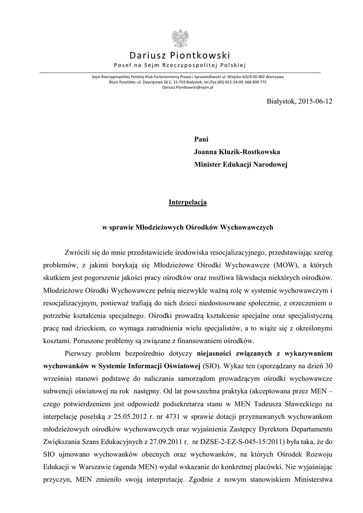 Dariusz Piontkowski Poseł na Sejm Rzeczypospolitej Polskiej Sejm Rzeczypospolitej Polskiej Klub Parlamentarny Prawo i Sprawiedliwość ul. Wiejska 4/6/8 00-902 Warszawa Biuro Poselskie: ul. Zwycięstwa 26 C, 15-703 Białystok, tel./fax (85) 652-24-09, 666 890 775 [email protected] Białystok, 2015-06-12 Pani Joanna Kluzik-Rostkowska Minister Edukacji Narodowej Interpelacja w sprawie Młodzieżowych Ośrodków Wychowawczych Zwrócili się do mnie przedstawiciele środowiska resocjalizacyjnego, przedstawiając szereg problemów, z jakimi borykają się Młodzieżowe Ośrodki Wychowawcze (MOW), a których skutkiem jest pogorszenie jakości pracy ośrodków oraz możliwa likwidacja niektórych ośrodków. Młodzieżowe Ośrodki Wychowawcze pełnią niezwykle ważną rolę w systemie wychowawczym i resocjalizacyjnym, ponieważ trafiają do nich dzieci niedostosowane społecznie, z orzeczeniem o potrzebie kształcenia specjalnego. Ośrodki prowadzą kształcenie specjalne oraz specjalistyczną pracę nad dzieckiem, co wymaga zatrudnienia wielu specjalistów, a to wiąże się z określonymi kosztami. Poruszone problemy są związane z finansowaniem ośrodków. Pierwszy problem bezpośrednio dotyczy niejasności związanych z wykazywaniem wychowanków w Systemie Informacji Oświatowej (SIO). Wykaz ten (sporządzany na dzień 30 września) stanowi podstawę do naliczania samorządom prowadzącym ośrodki wychowawcze subwencji oświatowej na rok następny. Od lat powszechna praktyka (akceptowana przez MEN – czego potwierdzeniem jest odpowiedź podsekretarza stanu w MEN Tadeusza Sławeckiego na interpelację poselską z 25.05.2012 r. nr 4731 w sprawie dotacji przyznawanych wychowankom młodzieżowych ośrodków wychowawczych oraz wyjaśnienia Zastępcy Dyrektora Departamentu Zwiększania Szans Edukacyjnych z 27.09.2011 r. nr DZSE-2-EZ-S-045-15/2011) była taka, że do SIO ujmowano wychowanków obecnych oraz wychowanków, na których Ośrodek Rozwoju Edukacji w Warszawie (agenda MEN) wydał wskazanie do konkretnej placówki. Nie wyjaśniając przyczyn, MEN zmieniło swoją interpretację. Zgodnie z nowym stanowiskiem Ministerstwa Dariusz Piontkowski Poseł na Sejm Rzeczypospolitej Polskiej Sejm Rzeczypospolitej Polskiej Klub Parlamentarny Prawo i Sprawiedliwość ul. Wiejska 4/6/8 00-902 Warszawa Biuro Poselskie: ul. Zwycięstwa 26 C, 15-703 Białystok, tel./fax (85) 652-24-09, 666 890 775 [email protected] należy wykazywać tylko i wyłącznie wychowanków doprowadzonych do placówki. Kwestia ta była jednym z tematów kontroli Urzędów Kontroli Skarbowej, które w bardzo wielu wypadkach zdecydowały o zwrocie przez samorządy (nienależnie – zdaniem kontrolujących) pobranych subwencji. Z informacji środowiska resocjalizacyjnego wynika, że żądanie zwrotu należności skierowano do około 90% placówek, a kwoty zwrotu wyliczone wraz z odsetkami dla poszczególnych ośrodków wynoszą nawet kilka milionów złotych. Taka sytuacja może doprowadzić do likwidacji niektórych placówek lub istotnego ograniczenia ich bieżącej działalności. Drugi problem, wskazany przez przedstawicieli środowiska resocjalizacyjnego, dotyczy obniżonej w rozporządzeniu MEN (w sprawie sposobu podziału części oświatowej subwencji ogólnej dla jednostek samorządu terytorialnego na rok 2015) wagi P 40 stosowanej przy obliczaniu subwencji na wychowanków MOW z 11 do 10. Ministerstwo w uzasadnieniu tego kroku powoływało się, na podstawie analizy danych z SIO, że i tak tylko część należnej MOW subwencji była przeznaczana przez jst na funkcjonowanie tych placówek. Argumentacja środowiska resocjalizacji nie została uwzględniona. Swoim działaniem MEN sprawiło, że pieniądze przekazywane przez samorządy na działalność MOW nie są wystarczające i nie pozwalają na pełną realizację zadań. Dochodzi do paradoksalnej sytuacji, iż postuluje się, aby podnosić jakość pracy placówek oraz efektywność oddziaływań resocjalizacyjnych, ale zupełnie nie uwzględnia się faktu, że wymaga to zatrudnienia odpowiednich specjalistów, a w konsekwencji zwiększonych środków finansowych. Z kolei z całą pewnością należy stwierdzić, że zmniejszenie wysokości subwencji może uniemożliwić skuteczną realizację działań wychowawczych i resocjalizacyjnych, a na pewno obniży ich poziom. Mając powyższe na uwadze, uprzejmie proszę o wyjaśnienie: 1. Ile działa w Polsce Młodzieżowych Ośrodków Wychowawczych i ilu skupiają one, łącznie, wychowanków? Jak wzrasta liczba wychowanków w okresie ostatnich 10 lat i czy baza odpowiada potrzebom? 2. Jakie przepisy regulują funkcjonowanie i finasowanie Młodzieżowych Ośrodków Wychowawczych? 3. Kiedy nastąpiła i z czego wynikała zmiana sposobu wykazywania wychowanków w Systemie Informacji Oświatowej (SIO)? Skoro powszechna praktyka (akceptowana przez MEN) była taka, że do SIO ujmowano wychowanków obecnych oraz Dariusz Piontkowski Poseł na Sejm Rzeczypospolitej Polskiej Sejm Rzeczypospolitej Polskiej Klub Parlamentarny Prawo i Sprawiedliwość ul. Wiejska 4/6/8 00-902 Warszawa Biuro Poselskie: ul. Zwycięstwa 26 C, 15-703 Białystok, tel./fax (85) 652-24-09, 666 890 775 [email protected] wychowanków, na których Ośrodek Rozwoju Edukacji w Warszawie wydał wskazanie do konkretnej placówki, to z jakiej przyczyny zmieniono tę zasadę? 4. Czym tłumaczyć fakt, że ogromna większość ośrodków podawała dane do SIO według starych zasad? Czy Pani Minister podziela pogląd Rzecznika Praw Dziecka, że w bardzo wielu przypadkach miało to charakter niezawiniony, spowodowany przyczynami obiektywnymi, które mogą m.in. wynikać ze znacznego skomplikowania przepisów regulujących naliczanie subwencji oraz z braku jednolitości systemu orzekania? 5. Czy o ww. zmianie interpretacyjnej zostały pisemnie poinformowane wszystkie jednostki, czy też, jak tłumaczą dyrektorzy, zmiana została jedynie upowszechniona podczas spotkań or