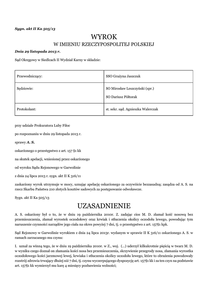 Sygn. akt II Ka 505/13 WYROK W IMIENIU RZECZYPOSPOLITEJ POLSKIEJ Dnia 29 listopada 2013 r. Sąd Okręgowy w Siedlcach II Wydział Karny w składzie: Przewodniczący: SSO Grażyna Jaszczuk Sędziowie: SO Mirosław Leszczyński (spr.) SO Dariusz Półtorak Protokolant: st. sekr. sąd. Agnieszka Walerczak przy udziale Prokuratora Luby Fiłoc po rozpoznaniu w dniu 29 listopada 2013 r. sprawy A. S. oskarżonego o przestępstwo z art. 157 §1 kk na skutek apelacji, wniesionej przez oskarżonego od wyroku Sądu Rejonowego w Garwolinie z dnia 24 lipca 2013 r. sygn. akt II K 316/11 zaskarżony wyrok utrzymuje w mocy, uznając apelację oskarżonego za oczywiście bezzasadną; zasądza od A. S. na rzecz Skarbu Państwa 210 złotych kosztów sadowych za postępowanie odwoławcze. Sygn. akt II Ka 505/13 UZASADNIENIE A. S. oskarżony był o to, że w dniu 19 października 2010r. Z. zadając cios M. D. złamał kość nosową bez przemieszczenia, złamał wyrostek oczodołowy oraz krwiak i stłuczenia okolicy oczodołu lewego, powodując tym naruszenie czynności narządów jego ciała na okres powyżej 7 dni, tj. o przestępstwo z art. 157§1 kpk. Sąd Rejonowy w Garwolinie wyrokiem z dnia 24 lipca 2013r. wydanym w sprawie II K 316/11 oskarżonego A. S. w ramach zarzucanego mu czynu: I. uznał za winną tego, że w dniu 19 października 2010r. w Z., woj. (...) uderzył kilkukrotnie pięścią w twarz M. D. w wyniku czego doznał on złamania kości nosa bez przemieszczenia, skrzywienie przegrody nosa, złamania wyrostka oczodołowego kości jarzmowej lewej, krwiaka i stłuczenia okolicy oczodołu lewego, które to obrażenia powodowały rozstrój zdrowia trwający dłużej niż 7 dni, tj. czynu wyczerpującego dyspozycję art. 157§1 kk i za ten czyn na podstawie art. 157§1 kk wymierzył mu karę 4 miesięcy pozbawienia wolności; II. na podstawie art. 69§1 i 2 kk i art. 70§1 pkt 1 kk wykonanie orzeczonej wobec oskarżonego kary pozbawienia wolności warunkowo zawiesił na okres 2 lat tytułem próby; III. na podstawie art. 71§1 kk wymierzył oskarżonemu karę grzywny w kwocie 70 stawek dziennych ustalając wysokość stawki dziennej na kwotę 10 zł; IV. na podstawie art. 46§1 kk orzekł od oskarżonego A. S. na rzecz pokrzywdzonego M. D. zam. ul. (...) (...)-(...) M. kwotę 2664 zł tytułem obowiązku całkowitego naprawienia szkody oraz kwotę 3.000 zł tytułem zadośćuczynienia; V. zasądził od oskarżonego na rzecz Skarbu Państwa kwotę (...),78 w tym 120 zł opłaty, tytułem kosztów sądowych. Apelację od tego wyroku złożył oskarżony A. S.. Na mocy art. 444 kpk i art. 425 kpk zaskarżył powyższy wyrok w całości na swoją korzyść. Na podstawie art. 427§1 i 2 kpk oraz art. 438 pkt 2, 3 i 4 kpk zaskarżonemu wyrokowi zarzucił: I/ naruszenie przepisów postępowania, tj. art. 2 w zw. art. 170 kpk i art. 366 § 1 kpk, art. 4 w zw. art. 170 kpk i w zw. z art. 366 § 1 kpk, art. 5 § 2 kpk, art. 7 kpk w zw. art. 424 § 1 pkt 1 kpk, art. 193 § 1 kpk, poprzez: - rozstrzygnięcie istniejących w sprawie i niedających się usunąć wątpliwości na niekorzyść oskarżonego; - wybiórcze i jednostronne uwzględnienie twierdzeń z opinii biegłych sądowych, opierając się wyłącznie na przyjętym przez siebie, bez żadnego uzasadnienia, bezgranicznym daniu wiary "konsekwentnym i do tego ze świadomością grożącej mu za zaznawanie niezgodne z prawdą odpowiedzialności karnej zeznaniom pokrzywdzonego"; - oddalenie wniosków dowodowych oskarżonego wbrew ustawowym przesłankom i nieprzeprowadzenie ich "wobec braku obiektywnych podstaw do zakwestionowania wiarygodności zeznań M. D."; - niestosowanie zasady bezstronności, według której, prowadzący postępowanie karne powinien ulegać w całym jego toku imperatywowi niezachwianego obiektywizmu oraz "uwzględnianiu" wszelkich okoliczności sprawy, czego Sąd zaniechał, nie odnosząc się do opinii obu biegłych w kwestii niemożności ustalenia przyczyny wystąpienia u pokrzywdzonego skrzywienia przegrody nosa na podstawie istniejących dowodów a także pominięciu sugerowanego przez biegłego sposobu, uznając zeznania pokrzywdzonego za wystarczające w tym zakresie; II/ wynikający z powyższych naruszeń błąd w ustaleniach faktycznych przyjętych za podstawę orzeczenia, który miał wpływ na treść wydanego orzeczenia, a polegający na przyjęciu, iż na A. S. wskutek uderzenia pięścią w twarz M. D. spowodował u niego skrzywienie przegrody nosa, a tym samym konieczność przeprowadzenia zabiegu operacyjnego, podczas gdy zarówno biegły specjalista chirurgii stomatologicznej i szczękowo-twarzowej dr hab. n. med. M. R. nie był w stanie ,jednoznacznie ocenić, czy skrzywienie to miało charakter pourazowy czy było związane z wcześniej obecną wadą, a także czy było wynikiem urazu doznanego w trakcie zajścia 19.10.2010 czy tez wcześniejszych" u pokrzywdzonego oraz, że "stwierdzone u poszkodowanego skrzywienie przegrody nosa pozostaje kwestią dyskusyjną" jak i biegły sądowy z zakresu chirurgii ogólnej zajął identyczne stanowisko; III/ rażącą surowość orzeczonego na podstawie art. 46 § 1 k.k. na rzecz M. D. obowiązku całkowitego naprawienia szkody w kwocie 2.664, w przypadku gdy zdecydowaną większość tej sumy stanowi koszt zabiegu operacyjnego, dotyczącego skrzywienia przegrody nosowej oraz koszt związanej z nim konieczności wyleczenia chorych zębów pokrzywdzonego, celem wykonania zabiegu, a także orzeczonej kwoty 3000 zł tytułem zadośćuczynienia za "ból i cierpienia, w tym również na skutek przebytej operacji przegrody nosa", a także biorąc pod uwagę fakt, iż oskarżony od początku procesu dążącą do pojednania się z pokrzywdzonym i zrekompensowania mu powstałej szkody poprzez zapłatę określonej kwoty pieniężnej. Podnosząc powyższe zarzuty, wnosił o zmianę zaskarżonego wyroku poprzez modyfikację i wyeliminowanie z opisu czynu przypisanego oskarżonem