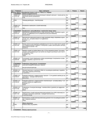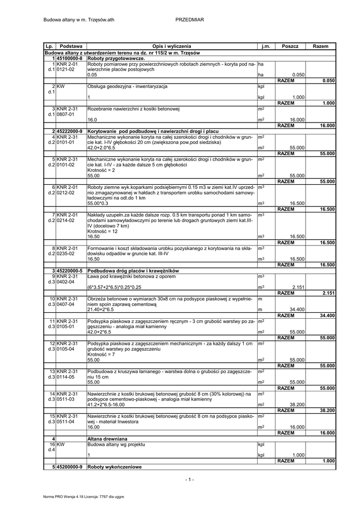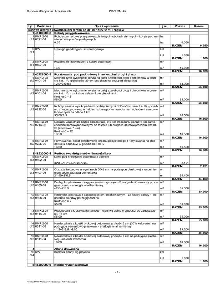 Budowa altany w m. Trzęsów.ath PRZEDMIAR Lp. Podstawa Opis i wyliczenia j.m. Budowa altany z utwardzeniem terenu na dz. nr 115/2 w m. Trzęsów 1 45100000-8 Roboty przygotowawcze. 1 KNR 2-01 Roboty pomiarowe przy powierzchniowych robotach ziemnych - koryta pod na- ha d.1 0121-02 wierzchnie placów postojowych 0.05 ha 2 KW d.1 3 KNR 2-31 d.1 0807-01 2 45222000-9 4 KNR 2-31 d.2 0101-01 5 KNR 2-31 d.2 0101-02 6 KNR 2-01 d.2 0212-02 7 KNR 2-01 d.2 0214-02 8 KNR 2-01 d.2 0235-02 3 45220000-5 9 KNR 2-31 d.3 0402-04 10 KNR 2-31 d.3 0407-04 11 KNR 2-31 d.3 0105-01 12 KNR 2-31 d.3 0105-04 13 KNR 2-31 d.3 0114-05 14 KNR 2-31 d.3 0511-03 15 KNR 2-31 d.3 0511-04 4 16 KW d.4 5 45200000-9 Obsługa geodezyjna - inwentaryzacja kpl 1 kpl Rozebranie nawierzchni z kostki betonowej m2 16.0 m2 Korytowanie pod podbudowę i nawierzchni drogi i placu Mechaniczne wykonanie koryta na całej szerokości drogi i chodników w gruncie kat. I-IV głębokości 20 cm (zwiększona pow,pod siedziska) 42.0+2.0*6.5 Mechaniczne wykonanie koryta na całej szerokości drogi i chodników w gruncie kat. I-IV - za kaŜde dalsze 5 cm głębokości Krotność = 2 55.00 m2 m2 m3 Formowanie i koszt składowania urobku pozyskanego z korytowania na składowisku odpadów w gruncie kat. III-IV 16.50 m3 m3 m3 Podbudowa dróg placów i krawęŜników Ława pod krawęŜniki betonowa z oporem m3 (6*3.57+2*6.5)*0.25*0.25 m3 ObrzeŜa betonowe o wymiarach 30x8 cm na podsypce piaskowej z wypełnieniem spoin zaprawą cementową 21.40+2*6.5 m m Podsypka piaskowa z zagęszczeniem ręcznym - 3 cm grubość warstwy po za- m2 gęszczeniu - analogia miał kamienny 42.0+2*6.5 m2 Podsypka piaskowa z zagęszczeniem mechanicznym - za kaŜdy dalszy 1 cm grubość warstwy po zagęszczeniu Krotność = 7 55.00 m2 Podbudowa z kruszywa łamanego - warstwa dolna o grubości po zagęszczeniu 15 cm 55.00 m2 Nawierzchnie z kostki brukowej betonowej grubość 8 cm (30% kolorowej) na podsypce cementowo-piaskowej - analogia miał kamienny 41.2+2*6.5-16.00 m2 m2 m2 m2 Nawierzchnie z kostki brukowej betonowej grubość 8 cm na podsypce piasko- m2 wej - materiał Inwestora 16.00 m2 Altana drewniana Budowa altany wg projektu kpl 1 kpl Norma PRO Wersja 4.18 Licencja: 7767 dla uggre 0.050 RAZEM 0.050 1.000 RAZEM 1.000 16.000 RAZEM 16.000 55.000 RAZEM 55.000 55.000 RAZEM 55.000 16.500 RAZEM 16.500 16.500 RAZEM 16.500 16.500 RAZEM 16.500 2.151 RAZEM 2.151 34.400 RAZEM 34.400 55.000 RAZEM 55.000 55.000 RAZEM 55.000 55.000 RAZEM 55.000 38.200 RAZEM 38.200 16.000 RAZEM 16.000 1.000 RAZEM 1.000 m2 Nakłady uzupełn.za kaŜde dalsze rozp. 0.5 km transportu ponad 1 km samochodami samowyładowczymi po terenie lub drogach gruntowych ziemi kat.IIIIV (docelowo 7 km) Krotność = 12 16.50 -1- Razem m2 Roboty ziemne wyk.koparkami podsiębiernymi 0.15 m3 w ziemi kat.IV uprzed- m3 nio zmagazynowanej w hałdach z transportem urobku samochodami samowyładowczymi na odl.do 1 km 55.00*0.3 m3 Roboty wykończeniowe Poszcz Budowa altany w m. Trzęsów.ath Lp. Podstawa 17 KNR 2-21 d.5 0218-02 18 KNR 2-21 d.5 0401-05 PRZEDMIAR Opis i wyliczenia Rozścielenie ziemi urodzajnej ręczne z transportem taczkami na terenie płaskim z odkładu 22*1.0*0.15 j.m. m3 Wykonanie trawników dywanowych siewem na gruncie kat. III z nawoŜeniem m2 30.0*1.00 m2 -2- Norma PRO Wersja 4.18 Licencja: 7767 dla uggre m3 Poszcz Razem 3.300 RAZEM 3.300 30.000 RAZEM 30.000