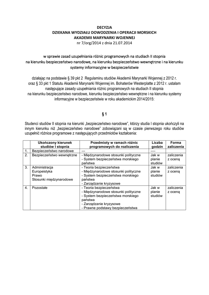 DECYZJA DZIEKANA WYDZIAŁU DOWODZENIA I OPERACJI MORSKICH AKADEMII MARYNARKI WOJENNEJ nr 7/org/2014 z dnia 21.07.2014 w sprawie zasad uzupełniania różnic programowych na studiach II stopnia na kierunku bezpieczeństwo narodowe, na kierunku bezpieczeństwo wewnętrzne i na kierunku systemy informacyjne w bezpieczeństwie działając na podstawie § 39 pkt 2 Regulaminu studiów Akademii Marynarki Wojennej z 2012 r. oraz § 33 pkt 1 Statutu Akademii Marynarki Wojennej im. Bohaterów Westerplatte z 2012 r. ustalam następujące zasady uzupełniania różnic programowych na studiach II stopnia na kierunku bezpieczeństwo narodowe, kierunku bezpieczeństwo wewnętrzne i na kierunku systemy informacyjne w bezpieczeństwie w roku akademickim 2014/2015: §1 Studenci studiów II stopnia na kierunki „bezpieczeństwo narodowe”, którzy studia I stopnia ukończyli na innym kierunku niż „bezpieczeństwo narodowe” zobowiązani są w czasie pierwszego roku studiów uzupełnić różnice programowe z następujących przedmiotów kształcenia: 1. 2. Ukończony kierunek studiów I stopnia Bezpieczeństwo narodowe Bezpieczeństwo wewnętrzne 3. Administracja Europeistyka Prawo Stosunki międzynarodowe 4. Pozostałe Przedmioty w ramach różnic programowych do rozliczenia --- Międzynarodowe stosunki polityczne - System bezpieczeństwa morskiego państwa - Teoria bezpieczeństwa - Międzynarodowe stosunki polityczne - System bezpieczeństwa morskiego państwa - Zarządzanie kryzysowe - Teoria bezpieczeństwa - Międzynarodowe stosunki polityczne - System bezpieczeństwa morskiego państwa - Zarządzanie kryzysowe - Prawne podstawy bezpieczeństwa Liczba godzin ---Jak w planie studiów Jak w planie studiów Forma zaliczenia Jak w planie studiów zaliczenia z oceną zaliczenia z oceną zaliczenia z oceną §2 Studenci studiów II stopnia na kierunku „bezpieczeństwo wewnętrzne”, którzy studia I stopnia ukończyli na innym kierunku niż „bezpieczeństwo wewnętrzne” zobowiązani są w czasie pierwszego roku studiów uzupełnić różnice programowe z następujących przedmiotów kształcenia: 1. 2. Ukończony kierunek studiów I stopnia Bezpieczeństwo wewnętrzne Bezpieczeństwo narodowe 3. Administracja Europeistyka Prawo Stosunki międzynarodowe 4. Pozostałe Przedmioty w ramach różnic programowych do rozliczenia --- Bezpieczeństwo społeczne - Ochrona osób, mienia, obiektów i obszarów - Bezpieczeństwo społeczne - Bezpieczeństwo społeczności lokalnych i kształtowanie bezpiecznych przestrzeni - Ochrona osób, mienia, obiektów i obszarów - Organizacja i zarządzanie - Bezpieczeństwo społeczne - Bezpieczeństwo społeczności lokalnych i kształtowanie bezpiecznych przestrzeni - Ochrona osób, mienia, obiektów i obszarów - Organizacja i zarządzanie - Zarządzanie w sytuacjach kryzysowych Liczba godzin ---Jak w planie studiów Jak w planie studiów Forma zaliczenia Jak w planie studiów zaliczenia z oceną zaliczenia z oceną zaliczenia z oceną §3 Studenci studiów II stopnia na kierunku „systemy informacyjne w bezpieczeństwie”, którzy studia I stopnia ukończyli na innym kierunku niż „systemy informacyjne w bezpieczeństwie” zobowiązani są w czasie pierwszego roku studiów uzupełnić różnice programowe z następujących przedmiotów kształcenia: 1. 2. Ukończony kierunek studiów I stopnia Systemy informacyjne w bezpieczeństwie Bezpieczeństwo wewnętrzne 3. Bezpieczeństwo narodowe 4. Pozostałe Przedmioty w ramach różnic programowych do rozliczenia --- Komputerowe prawo karne - Ochrona danych osobowych i informacji niejawnych - Komputerowe prawo karne - Ochrona danych osobowych i informacji niejawnych - Bezpieczeństwo społeczności lokalnych i kształtowanie bezpiecznych przestrzeni - Organizacja i zarządzanie - Komputerowe prawo karne Liczba godzin ---- Forma zaliczenia Jak w planie studiów Jak w planie studiów Jak w planie studiów zaliczenia z oceną zaliczenia z oceną zaliczenia z oceną §4 1. Zaliczenie przedmiotu w ramach różnic programowych odnotowuje się w protokole zaliczeniowym, indeksie studenta oraz indywidualnej karcie różnic programowych. 2. Oceny z zaliczenia przedmiotów w ramach różnic programowych nie są wliczane do średniej ocen studiów II stopnia. 3. Studenci obowiązani są do 31 października 2014 r. pobrać z dziekanatu indywidualną kartę różnic programowych. 4. Brak zaliczenia przedmiotów w ramach różnic programowych do dnia 26 czerwca 2015 r. może być podstawą skreślenia studenta z listy studentów w związku z brakiem postępów w nauce. Dziekan Wydziału Dowodzenia i Operacji Morskich AMW kmdr prof. dr hab. Tomasz Szubrycht
