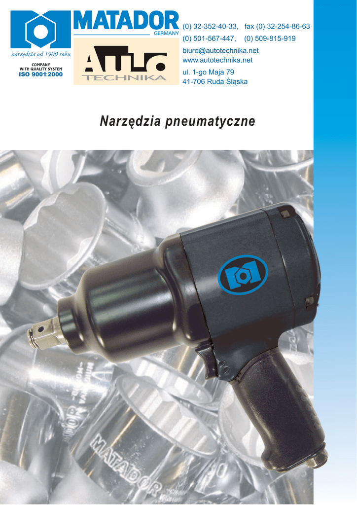 (0) 32-352-40-33, fax (0) 32-254-86-63 (0) 501-567-447, narzędzia od 1900 roku ISO 9001:2000 (0) 509-815-919 [email protected] www.autotechnika.net ul. 1-go Maja 79 41-706 Ruda Śląska Narzędzia pneumatyczne Narzędzia pneumatyczne Nowa seria narzędzi pneumatycznych w ofercie firmy Matador. Najwyższą jakość osiągnięto poprzez zastosowanie doskonałej technologii: Podwójny system udaru (TWIN HAMMER) z nowo opracowanym elementem napędzającym Twin-Line. System tworzy bardzo duży moment luzujący już przy pierwszych obrotach silnika. System TWIN-LINE Niezawodna konstrukcja składająca się z niewielkiej liczby elementów. Smarowanie przy pomocy specjalnej smarownicy odbywa się za pomocą złączki w obudowie. System Twin-Line został zaprojektowany dla osiągnięcia najwyższej wydajności na potrzeby przemysłu oraz w intensywnych zastosowaniach warsztatowych i montażowych. Firma Matador jest renomowanym producentem narzędzi z ponad 100 letnią tradycją. Produkuje m. in. narzędzia OEM i specjalistyczne dla fabryk Mercedesa, BMW, VW, Audi, MAN... Jako jeden z dwóch producentów narzędzi Matador posiada dopuszczenie do serwisów autoryzowanych Mercedes-Benz. Narzędzia Matador są znane i kupowane w 90 krajach. Jest jednym z nielicznych producentów posiadających fabrykę w Europie (na terenie Niemiec). Klucz pneumatyczny 1/2” ECO - Technologia TWIN HAMMER - Bardzo niski poziom hałasu - tylko 75 dB (A) - Uchwyt izolujący od zimna, małe wibracje Dane techniczne Prędkość robocza 6500 obr/min Roboczy moment obrotowy 580 Nm Maksymalny moment obrotowy 600 Nm Wlot powietrza 1/4” Średnie zużycie powietrza 90 l/min Głośność 75 dB (A) Ciśnienie robocze 6,3 bar Waga 2,1 kg 580 Nm, 75 dB (A) Nr katalogowy: 7000 00 01 Klucz pneumatyczny 1/2” Profi - Technologia TWIN HAMMER - Bardzo lekka konstrukcja - Uchwyt izolujący od zimna, małe wibracje - Wysoka wydajność Dane techniczne Prędkość robocza Roboczy moment obrotowy 8000 obr/min 900 Nm Maksymalny moment obrotowy 1290 Nm Wlot powietrza 1/4” Średnie zużycie powietrza 113 l/min Głośność 95/104 dB (A) Ciśnienie robocze 6,3 bar Waga 2,2 kg 1290 Nm Nr katalogowy: 7000 00 02 Klucz pneumatyczny 3/4” PRO - Bardzo wysoka wydajność - Odporna konstrukcja - Uchwyt izolujący od zimna, małe wibracje Dane techniczne Prędkość robocza 4000 obr/min Roboczy moment obrotowy 1350 Nm Maksymalny moment obrotowy 1600 Nm Wlot powietrza 1/4” Średnie zużycie powietrza 105 l/min Głośność 94/106 dB (A) Ciśnienie robocze 6,3 bar Waga 5,3 kg 1600 Nm Nr katalogowy: 7000 00 03