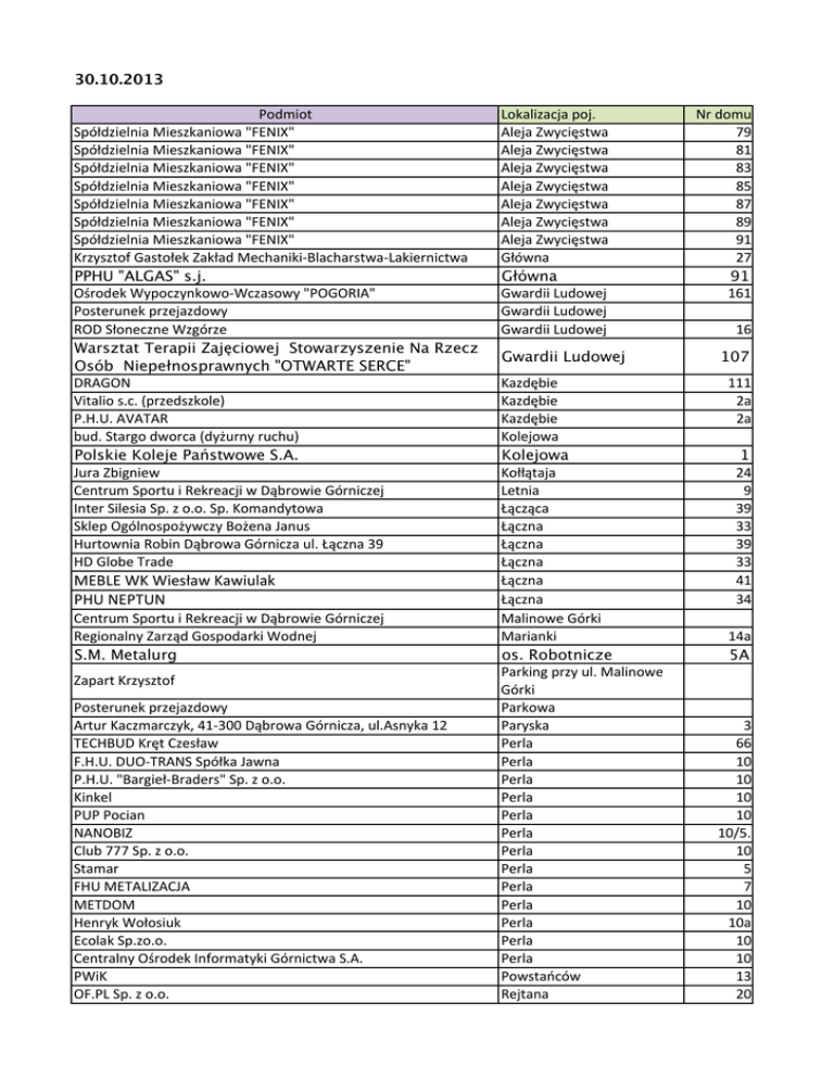 30.10.2013 Podmiot Spółdzielnia Mieszkaniowa "FENIX" Spółdzielnia Mieszkaniowa "FENIX" Spółdzielnia Mieszkaniowa "FENIX" Spółdzielnia Mieszkaniowa "FENIX" Spółdzielnia Mieszkaniowa "FENIX" Spółdzielnia Mieszkaniowa "FENIX" Spółdzielnia Mieszkaniowa "FENIX" Krzysztof Gastołek Zakład Mechaniki-‐Blacharstwa-‐Lakiernictwa PPHU "ALGAS" s.j. Ośrodek Wypoczynkowo-‐Wczasowy "POGORIA" Posterunek przejazdowy ROD Słoneczne Wzgórze Warsztat Terapii Zajęciowej Stowarzyszenie Na Rzecz Osób Niepełnosprawnych "OTWARTE SERCE" DRAGON Vitalio s.c. (przedszkole) P.H.U. AVATAR bud. Stargo dworca (dyżurny ruchu) Polskie Koleje Państwowe S.A. Jura Zbigniew Centrum Sportu i Rekreacji w Dąbrowie Górniczej Inter Silesia Sp. z o.o. Sp. Komandytowa Sklep Ogólnospożywczy Bożena Janus Hurtownia Robin Dąbrowa Górnicza ul. Łączna 39 HD Globe Trade MEBLE WK Wiesław Kawiulak PHU NEPTUN Centrum Sportu i Rekreacji w Dąbrowie Górniczej Regionalny Zarząd Gospodarki Wodnej S.M. Metalurg Zapart Krzysztof Posterunek przejazdowy Artur Kaczmarczyk, 41-‐300 Dąbrowa Górnicza, ul.Asnyka 12 TECHBUD Kręt Czesław F.H.U. DUO-‐TRANS Spółka Jawna P.H.U. "Bargieł-‐Braders" Sp. z o.o. Kinkel PUP Pocian NANOBIZ Club 777 Sp. z o.o. Stamar FHU METALIZACJA METDOM Henryk Wołosiuk Ecolak Sp.zo.o. Centralny Ośrodek Informatyki Górnictwa S.A. PWiK OF.PL Sp. z o.o. Lokalizacja poj. Aleja Zwycięstwa Aleja Zwycięstwa Aleja Zwycięstwa Aleja Zwycięstwa Aleja Zwycięstwa Aleja Zwycięstwa Aleja Zwycięstwa Główna Główna Gwardii Ludowej Gwardii Ludowej Gwardii Ludowej Gwardii Ludowej Kazdębie Kazdębie Kazdębie Kolejowa Kolejowa Kołłątaja Letnia Łącząca Łączna Łączna Łączna Łączna Łączna Malinowe Górki Marianki os. Robotnicze Parking przy ul. Malinowe Górki Parkowa Paryska Perla Perla Perla Perla Perla Perla Perla Perla Perla Perla Perla Perla Perla Powstańców Rejtana Nr domu 79 81 83 85 87 89 91 27 91 161 16 107 111 2a 2a 1 24 9 39 33 39 33 41 34 14a 5A 3 66 10 10 10 10 10/5. 10 5 7 10 10a 10 10 13 20 P.H. "IWINA" Iwona Szelęgiewicz Usługi Cateringowe Skalskiego MediaTec Skalskiego SM LOKATOR AOM Łęknice MAXIM Marek Wawer HURT_DETAL Art.. Spożywcze i przemysłowe Jerzy Wacławiak PIEKARNIA Maria Czech, Robert Czech, Dorota Jamróz; 41-‐300 Dąbrowa Górnicza, ul.Twarda 11 Posterunek przejazdowy Pielka Jan FH Kier E.K. Surf Edward Kaleta Jacht Klub Pogoria III Topolowa Topolowa Twarda 40 Sklep pana Włodarcz yka 50a 48 5 Twarda 11 Urbańskiego Zakątek Zakładowa Zakładowa Zakładowa 35 23 11 9 31.10.2013 Podmiot Cecylia Kosiec-‐ administrator SM Metalurg Dariusz Jędryczka Tomasz Karnia GEERS Akustyka Słuchu Sp. z o.o. F.H.U. MI-‐HA-‐MA Halina Wasilewska Przeździak Jerzy Wyższa Szkoła Biznesu Lokalizacja poj. 3 maja Augustynika Augustynika Bandrowskiego Bandrowskiego Bandrowskiego Cieplaka Cieplaka Zespół Szkół Muzycznych im Michała Spisaka w Dąbrowie Górniczej Dąbskiego PGNiG SPV4 Centrum Zarządzania Nieruchomościami MZUM (Urząd Miasta) Zakład Robót i Usług Specjalistycznych ZRUS FAVOR Agencja Finansowa Zakład Elektromechaniki Dźwigowej "KOMED" Firma Handlowa ANIX II MIKO-‐TECH Sp.zo.o. nastawnia DGP Polskie Koleje Państwowe S.A. Przedsiebiorstwo Przerobu i Obrotu Złomem Metali HK-‐Cutiron" Sp. z o.o. Łysek Zbgniew Telekomunikacja Polska Administracja Utrzymanie i Techniczna Obsługa Nieruchomości Ogródki działkowe Posterunek przejazdowy Centrum Sportu i Rekreacji w Dąbrowie Górniczej SM Metalurg ul. Ks. Augustynika 17a GONDOLA Cecylia Bicz I Liceum Ogólnokształcące im. W. Łukasińskiego Europejski Instytut Szkoleniowy Przedszkole nr. 20 Folwarczna Graniczna Graniczna Graniczna Graniczna Graniczna Graniczna Jasna Jasna Jasna Nr domu 4 13 14 1a 3A 3 22 1c 17 21a 12 21 10 49 8 87A 54 60 Jasna 54 Jasna 65 Konopnickiej 1 Konopnickiej Konopnickiej Konopnickiej Konopnickiej Kopernika Kopernika Korzeniec Krasickiego 29 30 3 40 11 1 Paradigma P.W. Izoterm WSPÓLNOTA MIESZKANIOWA Techniczne Zakłady Naukowe SM Metalurg ul. Ks. Augustynika 17a SM Metalurg ul. Ks. Augustynika 17a Firma Royal PUP ZUH PARTNER -NIERUCHOMOŚCI "Solutions" Sp.zo.o. Spółka Komandytowa Dzienny Dom Pomocy Społecznej Środowiskowy Dom Samopomocy NZOZ DUOMEDIC Firma Handlowo-‐Usługowa Marek Kazimierz McDonald Krzysztof Szmigul AGD Elektronarzędzia Aneta i Romasz Krawczyk PHU "ROBICO" Robert Drąg PHU Jolbro Polskie Koleje Państwowe S.A. Oddział Gospodarowania Nieruchomościami Bar Piwny "EDEN" Stowarzyszenie Kupców Targowych APM CENTRE Projekt 28 Sp.zo.o. PHU "ROBICO" Robert Drąg Spółdzielnia Mieszkaniowa "LOKATOR" Administracja nr 4 Spółdzielnia Mieszkaniowa "LOKATOR" Administracja nr 4 SM Metalurg ul. Ks. Augustynika 17a Biuro Rachunkowe Wn-‐Ma Bożena Urbańska Zygmunt Gracha WSPÓLNOTA MIESZKANIOWA Przedszkole nr 14 Wojewódzki Ośrodek Ruchu Drogowego w Katowicach Tomasik Tadeusz ul.Leśna 31 KS ZAGŁĘBIAK Aspharma sp. z o. o. Pijalnia piwa Hasjenda Dromar Miejski Zarząd Budynków Mieszkalnych Przedszkole Nr 36 AUTO-‐KAR Grzegorz Karwowski, 41-‐300 Dąbrowa Górnicza, ul.Buczka 2 Firma Handlowo -‐ Usługowa "Gołonożanka" LOKATOR AOM 6 Polski Związek Działkowców Zarząd Rodzinnego Ogrodu Działkowego im. "Braci Lipskich" Budeks Firma Remontowo Budowlana Jan Dziuba Miejska Biblioteka Publiczna Filia Nr 3 Apteka Mandragora Agencja Handlowa Superstacja GUHRING Sp.zo.o. MZUM.PL S.A. P.R.I. "Boszko-‐Kozubski" Sp.zo.o. S.k. Kruczkowskiego Łańcuckiego Łańcuckiego Łańcuckiego Mickiewicza Mickiewicza Mickiewicza 27 10A 20 10 25 21 47 Mickiewicza 27 Morcinka Morcinka Morcinka Morcinka/róg Piłsudskiego Niemcewicza Orzeszkowej Plac Wolności PLAC WOLNOŚCI 15 15 31 12C 16 1 Poniatowskiego 10 Poniatowskiego Poniatowskiego Poniatowskiego Poniatowskiego Prusa Sobieskiego Sobieskiego Stara Stara Traugutta Traugutta Tysiąclecia Tysiąclecia Tysiąclecia Tysiąclecia Tysiąclecia Tysiąclecia Tysiąclecia Tysiąclecia Tysiącle