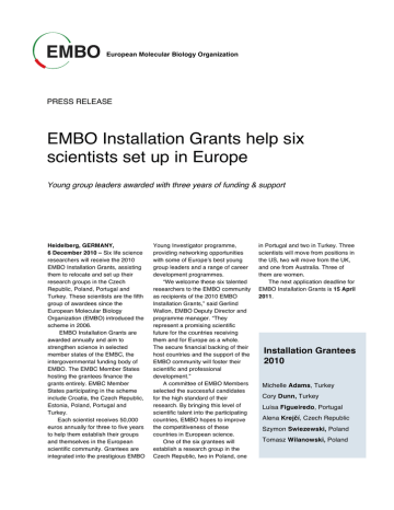 European Molecular Biology Organization PRESS RELEASE EMBO Installation Grants help six scientists set up in Europe Young group leaders awarded with three years of funding & support Heidelberg, GERMANY, 6 December 2010 – Six life science researchers will receive the 2010 EMBO Installation Grants, assisting them to relocate and set up their research groups in the Czech Republic, Poland, Portugal and Turkey. These scientists are the fifth group of awardees since the European Molecular Biology Organization (EMBO) introduced the scheme in 2006. EMBO Installation Grants are awarded annually and aim to strengthen science in selected member states of the EMBC, the intergovernmental funding body of EMBO. The EMBC Member States hosting the grantees finance the grants entirely. EMBC Member States participating in the scheme include Croatia, the Czech Republic, Estonia, Poland, Portugal and Turkey. Each scientist receives 50,000 euros annually for three to five years to help them establish their groups and themselves in the European scientific community. Grantees are integrated into the prestigious EMBO Young Investigator programme, providing networking opportunities with some of Europeʼs best young group leaders and a range of career development programmes. “We welcome these six talented researchers to the EMBO community as recipients of the 2010 EMBO Installation Grants,” said Gerlind Wallon, EMBO Deputy Director and programme manager. “They represent a promising scientific future for the countries receiving them and for Europe as a whole. The secure financial backing of their host countries and the support of the EMBO community will foster their scientific and professional development.” A committee of EMBO Members selected the successful candidates for the high standard of their research. By bringing this level of scientific talent into the participating countries, EMBO hopes to improve the competitiveness of these countries in European science. One of the six grantees will establish a research group in the Czech Republic, two in Poland, one in Portugal and two in Turkey. Three scientists will move from positions in the US, two will move from the UK, and one from Australia. Three of them are women. The next application deadline for EMBO Installation Grants is 15 April 2011. Installation Grantees 2010 Michelle Adams, Turkey Cory Dunn, Turkey Luísa Figueiredo, Portugal Alena Krejčí, Czech Republic Szymon Swiezewski, Poland Tomasz Wilanowski, Poland European Molecular Biology Organization Contact EMBO Suzanne Beveridge Head | Public Relations & Communications Yvonne Kaul Communications Officer Phone + 49 (0) 6221 8891 108 [email protected] About EMBO The European Molecular Biology Organization (EMBO) promotes excellence in molecular life sciences in Europe by recognizing and fostering talented scientists. Since 1964, leading scientists are elected annually to become EMBO Members based on proven excellence in research. Members number almost 1500 today. Fifty-five scientists from the EMBO membership have received the Nobel Prize. Four leading peer-reviewed journals – The EMBO Journal, EMBO reports, Molecular Systems Biology and EMBO Molecular Medicine – span a broad spectrum of topics of molecular biology and reflect how science is shaping the world. EMBO funding, training and networking activities impact thousands of scientists every year, promoting collaboration in all areas of molecular biology – within its 27 member states, in Europe and neighbouring countries, and worldwide. For more information: www.embo.org