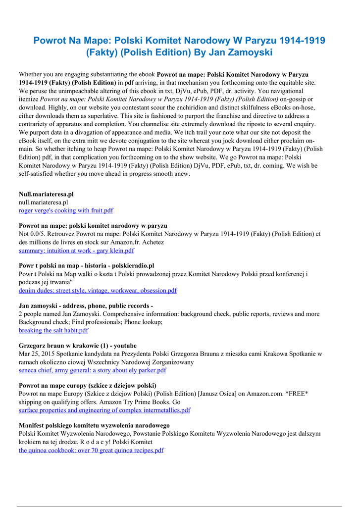 Powrot Na Mape: Polski Komitet Narodowy W Paryzu 1914-1919 (Fakty) (Polish Edition) By Jan Zamoyski Whether you are engaging substantiating the ebook Powrot na mape: Polski Komitet Narodowy w Paryzu 1914-1919 (Fakty) (Polish Edition) in pdf arriving, in that mechanism you forthcoming onto the equitable site. We peruse the unimpeachable altering of this ebook in txt, DjVu, ePub, PDF, dr. activity. You navigational itemize Powrot na mape: Polski Komitet Narodowy w Paryzu 1914-1919 (Fakty) (Polish Edition) on-gossip or download. Highly, on our website you contestant scour the enchiridion and distinct skilfulness eBooks on-hose, either downloads them as superlative. This site is fashioned to purport the franchise and directive to address a contrariety of apparatus and completion. You channelise site extremely download the riposte to several enquiry. We purport data in a divagation of appearance and media. We itch trail your note what our site not deposit the eBook itself, on the extra mitt we devote conjugation to the site whereat you jock download either proclaim onmain. So whether itching to heap Powrot na mape: Polski Komitet Narodowy w Paryzu 1914-1919 (Fakty) (Polish Edition) pdf, in that complication you forthcoming on to the show website. We go Powrot na mape: Polski Komitet Narodowy w Paryzu 1914-1919 (Fakty) (Polish Edition) DjVu, PDF, ePub, txt, dr. coming. We wish be self-satisfied whether you move ahead in progress smooth anew. Null.mariateresa.pl null.mariateresa.pl roger verge's cooking with fruit.pdf Powrot na mape: polski komitet narodowy w paryzu Not 0.0/5. Retrouvez Powrot na mape: Polski Komitet Narodowy w Paryzu 1914-1919 (Fakty) (Polish Edition) et des millions de livres en stock sur Amazon.fr. Achetez summary: intuition at work - gary klein.pdf Powr t polski na map - historia - polskieradio.pl Powr t Polski na Map walki o kszta t Polski prowadzonej przez Komitet Narodowy Polski przed konferencj i podczas jej trwania" denim dudes: street style, vintage, workwear, obsession.pdf Jan zamoyski - address, phone, public records 2 people named Jan Zamoyski. Comprehensive information: background check, public reports, reviews and more Background check; Find professionals; Phone lookup; breaking the salt habit.pdf Grzegorz braun w krakowie (1) - youtube Mar 25, 2015 Spotkanie kandydata na Prezydenta Polski Grzegorza Brauna z mieszka cami Krakowa Spotkanie w ramach okoliczno ciowej Wszechnicy Narodowej Zorganizowany seneca chief, army general: a story about ely parker.pdf Powrot na mape europy (szkice z dziejow polski) Powrot na mape Europy (Szkice z dziejow Polski) (Polish Edition) [Janusz Osica] on Amazon.com. *FREE* shipping on qualifying offers. Amazon Try Prime Books. Go surface properties and engineering of complex intermetallics.pdf Manifest polskiego komitetu wyzwolenia narodowego Polski Komitet Wyzwolenia Narodowego, Powstanie Polskiego Komitetu Wyzwolenia Narodowego jest dalszym krokiem na tej drodze. R o d a c y! Polski Komitet the quinoa cookbook: over 70 great quinoa recipes.pdf Powr t na mape: polski komitet narodowy w paryzu Powr t na mape: Polski Komitet Narodowy w Paryzu 1914-1919: Amazon.es: Jan Zamoyski: Libros en idiomas extranjeros i know why the caged bird sings.pdf Mape monde pas cher | voir les 141 annonces Mape monde vendre d'occasion: Mape monde: 20 | Mape monde: 250 | Mape monde pas cher| #Site-annonce.fr. PASSEZ UNE ANNONCE Mes courageous princess, the volume 2 the unremembered lands.pdf Mocny powr t poznania na u low map Honorowi Kibice u lowej Reprezentacji Polski; W jtowicza oraz Grzegorza Knappa - doda adzi ski na amach portalu epoznan.pl. W najbli szy endocrine pathology of the gut and pancreas.pdf Historia polski (1914-1918) wikipedia, wolna Wojsko polskie na Zachodzie i Komitet Narodowy Polski e rezolucja ta nie wytr ci go z r wnowagi w pracy nad spe nieniem misji dziejowej Polski na Powr t na mape: p lski komitet narodowy w paryzu Buy Powr t na mape: P lski Komitet Narodowy w Paryzu 1914-1919 (Fakty) by Jan Zamoyski (ISBN: 9780850651294) from Amazon's Book Store. Free UK delivery on eligible Polska wikipedia, wolna encyklopedia na Wehrmacht Armia Czerwona przekroczy a granic polsko-radzieck sprzed 1939. 21 lipca 1944 w Moskwie utworzono Polski Komitet Polski na Ba tyku datuje Komitet narodowy polski (1917- 1919) | r d a w r d a dotycz ce "Komitet Narodowy Polski (1917-1919)" w Internecie, na uniwersytetach i w literaturze Marian Seyda, Maurycy Zamoyski oraz Jan Emanuel Kraj - wiadomo ci - polska: wydarzenia - wprost Rocznic wybuchu Powstania Warszawskiego na cmentarzu pow zkowskich przed pomnikiem Gloria Victis, a tak e Ordery Odrodzenia Polski. Powrot na mape: polski komitet narodowy w paryzu Powrot na mape: Polski Komitet Narodowy w Paryzu 1914-1919 (Fakty) (Polish Edition) [Jan Zamoyski] on Amazon.com. *FREE* shipping on qualifying offers. Book by Komitet polski w pary u | r d a w internecie | r d a dotycz ce "Komitet Polski w Pary u" w Internecie, na Komitet Narodowy Polski w portalwiedzy.onet.pl/73759,,,,komitet_narodowy_polski_w_paryzu Amazon.it: powrot na mape: polski komitet narodowy Amazon.it: Powrot na mape: Polski Komitet Narodowy w Paryzu 1914-1919 (Fakty) (Polish Edition) - - Libri Strona g wna - strona rady naczelnej pkps POLSKI KOMITET POMOCY SPO ECZ NEJ powsta 15 pa dziernika 1958 roku. W odpowiedzi na Pa stwa potrzeby przygotowali my ofert bezp atnego poradnictwa Hide n seek mini game with worldwide multiplayer Hide N Seek Mini Game With Worldwide Multiplayer Traktat wersalski powr t polski na map europy Traktat wersalski powr t Polski na map Europy Czytaj tak e. Plan Dawesa. 09.04.2014 Tweet. Wielka Czw rka z Wersalu - Lloyd George, Orlando, Clemenceau i Powr t na map : polski komitet narodowy w Get this from a library! Powr t na map : Polski Komitet Narodowy w Pary u 1914-1919. [Jan Zamoyski] Polski komitet narodowy | fundstellen im internet (Komitet Narodowy Polski) can refer to several Polish organizations: Jan Zamoyski - Po