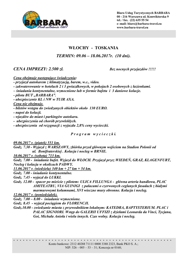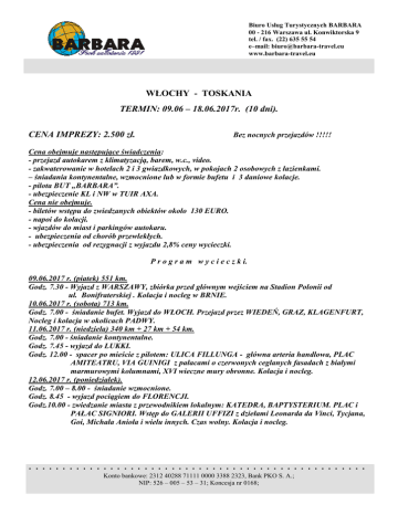 Biuro Usług Turystycznych BARBARA 00 - 216 Warszawa ul. Konwiktorska 9 tel. / fax. (22) 635 55 54 e–mail: [email protected] www.barbara-travel.eu WŁOCHY - TOSKANIA TERMIN: 09.06 – 18.06.2017r. (10 dni). CENA IMPREZY: 2.500 zł. Bez nocnych przejazdów !!!!! Cena obejmuje następujące świadczenia: - przejazd autokarem z klimatyzacją, barem, w.c., video. - zakwaterowanie w hotelach 2 i 3 gwiazdkowych, w pokojach 2 osobowych z łazienkami. – śniadania kontynentalne, wzmocnione lub w formie bufetu i 3 daniowe kolacje. - pilota BUT „BARBARA”. - ubezpieczenie KL i NW w TUIR AXA. Cena nie obejmuje. - biletów wstępu do zwiedzanych obiektów około 130 EURO. - napoi do kolacji. - wjazdów do miast i parkingów autokaru. - ubezpieczenia od chorób przewlekłych. - ubezpieczenia od rezygnacji z wyjazdu 2,8% ceny wycieczki. P r o g r a m w y c i e c z k i. 09.06.2017 r. (piatek) 551 km. Godz. 7.30 - Wyjazd z WARSZAWY, zbiórka przed głównym wejściem na Stadion Polonii od ul. Bonifraterskiej . Kolacja i nocleg w BRNIE. 10.06.2017 r. (sobota) 713 km. Godz. 7.00 - śniadanie bufet. Wyjazd do WŁOCH. Przejazd przez WIEDEŃ, GRAZ, KLAGENFURT, Nocleg i kolacja w okolicach PADWY. 11.06.2017 r. (niedziela) 340 km + 27 km + 54 km. Godz. 7.00 - śniadanie kontynentalne. Godz. 7.45 - wyjazd do LUKKI. Godz. 12.00 - spacer po mieście z pilotem: ULICA FILLUNGA - główna arteria handlowa, PLAC AMITEATRU, VIA GUINIGI z pałacami o czerwonych ceglanych fasadach z białymi marmurowymi kolumnami, XVI wieczne mury obronne. Kolacja i nocleg. 12.06.2017 r. (poniedziałek). Godz. 7.00 – 8.00 - śniadanie wzmocnione. Godz. 8.45 - wyjazd pociągiem do FLORENCJI. Godz.10.00 - zwiedzanie miasta z przewodnikiem lokalnym: KATEDRA, BAPTYSTERIUM. PLAC i PAŁAC SIGNIORI. Wstęp do GALERII UFFIZI z dziełami Leonarda da Vinci, Tycjana, Goi, Michała Anioła i wielu innych. Czas wolny. Kolacja i nocleg. .................................................. Konto bankowe: 2312 40288 71111 0000 3388 2323, Bank PKO S. A.; NIP: 526 – 005 – 53 – 31; Koncesja nr 0168; 13.06.2017 r. (wtorek) 97 km + 12 km + 41 km + 79 km. Godz. 7.00 – 8.00 - śniadanie. Godz. 8.15 - wyjazd do CERTALDO miejsca urodzin autora DECAMERONA BOCCACCIA GIOVANIEGO. Spacer po mieście z XIV wiecznym ratuszem, murami miejskimi, bramami i czerwonymi dachami. Przejazd do SAN GIMIGNANO – miasta pięknych wież, zwanego średniowiecznym MANHATANEM. Zwiedzanie miasta z przewodnikiem lokalnym: PLAC CYSTERNY, PLAC KATEDRALNY, RATUSZ, PAŁAC KOMUNALNY Z GRUBĄ WIEŻĄ, KOLEGIATA z XII w. Spacer po VOLTERZE mieście fortecy Medyceuszy z 1472 r. Kolacja i nocleg w okolicach CHIUSI. 14.06.2017r. (środa) 76 km + 22 km + 20 km +98 km. Godz. 7.00 – 8.00 – śniadanie. Przejazd przez winny region CHIANTI przez wioskę LA PANCA, CASTELLO DI QUERCETO, MONTE SAN MICHELE, osadę ALBOLA z XI w., RADDA IN CHIANTI z imponującym ratuszem. BADIA A COLTIBUONO piękna winnica z opactwem z VIII wieku, GREVE IN CHIANTI z placem MATTEOTTI z arkadami i balkonami z kutego żelaza obrośniętymi geranium. Spacer po MONTERIGGIONI klejnocie średniowiecznej architektury z fortecą i dobrze zachowanymi murami obronnymi. Kolacja i nocleg w okolicach CHIUSI. 15.06.2017 r. (czwartek) 53 km + 33 km+ 13 km + 24 km + 52 km. Godz. 7.15 - 8.15 - śniadanie bufet. Godz. 8.30 – wyjazd do CORTONY jednego z najstarszych miast Toskanii z Ratuszem. Spacer ulicą JANELLI z najstarszymi domami we Włoszech. Zwiedzanie MONTEPULCIANO – PIAZZA GRANDE, pałace na Via Corso. Spacer po PIENZA - modelowym renesansowym miasteczku Papieża PIUSA II. MONTALCINO z wąskimi uliczkami i fortecą z 1571 r. i licznymi sklepami z winem. Kolacja i nocleg w okolicach CHIUSI. 16.06.2017 r. (piątek) 80 km + 268 km. Godz. 7.30 – 8.00 – śniadanie bufet. Godz. 8.15 – wyjazd do SIENY i zwiedzanie miasta z przewodnikiem lokalnym: CAMPO główny plac miasta w kształcie muszli z Ratuszem, KATEDRA z XIII w, DOM SANKTUARIUM Św. Katarzyny patronki Włoch i Europy. Zwiedzanie PADWY. Kolacja i nocleg w w okolicach WENECJI. 17.06.2017 r. (sobota). Śniadanie. Spacer po centrum WIEDNIA. Kolacja i nocleg w BRNIE. 18.06.2017.r. (niedziela). Godz. 7.00 - 8.00 śniadanie bufet. Godz. 8.30 - wyjazd do POLSKI. Obiad na terenie Polsk na koszt uczestników wycieczki. . Przyjazd do WARSZAWY około godz. 19.00 - przy zapisie wpłata zaliczki w wysokości 750 zł (30% ceny wycieczki). - miejsca w autokarze numerowane i wybierane przy zapisie i wpłacie zaliczki. - w autokarze obowiązuje całkowity zakaz palenia, postoje na toaletę i papierosa co 3 godziny. - kolejność zwiedzania może ulec zmianie. - wycieczkę realizujemy przy minimum 20 osobach. ZAPRASZAMY !!!!