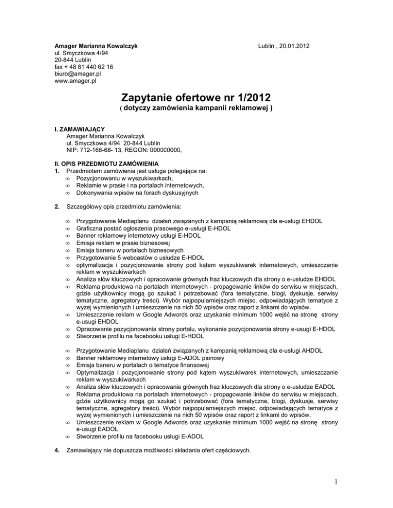 Amager Marianna Kowalczyk ul. Smyczkowa 4/94 20-844 Lublin fax + 48 81 440 62 16 [email protected] www.amager.pl Lublin , 20.01.2012 Zapytanie ofertowe nr 1/2012 ( dotyczy zamówienia kampanii reklamowej ) I. ZAMAWIAJĄCY Amager Marianna Kowalczyk ul. Smyczkowa 4/94 20-844 Lublin NIP: 712-166-68- 13, REGON: 000000000, II. OPIS PRZEDMIOTU ZAMÓWIENIA 1. Przedmiotem zamówienia jest usługa polegająca na: • Pozycjonowaniu w wyszukiwarkach, • Reklamie w prasie i na portalach internetowych, • Dokonywania wpisów na forach dyskusyjnych 2. Szczegółowy opis przedmiotu zamówienia: • • • • • • • • • • • • • • • • • • • • 4. Przygotowanie Mediaplanu działań związanych z kampanią reklamową dla e-usługi EHDOL Graficzna postać ogłoszenia prasowego e-usługi E-HDOL Banner reklamowy internetowy usługi E-HDOL Emisja reklam w prasie biznesowej Emisja baneru w portalach biznesowych Przygotowanie 5 webcastów o usłudze E-HDOL optymalizacja i pozycjonowanie strony pod kątem wyszukiwarek internetowych, umieszczanie reklam w wyszukiwarkach Analiza słów kluczowych i opracowanie głównych fraz kluczowych dla strony o e-usłudze EHDOL Reklama produktowa na portalach internetowych - propagowanie linków do serwisu w miejscach, gdzie użytkownicy mogą go szukać i potrzebować (fora tematyczne, blogi, dyskusje, serwisy tematyczne, agregatory treści). Wybór najpopularniejszych miejsc, odpowiadających tematyce z wyzej wymienionych i umieszczenie na nich 50 wpisów oraz raport z linkami do wpisów. Umieszczenie reklam w Google Adwords oraz uzyskanie minimum 1000 wejść na stronę strony e-usugi EHDOL Opracowanie pozycjonowania strony portalu, wykonanie pozycjonowania strony e-usugi E-HDOL Stworzenie profilu na facebooku usługi E-HDOL Przygotowanie Mediaplanu działań związanych z kampanią reklamową dla e-usługi AHDOL Banner reklamowy internetowy usługi E-ADOL pionowy Emisja baneru w portalach o tematyce finansowej Optymalizacja i pozycjonowanie strony pod kątem wyszukiwarek internetowych, umieszczanie reklam w wyszukiwarkach Analiza słów kluczowych i opracowanie głównych fraz kluczowych dla strony o e-usłudze EADOL Reklama produktowa na portalach internetowych - propagowanie linków do serwisu w miejscach, gdzie użytkownicy mogą go szukać i potrzebować (fora tematyczne, blogi, dyskusje, serwisy tematyczne, agregatory treści). Wybór najpopularniejszych miejsc, odpowiadających tematyce z wyzej wymienionych i umieszczenie na nich 50 wpisów oraz raport z linkami do wpisów. Umieszczenie reklam w Google Adwords oraz uzyskanie minimum 1000 wejść na stronę strony e-usugi EADOL Stworzenie profilu na facebooku usługi E-ADOL Zamawiający nie dopuszcza możliwości składania ofert częściowych. 1 5. Zamawiający dopuszcza możliwość powierzenia części lub całości zamówienia podwykonawcom. Zastrzega się jednak, że oferent musi poinformować zamawiającego o podwykonawstwie w trakcie realizacji oferty III. TERMIN WYKONANIA ZAMÓWIENIA Rozpoczęcie kampanii: od 01.02.2012 r. Termin wykonania przedmiotu zamówienia: do 23.03.2012 r. IV. OPIS SPOSBU PRZYGOTOWANIA OFERTY Oferent powinien stworzyć ofertę zawierającą formularz cenowy załączony do niniejszego zapytania. Oferta powinna być: - opatrzona pieczątką firmową, - posiadać datę sporządzenia, - zawierać adres lub siedzibę oferenta, numer telefonu, numer NIP, - podpisana czytelnie przez wykonawcę, - termin związania ofertą (minimum 30 dni kalendarzowych). V. MIEJSCE ORAZ TERMIN SKŁADANIA OFERT 1. Oferta powinna być przesłana za pośrednictwem: poczty elektronicznej na adres: [email protected] , faksem na nr: + 48 81 440 62 16, poczty lub kuriera na adres: Erazma Ciołka 10 01-402 Warszawa do dnia 29.01.2012. wraz z załączoną kserokopią wypisu z rejestru przedsiębiorców lub zaświadczenia z ewidencji działalności gospodarczej, wystawione w dacie nie wcześniejszej niż sześć miesięcy przed datą złożenia oferty. 2. Wybór najkorzystniejszej oferty zostanie ogłoszony 30.01.2012 na stronie internetowej pod adresem http://www.twojeraporty.pl/o_nas/przetargi 3. Oferty złożone po terminie nie będą rozpatrywane 4. Oferent może przed upływem terminu składania ofert zmienić lub wycofać swoją ofertę. 5. W toku badania i oceny ofert Zamawiający może żądać od oferentów wyjaśnień dotyczących treści złożonych ofert. 6. Zapytanie ofertowe zamieszczono na stronie: www.twojeraporty.pl VI. OCENA OFERT Zamawiający dokona oceny ważnych ofert i wybierze najbardziej korzystną ekonomicznie VII. INFORMACJE DOTYCZĄCE WYBORU NAJKORZYSTNIEJSZEJ OFERTY O wyborze najkorzystniejszej oferty Zamawiający zawiadomi oferentów za pośrednictwem strony internetowej znajdującej się pod adresem http://www.twojeraporty.pl/o_nas/przetargi VIII. DODATKOWE INFORMACJE Dodatkowych informacji udziela Konrad Kowalczyk pod numerem telefonu 503 029 200 oraz adresem email: [email protected] Zamawiający zastrzega sobie prawo do unieważnienia postępowania bez podania przyczyny IX. ZAŁĄCZNIKI Załącznik 1 Wzór formularza cenowego. 2 Załącznik 1 Wzór formularza cenowego Element Przygotowanie Mediaplanu działań związanych z kampanią reklamową dla e-usługi EHDOL Graficzna postać ogłoszenia prasowego e-usługi E-HDOL Banner reklamowy internetowy usługi E-HDOL Emisja reklam w prasie biznesowej Emisja baneru w portalach biznesowych Przygotowanie 5 webcastów o usłudze E-HDOL optymalizacja i pozycjonowanie strony pod kątem wyszukiwarek internetowych, umieszczanie reklam w wyszukiwarkach Analiza słów kluczowych i opracowanie głównych fraz kluczowych dla strony o e-usłudze EHDOL Reklama produktowa na portalach internetowych propagowanie linków do serwisu w miejscach, gdzie użytkownicy mogą go szukać i potrzebować (fora tematyczne, blogi, dyskusje, serwisy tematyczne, agregatory treści). Wybór najpopularniejszych miejsc, odpowiadających tema