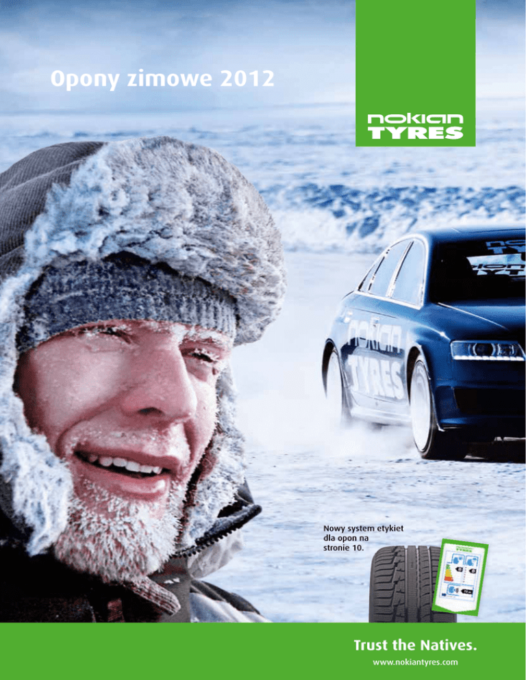 Opony zimowe 2012 Nowy system etykiet dla opon na stronie 10. Trust the Natives. www.nokiantyres.com Nokian Tyres®. Niezrównane gdziekolwiek pojawia się zima. Nokian Tyres cieszy się już ponad 75-letnim doświadczeniem w wytwarzaniu opon zaprojektowanych do jazdy w ekstremalnych warunkach. Już w roku 1934 jako pierwsi na świecie wyprodukowaliśmy oponę zimową. Z każdą oponą zimową Nokian udowadniamy, że nawet najbardziej surowy klimat jest do pokonania. Stawiamy przede wszystkim na bezpieczeństwo, dzięki czemu możesz w pełni swobodnie cieszyć się z jazdy oraz wykorzystywać możliwości swojego samochodu przez całą zimę, niezależnie od pogody. Stawiamy przede wszystkim na bezpieczeństwo i ochronę środowiska. Nokian Tyres jako pierwszy producent opon na świecie wprowadził technologię wykorzystującą wyłącznie oczyszczone, niskoaromatyczne oleje. Dla zwiększenia przyczepności na oblodzonej i mokrej nawierzchni do konstrukcji bieżnika używany jest olej canola, który jest surowcem odnawialnym. Najdalej wysunięty na Północ teren testowy. Symulacje jazdy w ekstremalnych warunkach zimowych odbywają się od listopada do maja na 700‑hektarowym terenie testowym Nokian Tyres znajdującym się w Ivalo w Finlandii. Oprócz sprzętu do testowania oraz wskaźników pomiaru znaczącą rolę w ocenianiu opon odgrywają doświadczenia specjalistów z wieloletnią praktyką, którzy są kierowcami testowymi Nokian Tyres. Nowy rekord prędkości na lodzie uzyskany na oponach Nokian Tyres. Nokian Tyres jest pionierem, który wchodzi na rynek z innowacyjnymi technologiami, przekraczającymi dotychczasowe granice. Przeprowadzanie testów w warunkach ekstremalnych stanowi zasadniczą część rozwoju opon zimowych a osiągnięte wyniki są widoczne we wszystkich naszych produktach. Dzięki naszym doświadczeniom staliśmy się posiadaczami światowych rekordów prędkości podczas jazdy w warunkach zimowych. Oba rekordy przy zastosowaniu opon Nokian Hakkapeliitta osiągnął Janne Laitinen, kierowca testowy firmy Nokian Tyres. Najnowszy rekord w grupie samochodów o napędzie elektrycznym został ustanowiony w dniu 17. marca 2012 na zamarzniętym jeziorze Ukonjärvi w fińskim mieście Inari, kiedy to Laitinen osiągnął podczas jazdy samochodem o napędzie elektrycznym ERA prędkość 252,09 km/h (156,67 mph). Ten sportowy samochód wyposażony w silnik elektryczny o mocy 280 kW osiągnął w warunkach zimowych prędkość maksymalną przekraczającą 260 km/h (162 mph). Podczas jazdy po rekord wyposażony był w opony z kolcami Nokian Hakkapeliitta 7 (225/40R18 92 T XL). Poprzedni rekord Laitinen osiągnął 6. marca 2011, kiedy podczas jazdy samochodem z silnikiem spalinowym osiągnął prędkość 331,61 km/h (206,05 mph). Podczas bicia rekordu samochód Audi RS6 był wyposażony w opony z kolcami Nokian Hakkapeliitta 7 (255/35R20 97 T XL). To pobicie rekordu Guinessa w jeździe na lodzie miało miejsce na 14 km odcinku zamarzniętej Zatoki Botnickiej. Zima została pokonana dzięki pomysłom sprawdzonym w praktyce. Od ponad 75 lat rozwijamy, testujemy oraz opatentowujemy rozwiązania podnoszące bezpieczeństwo podczas jazdy. Nieustanna praca nad rozwojem służy zwiększaniu bezpieczeństwa, trwałości oraz tworzeniu produktów jak najbardziej przyjaznych dla środowiska naturalnego. Naszym nadrzędnym celem jest zapewnienie bezwarunkowego bezpieczeństwa: Opona powinna zachowywać swoje właściwości w każdych warunkach, nawet gdy się zużywa i starzeje. Lamele Technologia cichej ściany bocznej Polerowane rowki Ciche rowki Opatentowany system lameli zapewnia oponie lepszą przyczepność na mokrym lodzie. Nacięcia w kształcie kieszonek zastosowane na blokach bieżnika usuwają wodę z przestrzeni kontaktu i zapewniają lepszy kontakt z nawierzchnią. Specjalna strefa ściany bocznej opony pomaga filtrować hałas oraz wibracje z nawierzchni drogi, redukując hałas wewnątrz pojazdu. Skuteczne oraz wydajne odprowadzanie śniegu, wody oraz błota pośniegowego zapewniają unikalne polerowane rowki bieżnika opony. Okrągłe wgłębienia znajdujące się po bokach żeber wzdłużnych, strukturą przypominające wzór piłki golfowej, odpowiadają za chłodzenie opony, zmniejszają opór oraz redukują hałas generowany podczas jazdy. Nokian WR A3, Nokian WR D3 Nokian WR A3, Nokian WR G2 SUV Nokian WR A3 Nokian Hakkapeliitta R, Hakkapeliitta R SUV Cyfrowy wskaźnik zużycia (DSI) Dodatkowa ochrona opony i felgi Naturalnie Nokian Tyres Niskie opory toczenia Układ cyfr umieszczonych na bieżniku opony pozwala łatwo odczytać aktualną wysokość rzeźby bieżnika w milimetrach. Zastosowanie dodatkowego rantu zapobiega wnikaniu drobinek piasku i błota pomiędzy oponę oraz felgę, a jednocześnie gwarantuje dłuższy czas użytkowania zarówno opon, jak i felg. Nokian Tyres jest pierwszym na świecie producentem opon, który zastosował w całej swojej gamie produktowej wyłącznie oczyszczone, niskoaromatyczne oleje. Wraz z redukcją oporu toczenia opony obniża się zużycie paliwa, a także zmniejsza się emisja dwutlenku węgla do atmosfery. Różnice w wartościach oporów toczenia mogą być bardzo duże – mogą wynosić nawet 40%. W przybliżeniu oznacza to 6% różnicy w zużyciu paliwa. Opony Nokian zaprojektowane są w taki sposób, by sprostać trudnym i zmiennym warunkom, jakie nas mogą zastać na drodze zimą. Dzięki kilku poniższym wskazówkom Twoje opony pozostaną w znakomitej formie, jednocześnie zapewniając Ci bezpieczną jazdę. Zadbaj o swoje opony Nokian. Czy opony muszą się „ułożyć”? Zalecamy, aby podczas pokonywania pierwszych 500 km od momentu zamontowania opon pozwolić im na dotarcie oraz właściwe ułożenie się. Tuż po zamontowaniu opon radzimy unikać, jeżeli to możliwe, gwałtownego przyspieszania, hamowania oraz wykonywania gwałtownych skrętów. W ten sposób pozwolimy, aby pasta montażowa należycie w