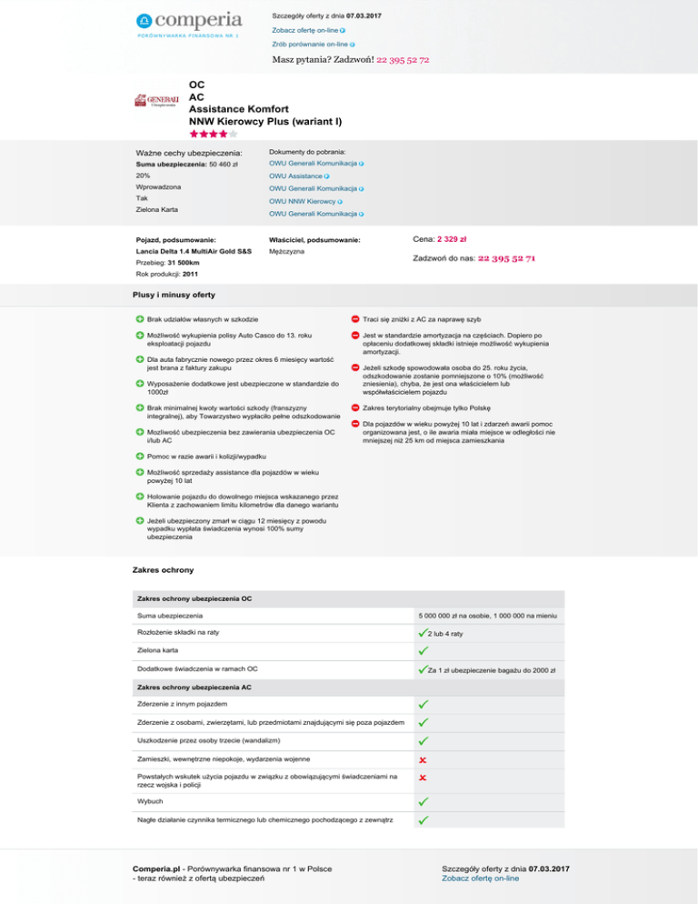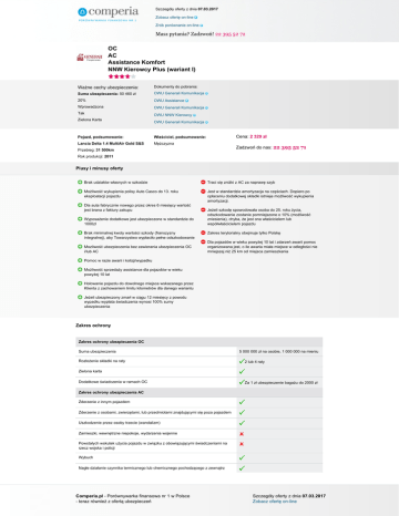Szczegóły oferty z dnia 07.03.2017 Zobacz ofertę on-line Zrób porównanie on-line Masz pytania? Zadzwoń! 22 395 52 72 OC AC Assistance Komfort NNW Kierowcy Plus (wariant I) Ważne cechy ubezpieczenia: Dokumenty do pobrania: Suma ubezpieczenia: 50 460 zł OWU Generali Komunikacja 20% OWU Assistance Wprowadzona OWU Generali Komunikacja Tak OWU NNW Kierowcy Zielona Karta OWU Generali Komunikacja Pojazd, podsumowanie: Właściciel, podsumowanie: Lancia Delta 1.4 MultiAir Gold S&S Mężczyzna Cena: 2 329 zł Zadzwoń do nas: 22 395 52 71 Przebieg: 31 500km Rok produkcji: 2011 Plusy i minusy oferty Brak udziałów własnych w szkodzie Traci się zniżki z AC za naprawę szyb Możliwość wykupienia polisy Auto Casco do 13. roku eksploatacji pojazdu Jest w standardzie amortyzacja na częściach. Dopiero po opłaceniu dodatkowej składki istnieje możliwość wykupienia amortyzacji. Dla auta fabrycznie nowego przez okres 6 miesięcy wartość jest brana z faktury zakupu Wyposażenie dodatkowe jest ubezpieczone w standardzie do 1000zł Brak minimalnej kwoty wartości szkody (franszyzny integralnej), aby Towarzystwo wypłaciło pełne odszkodowanie Mozliwość ubezpieczenia bez zawierania ubezpieczenia OC i/lub AC Jeżeli szkodę spowodowała osoba do 25. roku życia, odszkodowanie zostanie pomniejszone o 10% (możliwość zniesienia), chyba, że jest ona właścicielem lub współwłaścicielem pojazdu Zakres terytorialny obejmuje tylko Polskę Dla pojazdów w wieku powyżej 10 lat i zdarzeń awarii pomoc organizowana jest, o ile awaria miała miejsce w odległości nie mniejszej niż 25 km od miejsca zamieszkania Pomoc w razie awarii i kolizji/wypadku Możliwość sprzedaży assistance dla pojazdów w wieku powyżej 10 lat Holowanie pojazdu do dowolnego miejsca wskazanego przez Klienta z zachowaniem limitu kilometrów dla danego wariantu Jeżeli ubezpieczony zmarł w ciągu 12 miesięcy z powodu wypadku wypłata świadczenia wynosi 100% sumy ubezpieczenia Zakres ochrony Zakres ochrony ubezpieczenia OC Suma ubezpieczenia Rozłożenie składki na raty 5 000 000 zł na osobie, 1 000 000 na mieniu 2 lub 4 raty Zielona karta Dodatkowe świadczenia w ramach OC Za 1 zł ubezpieczenie bagażu do 2000 zł Zakres ochrony ubezpieczenia AC Zderzenie z innym pojazdem Zderzenie z osobami, zwierzętami, lub przedmiotami znajdującymi się poza pojazdem Uszkodzenie przez osoby trzecie (wandalizm) Zamieszki, wewnętrzne niepokoje, wydarzenia wojenne Powstałych wskutek użycia pojazdu w związku z obowiązującymi świadczeniami na rzecz wojska i policji Wybuch Nagłe działanie czynnika termicznego lub chemicznego pochodzącego z zewnątrz Comperia.pl - Porównywarka finansowa nr 1 w Polsce - teraz również z ofertą ubezpieczeń Szczegóły oferty z dnia 07.03.2017 Zobacz ofertę on-line Szczegóły oferty z dnia 07.03.2017 Zobacz ofertę on-line Zrób porównanie on-line Masz pytania? Zadzwoń! 22 395 52 72 pojazdu Powódź Lawina Osunięcie i zapadanie się ziemi Grad Uderzenie pioruna Huragan Trzęsienie ziemi Kradzież pojazdu Z wyłączeniem motocykli. Możliwość rezygnacji z ryzyka kradzieży. Rabunek/Rozbój Upadek statku powietrznego Pożar Zakres ochrony Assistance Suma ubezpieczenia 3000 zł Zakres terytorialny Polska Wiek pojazdu do którego można wykupić ubezpieczenie nie starszy niż 10 lat Rodzaj pojazdu na który można wykupić ubezpieczenie Samochód osobowy, ciężarowo-osobowy, ciężarowy o ład. do 2 t., przyczepy kempingowe, przyczepy o ład. do 500 kg, motocykle. Ograniczenia ze względu na sposób użytkowania pojazdu (np. taxi, nauka jazdy, rent a car) Wyłączone są pojazdy taxi, nauki jazdy, rent a car, przewożące przesyłki kurierskie. Opcje zawarcia Niezależnie od innych ubezpieczeń. Usprawnienie pojazdu na miejscu zdarzenia Pomoc w razie awarii Pomoc w razie wypadku Limit odległości od miejsca zamieszkania Brak. Miejsce holowania Do najbliższego warsztatu lub miejsca zamieszkania - za zgodą Generali(jeśli najbliższy warsztat nie może dokonać naprawy). Samochód zastępczy Złomowanie pojazdu Parkowanie pojazdu Do 10 dni. Transport zastępczy/przewóz osób Tak (jeśli pojazdu nie można naprawić pojazdu w ciągu 3 dni). Nocleg/zakwaterowanie Do 3 dób (jeśli zdarzenie ma miejsce w odległości większej niż 75 km od miejsca zamieszkania). Dodatkowe informacje Zakres ochrony NNW Suma ubezpieczenia 50000 zł Wypłata świadczenia w razie śmierci Jeżeli ubezpieczony zmarł w ciągu 12 miesięcy z powodu wypadku otrzyma świadczenie w wysokości 100 proc. sumy ubezpieczenia. Wsiadanie i wysiadanie z pojazdu Załadowanie lub wyładowanie pojazdu Pożar, wybuch pojazdu Comperia.pl - Porównywarka finansowa nr 1 w Polsce - teraz również z ofertą ubezpieczeń Szczegóły oferty z dnia 07.03.2017 Zobacz ofertę on-line Szczegóły oferty z dnia 07.03.2017 Zobacz ofertę on-line Zrób porównanie on-line Masz pytania? Zadzwoń! 22 395 52 72 Zatrzymanie, postój, naprawa pojazdu Podwójne świadczenie w przypadku 90% trwałego uszczerbku na zdrowiu Garażowanie pojazdu Terytorium ochrony Terytorium ochrony ubezpieczenia AC Kraje Unii Europejskiej Algeria Albania Libia Maroko Mołdawia Bez ryzyka kradzieży Białoruś Bez ryzyka kradzieży Rosja (część europejska) Bez ryzyka kradzieży Czarnogóra Serbia Bośnia i Hercegowina Tunezja Iran Turcja W części europejskiej Izrael Ukraina Bez kradzieży Wyłączenia Wyłączenia ubezpieczenia AC Udział własny w szkodzie Zniesiony. Możliwość wprowadzenia. Amortyzacja za części Wprowadzona (możliwość zniesienia). Rodzaj stacji naprawczej (ze względu na metodę naprawy) Faktura - serwis / Kosztorys - stacja naprawcza Rodzaj używanych części do naprawy Faktura - części nowe oryginalne / Kosztorys - nowe oryginalne lub zamienniki (wliczając współczynnik korygujący liczony od części oryginalnej) z uwzględnieniem amortyzacji (możliwość wykupienia amortyzacji) Okres eksploatacji pojazdu w jakim m