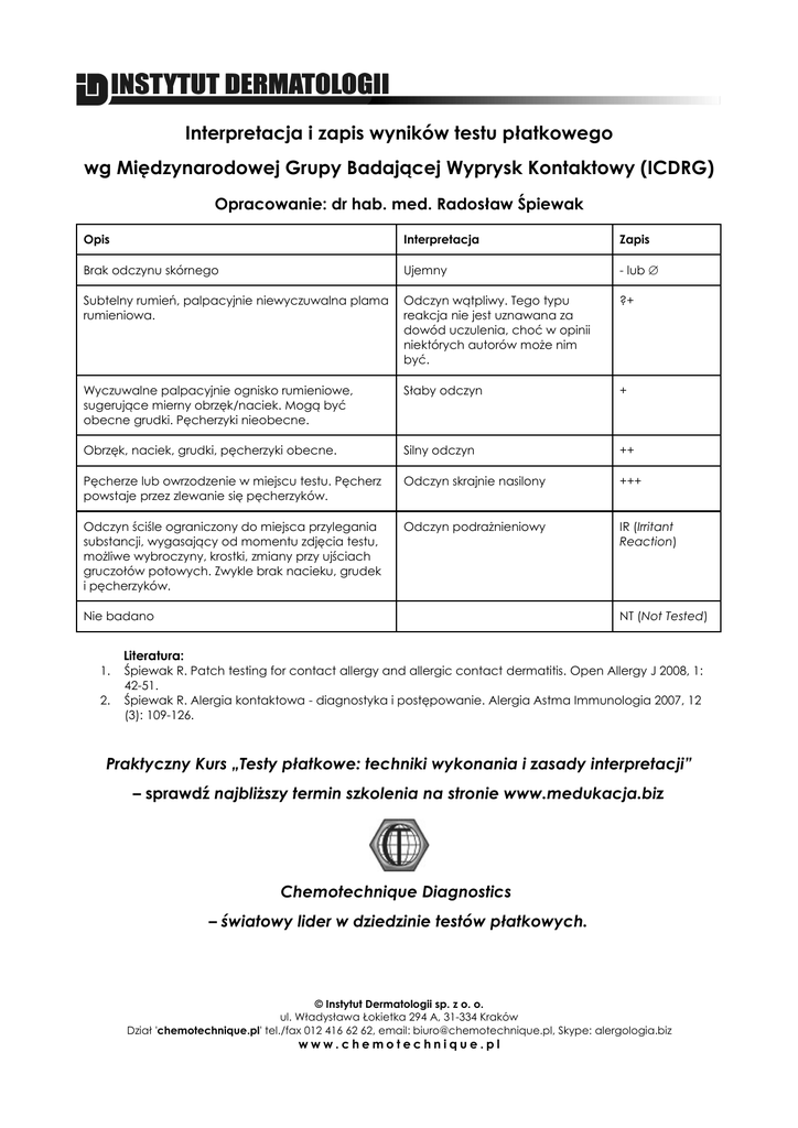 Interpretacja i zapis wyników testu płatkowego wg Międzynarodowej Grupy Badającej Wyprysk Kontaktowy (ICDRG) Opracowanie: dr hab. med. Radosław Śpiewak Opis Interpretacja Zapis Brak odczynu skórnego Ujemny - lub ∅ Subtelny rumień, palpacyjnie niewyczuwalna plama rumieniowa. Odczyn wątpliwy. Tego typu reakcja nie jest uznawana za dowód uczulenia, choć w opinii niektórych autorów może nim być. ?+ Wyczuwalne palpacyjnie ognisko rumieniowe, sugerujące mierny obrzęk/naciek. Mogą być obecne grudki. Pęcherzyki nieobecne. Słaby odczyn + Obrzęk, naciek, grudki, pęcherzyki obecne. Silny odczyn ++ Pęcherze lub owrzodzenie w miejscu testu. Pęcherz powstaje przez zlewanie się pęcherzyków. Odczyn skrajnie nasilony +++ Odczyn ściśle ograniczony do miejsca przylegania substancji, wygasający od momentu zdjęcia testu, możliwe wybroczyny, krostki, zmiany przy ujściach gruczołów potowych. Zwykle brak nacieku, grudek i pęcherzyków. Odczyn podrażnieniowy IR (Irritant Reaction) Nie badano NT (Not Tested) Literatura: 1. 2. Śpiewak R. Patch testing for contact allergy and allergic contact dermatitis. Open Allergy J 2008, 1: 42-51. Śpiewak R. Alergia kontaktowa - diagnostyka i postępowanie. Alergia Astma Immunologia 2007, 12 (3): 109-126. Praktyczny Kurs „Testy płatkowe: techniki wykonania i zasady interpretacji” – sprawdź najbliższy termin szkolenia na stronie www.medukacja.biz Chemotechnique Diagnostics – światowy lider w dziedzinie testów płatkowych. © Instytut Dermatologii sp. z o. o. ul. Władysława Łokietka 294 A, 31-334 Kraków Dział 'chemotechnique.pl' tel./fax 012 416 62 62, email: [email protected], Skype: alergologia.biz www.chemotechnique.pl
