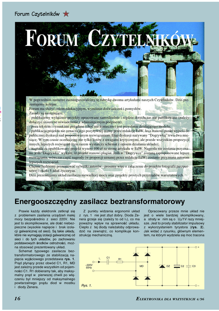 Forum Czytelników FORUM CZYTELNIKÓW W poprzednim numerze zainaugurowaliśmy tę rubrykę dwoma artykułami naszych Czytelników. Dziś pre− zentujemy kolejne. Forum ma służyć celom edukacyjnym, wymianie doświadczeń i pomysłów. Zasady są następujące: − publikujemy wyłącznie projekty opracowane samodzielnie i nigdzie dotychczas nie publikowane (należy dołączyć stosowne oświadczenie z własnoręcznym podpisem); − poza tekstem i rysunkami pożądane (choć nie konieczne) jest przysłanie działającego modelu; − publikacja projektu nie oznacza jego pozytywnej oceny przez redakcję EdW, lecz stanowi punkt wyjścia do publicznej dyskusji nad proponowanym rozwiązaniem. Etap dyskusji nazywany “Dogrywką” trwa dwa mie− siące. W tym czasie oczekujemy nie tylko listów z uwagami krytycznymi, ale przede wszystkim propozycji innych, lepszych rozwiązań (tym razem wystarczy schemat z opisem działania układu); − nagroda za opublikowany projekt wynosi 100 zł za stronę artykułu w EdW. Nagroda nie zostanie przyzna− na, jeśli “Dogrywka” wykaże, iż projekt stanowi plagiat. Jeśli w ”Dogrywce” zostaną zaproponowane lepsze rozwiązania, wówczas część nagrody (w proporcji uznanej przez redakcję EdW) zostanie przyznana autorom lepszych rozwiązań. Chętnie będziemy prezentować sylwetki autorów − prosimy więc o załączenie do projektu fotografii paszpor− towej i około 5 zdań życiorysu. Dziś prezentujemy układ zasilacza niewielkiej mocy oraz projekty prostych przyrządów warsztatowych. Energooszczędny zasilacz beztransformatorowy Prawie każdy elektronik zetknął się z problemem zasilania urządzeń małej mocy bezpośrednio z sieci 220V. Nie jest to skomplikowane, ale dość niebez− pieczne (wysokie napięcie i brak izola− cji galwanicznej od sieci). Są takie układy, które nie wymagają izolacji galwanicznej od sieci i do tych układów, po zachowaniu podstawowych środków ostrożności, moż− na stosować prezentowany układ. Schemat typowego zasilacza bez− transformatorowego ze stabilizacją na− pięcia wyjściowego przedstawia rys. 1. Prąd płynący przez obwód C1, R1, MD jest zależny przede wszystkim od pojem− ności C1. R1 dobieramy tak, aby maksy− malny prąd w pierwszej chwili po włą− czeniu był mniejszy od maksymalnego powtarzalnego prądu diod w mostku i diody Zenera. 16 Z punktu widzenia ergonomii układ z rys. 1 nie jest zbyt dobry. Dioda Ze− nera grzeje się (zależy to od I1), co ma poważny wpływ na sprawność układu. Ciepło z tej diody należałoby odprowa− dzić na zewnątrz, co komplikuje kon− strukcję mechaniczną. Opracowany przeze mnie układ nie jest o wiele bardziej skomplikowany, a straty w nim są o UZ/1V razy mniej− sze. Jest to prosty stabilizator impulsowy z wykorzystaniem tyrystora (rys. 2). Jak widać z rysunku, głównym elemen− tem, na którym wydziela się moc tracona Rys. 1. E LEKTRONIKA DLA WSZYSTKICH 4/96 Forum Czytelników Dla zasilacza 12V 30mA R1: 100W , 0,25W C1: KMP 10, 470nF 400V lub 470nF 630V C2: 100µF/16V w postaci ciepła, jest tyrystor. Napięcie przewodzenia takiego elementu dla prą− dów >1A jest równe około 1V. Jak łatwo policzyć, moc tracona na tyrystorze jest równa: Pty = k · I1 · Uty gdzie Uty @ 1V, a k jest współczynni− kiem zależnym od tego, jaka część prą− du płynie przez tyrystor. W najgorszym wypadku k = 1, czyli: Pty = I1 · Uty = I1 · 1V. Łatwo zauważyć, że w poprzednim układzie Pty = I1 · UZ co w porównaniu z zaproponowa− nym przeze mnie układem jest o UZ/1V razy większe. Ze względów oczywistych nie wspomnę nawet o układach, w któ− rych napięcie obniża się przez stosowa− nie rezystora. Jak działa mój układ? Załóżmy, że napięcie w sieci przechodzi właśnie przez zero, co wiąże się z wyłączeniem tyrystora. Napięcie narasta, ładując w miarę potrzeby, przez diodę D1, po− jemność C2+C3. Gdy napięcie na tej po− Ω Rys. 2. jemności wzrośnie powyżej UZ diody Ze− nera, gałęzią DZ R2 popłynie prąd, który otworzy tyrystor. Zwierając prąd wejścio− wy do masy, nie dopuści on do wzrostu napięcia na C2+C3 powyżej UZ+ UR2+UG, gdzie UG to napięcie przewo− dzenia złącza bramka−katoda tyrystora, które dla zastosowanego tyrystora KT206/400 jest równe około 0,12V. Na− pięcie stabilizowane w tym układzie jest równe UZ, a tętnienia zależą od prądu pobieranego z tego zasilacza i od po− jemności C2+C3. Obliczenie amplitudy tych tętnień jest bardziej skomplikowane i w tym przypadku zalecam stosowa− nie metody prób i błędów wyznając za− sadę, że lepiej, aby ta pojemność była o 50% za duża niż o 1% za mała. Do wstępnych obliczeń można posłużyć się wzorem, który daje wystarczający zapas pojemności: I1 2π ⋅ f ⋅ ∆U gdzie DU jest amplitudą tętnień, a f=50Hz. Opisywany układ ma jeszcze jedną ciekawą właściwość − “widziany” od stro− ny sieci posiada charakter pojemnościo− wy. Można go więc wykorzystać jako do− datkową pojemność w filtrach przeciw− zakłóceniowych. Jerzy Hetmański Od Redakcji: Przy wszelkich próbach z urządzeniami zasilanymi wprost z sieci należy zachować jak najdalej idącą ostrożność. Wszystkie użyte ele− menty muszą mieć odpowiednią obcią− żalność i napięcia pracy. C= Proste przyrządy warsztatowe Przede wszystkim chciałbym się przedstawić. Nazywam się Oswald Si− korski, jestem 45−letnim rencistą. Pierw− szy kontakt z elektroniką miałem w wie− ku 13 lat i od tego czasu jest to dla mnie wielka przygoda. Wychowałem się na germanie, poprzez lampy doszedłem do krzemu, a w cyfrówce jestem raczku− jący. Mam mały amatorski warsztat, a w nim trochę różnorodnego sprzę− tu kontrolno−pomiarowego. Kupny mam tylko multimetr cyfrowy, nato− Rys. 1. Próbnik tranzystorów. Rys. 2. Sonda − szukacz sygnału E LEKTRONIKA DLA WSZYSTK