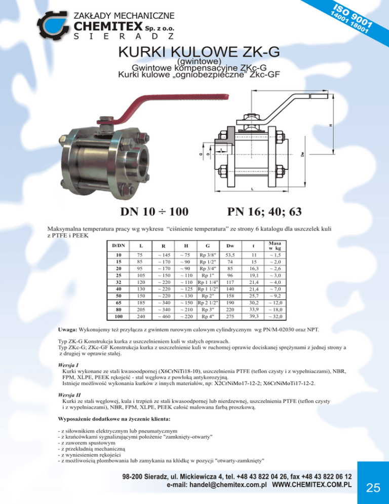 IS 14 O 00 1 ZAKLADY MECHANICZNE CHEMITEX Sp. z o.o. S I E R A D Z 90 18 01 00 1 KURKI KULOWE ZK-G H (gwintowe) Gwintowe kompensacyjne ZKc-G Kurki kulowe „ogniobezpieczne” Zkc-GF Dw D G t L DN 10 ÷ 100 PN 16; 40; 63 Maksymalna temperatura pracy wg wykresu “ciśnienie temperatura” ze strony 6 katalogu dla uszczelek kuli z PTFE i PEEK D/DN L R 10 15 20 25 32 40 50 65 80 100 75 85 95 105 120 130 150 185 205 240 ~ 145 ~ 170 ~ 170 ~ 150 ~ 220 ~ 220 ~ 220 ~ 340 ~ 340 ~ 460 H G ~ 75 Rp 3/8" ~ 90 Rp 1/2" ~ 90 Rp 3/4" ~ 110 Rp 1" ~ 110 Rp 1 1/4" ~ 125 Rp 1 1/2" ~ 130 Rp 2" ~ 150 Rp 2 1/2" ~ 210 Rp 3" ~ 220 Rp 4" Dw t 53,5 74 85 96 117 140 158 190 220 275 11 15 16,3 19,1 21,4 21,4 25,7 30,2 33,9 39,3 Masa w kg ~ 1,5 ~ 2,0 ~ 2,6 ~ 3,0 ~ 4,0 ~ 7,0 ~ 9,2 ~ 12,0 ~ 18,0 ~ 32,0 Uwaga: Wykonujemy też przyłącza z gwintem rurowym calowym cylindrycznym wg PN/M-02030 oraz NPT. Typ ZK-G Konstrukcja kurka z uszczelnieniem kuli w stałych oprawach. Typ ZKc-G; ZKc-GF Konstrukcja kurka z uszczelnienie kuli w ruchomej oprawie dociskanej sprężynami z jednej strony a z drugiej w oprawie stałej. Wersja I Kurki wykonane ze stali kwasoodpornej (X6CrNiTi18-10), uszczelnienia PTFE (teflon czysty i z wypełniaczami), NBR, FPM, XLPE, PEEK rękojeść - stal węglowa z powłoką antykorozyjną. Istnieje możliwość wykonania kurków z innych materiałów, np: X2CrNiMo17-12-2; X6CrNiMoTi17-12-2. Wersja II Kurki ze stali węglowej, kula i trzpień ze stali kwasoodpornej lub nierdzewnej, uszczelnienia PTFE (teflon czysty i z wypełniaczami), NBR, FPM, XLPE, PEEK całość malowana farbą proszkową. Wyposażenie dodatkowe na życzenie klienta: - z siłownikiem elektrycznym lub pneumatycznym - z krańcówkami sygnalizującymi położenie "zamknięty-otwarty" - z zaworem spustowym - z przekładnią mechaniczną - z wyniesieniem rękojeści - z możliwością plombowania lub zamykania na kłódkę w pozycji "otwarty-zamknięty" 98-200 Sieradz, ul. Mickiewicza 4, tel. +48 43 822 04 26, fax +48 43 822 06 12 e-mail: [email protected] WWW.CHEMITEX.COM.PL 25