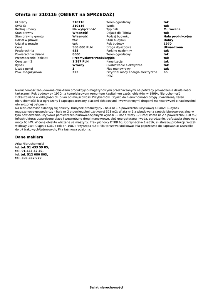Oferta nr 310116 (OBIEKT na SPRZEDAŻ) Id oferty SWO ID Rodzaj umowy Stan prawny Stan prawny gruntu Udział w prawie Udział w prawie Cena Powierzchnia Powierzchnia działki Przeznaczenie (obiekt) Cena za m2 Rynek Liczba pokoi Pow. magazynowa 310116 Teren ogrodzony 310116 Woda Na wyłączność Typ hali Własność Dojazd dla TIRów Własność Rodzaj budynku tak Stan budynku tak Rok budowy 560 000 PLN Droga dojazdowa 435 Parking naziemny 8600 Teren ogrodzony Przemysłowo/Produkcyjne Prąd 1 287 PLN Kanalizacja Wtórny Okablowanie elektryczne 3 Plac manewrowy 323 Przydział mocy energia elektryczna (KW) tak tak Murowana tak Hala produkcyjna Dobry 1970 Utwardzona tak tak tak tak tak tak 65 Nieruchomość zabudowana obiektami produkcyjno-magazynowymi przeznaczonymi na potrzeby prowadzenia działalności tartacznej. Rok budowy ok 1970r. z kompleksowym remontem kapitalnym części obiektów w 1999r. Nieruchomość zlokalizowana w odległości ok. 5 km od miejscowości Przybiernów. Dojazd do nieruchomości drogą utwardzoną, teren nieruchomości jest ogrodzony i zagospodarowany placami składowymi i wewnętrznymi drogami manewrowymi o nawierzchni utwardzonej betonem. Na nieruchomość składają się obiekty: Budynek produkcyjny - hala nr 1 o powierzchni użytkowej 435m2; Budynek magazynowo-gospodarczy - hala nr 2 o powierzchni użytkowej 323 m2; Wiata nr 1 z wbudowaną częścią biurowo-socjalną w tym powierzchnia użytkowa pomieszczeń biurowo-socjalnych wynosi 35 m2 a wiaty 170 m2; Wiata nr 2 o powierzchni 210 m2; Infrastruktura: utwardzone place i wewnętrzne drogi manewrowe, sieć energetyczna i woda, ogrodzenie, trafostacja słupowa o mocy 65 kW. W cenę obiektu wliczane są maszyny: Trak pionowy DTRB 63; Obrzynaczka 1-2016, 2- starszej produkcji; Wózek widłowy 2szt; Ciągnik C360p rok pr. 1987; Przyczepa 4,5t; Piła tarczowa/stolikowa; Piła poprzeczna do kapowania; Ostrzałka do pił trakowych/taśmowych; Piła taśmowa pozioma. Dane maklera Arka Nieruchomości tel. tel. 91 433 59 85, tel. 91 433 52 49, tel. tel. 512 080 803, tel. 508 382 979 Świat nieruchomości Powered by TCPDF (www.tcpdf.org)