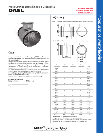 Przepustnice zamykające z uszczelką Pobierz Wentyle Pobierz AlnorCAM Zamawiaj w B2B DASL dla d1< 355 środek przepustnicy mocowany jest na dwóch krótkich prętach 85 dla d1 ≥ 355 środek przepustnicy mocowany jest na jednym długim pręcie Opis Przepustnica DASL z uszczelką z gumy EPDM na kołnierzu skonstruowana jest tak, żeby możliwe było zastosowanie do 50 mm izolacji. Przepustnica DASL może być stosowana wszędzie tam, gdzie kompletnie szczelne zamknięcie nie jest wymagane. Położenie płaszczyzny przepustnicy widoczne jest na uchwycie w zakresie od 0° do 90°. Płaszczyzna przepustnicy może być zablokowana za pomocą śruby. Do każdej przepustnicy DASL od średnicy 355 włącznie środek wykonywany jest z dodatkowym wzmocnieniem. Do każdej przepustnicy DASL od średnicy 450 włącznie dołączany jest mechanizm KIT-DS-H. Standardowo wykonywane z blachy ocynkowanej. Przykład oznaczenia Kod produktu: typ d1 DASL- aaa 140 d nom [mm] d1 nom [mm] d3 d2 d1 d2 nom [mm] d3 nom [mm] waga [kg] 80* - - - 0,40 100* - - - 0,45 125* - - - 0,55 140* - - 0,60 150* - - - 0,65 160* - - - 0,70 180* - - - 0,75 200* - - - 0,80 224* - - - 0,90 250* - - - 1,20 280* - - - 1,40 300* - - - 1,50 315* - - - 1,60 355** 330 295 263 2,70 400** 330 295 263 3,30 450** 370 337 293 4,50 500** 370 337 293 5,00 560** 490 457 413 6,30 600** 490 457 413 6,70 630** 490 457 413 7,20 * wykonanie ze środkami tłoczonymi ** wykonanie z dodatkowym wzmocnieniem Dla przepustnic o średnicach większych niż 630mm należy stosować przepustnice wielopłaszczyznowe DASQL. ALNOR® systemy wentylacji jest prawnie chronionym znakiem i technicznym patentem. Prawo do zmian zastrzeżone. Przepustnice wentylacyjne Wymiary