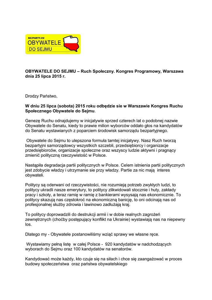 OBYWATELE DO SEJMU – Ruch Społeczny. Kongres Programowy, Warszawa dnia 25 lipca 2015 r. Drodzy Państwo, W dniu 25 lipca (sobota) 2015 roku odbędzie sie w Warszawie Kongres Ruchu Społecznego Obywatele do Sejmu. Genezę Ruchu odnajdujemy w inicjatywie sprzed czterech lat o podobnej nazwie Obywatele do Senatu, kiedy to prawie milion wyborców oddało głos na kandydatów do Senatu wystawianych z poparciem środowisk samorządu bezpartyjnego. Obywatele do Sejmu to ulepszona formuła tamtej inicjatywy. Nasz Ruch tworzą bezpartyjni samorządowcy wszystkich szczebli, przedsiębiorcy i organizacje przedsiębiorców, organizacje społeczne oraz wszyscy ludzie aktywni i pragnący zmienić polityczną rzeczywistość w Polsce. Nastąpiła degradacja partii politycznych w Polsce. Celem istnienia partii politycznych jest zdobycie władzy i utrzymanie sie przy władzy. Partie za nic mają interes obywateli. Politycy są oderwani od rzeczywistości, nie rozumieją potrzeb zwykłych ludzi, to politycy ukradli nasze emerytury, to politycy zlikwidowali stocznie i huty, zakłady pracy i szkoły, a teraz ramię w ramię z bankierami wysysają nas ekonomicznie. To politycy skazują nas częstokroć na ekonomiczną banicję, to oni odcinają nas od profesjonalnej służby zdrowia i lawinowo zadłużają kraj. To politycy doprowadzili do destrukcji armii i w dobie realnych zagrożeń zewnętrznych (choćby postępujący konflikt na Ukrainie) wystawiają nas na niepewny los. Dlatego my - Obywatele postanowiliśmy wziąć sprawy we własne ręce. Wystawiamy pełną listę w całej Polsce - 920 kandydatów w nadchodzących wyborach do Sejmu oraz 100 kandydatów na senatorów. Kandydować może każdy, kto czuje się na siłach i chce się zaangażować w proces budowy społeczeństwa oraz państwa obywatelskiego Jesteśmy zwykłymi obywatelami i wprowadzimy korzystne dla nas zmiany, między innymi: zniesienie finansowania partii politycznych z budżetu państwa Patologiczna jest bowiem sytuacja, gdy wyborca głosujący na partię x, finansuje również partię y , czy z. Opowiadamy się za zasadnicza reformą podatków, niedopuszczalna jest bowiem sytuacja, że wielkie sieci handlowe - obcy kapitał nie płaca grosza podatku dochodowego w Polsce. Nie może być tak, że miliardy złotych transferowane są z Polski za granicę. Zniesiemy podatek CIT oraz podatek PIT u osób prowadzących działalność gospodarczą, w zamian za wprowadzenie niskooprocentowanego podatku przychodowego, od 1% (handel), 1,5% (produkcja) do 2% (usługi) od przychodów netto. Obniżymy podstawową stawkę podatku VAT do poziomu 19 % Większość uczestników Ruchu Obywatele do Sejmu uważa, że należy wprowadzić ordynację większościową w oparciu o jednomandatowe okręgi wyborcze, ale szanujemy zdanie mniejszości w tym zakresie. Zreformujemy system wymiaru (nie) sprawiedliwości Kongres Programowy Ruchu Obywatele do Sejmu odbędzie się w dniu 25 lipca b.r. w Warszawie. Serdecznie Państwa zapraszamy. Prosimy kierować zgłoszenia do uczestnictwa w Kongresie na: [email protected] Zapraszamy Wojciech Papis Koordynator Ruchu Obywatele do Sejmu