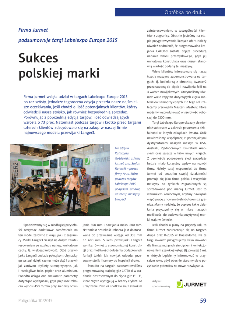 Obróbka po druku Firma Jurmet zainteresowaniem, w szczególności klientów z zagranicy. Obecnie jesteśmy na eta- podsumowuje targi Labelexpo Europe 2015 pie przygotowywania licznych ofert. Należy również nadmienić, że programowalna krajarka CATER-d została objęta procedurą Sukces polskiej marki nadania wzoru przemysłowego, gdyż jej unikatowa konstrukcja oraz design stanowią wartość dodaną tej maszyny. Wielu klientów interesowało się naszą trzecią maszyną zademonstrowaną na targach, tj. bobiniarką z obrotnicą Avancer2 przeznaczoną do cięcia i nawijania folii na 4 wałach nawijakowych. Otrzymaliśmy rów- Firma Jurmet wzięła udział w targach Labelexpo Europe 2015 po raz szósty, jednakże tegoroczna edycja przeszła nasze najśmielsze oczekiwania, jeśli chodzi o ilość potencjalnych klientów, którzy odwiedzili nasze stoisko, jak również bezpośrednią sprzedaż. Porównując z poprzednią edycją targów, ilość odwiedzających wzrosła o 73 proc. Natomiast podczas targów i krótko przed targami czterech klientów zdecydowało się na zakup w naszej firmie najnowszego modelu przewijarki Langer3. nież wiele zapytań dotyczących cięcia materiałów samoprzylepnych. Do tego celu zalecamy przewijarki Master i Master2, które możemy wyprodukować w szerokości roboczej do 2200 mm. Targi Labelexpo Europe okazały się również sukcesem w zakresie poszerzenia działalności w innych zakątkach świata. Otóż nawiązaliśmy współpracę z potencjalnymi dystrybutorami naszych maszyn w USA, Na zdjęciu Australii, Zjednoczonych Emiratach Arab- Katarzyna skich oraz jeszcze w kilku innych krajach. Goździńska z firmy Z pewnością poszerzenie sieci sprzedaży Jurmet oraz Stefan będzie miało korzystny wpływ na rozwój Rotarski – prezes firmy. Należy tutaj wspomnieć, że firma firmy Anro, która Jurmet od początku swojej działalności podczas targów promuje się jako firma polska i wszystkie Labelexpo 2015 maszyny na rynkach zagranicznych są podpisała umowę sprzedawane pod marką Jurmet. Jest to na zakup maszyny warunkiem koniecznym, abyśmy nawiązali Langer3 współpracę z nowym dystrybutorem za granicą. Mamy nadzieję, że poprzez takie działania przyczynimy się w miarę naszych możliwości do budowania pozytywnej marki kraju w świecie. Spodziewamy się w niedługiej przyszło- jania 800 mm i nawijania maks. 600 mm. Jeśli chodzi o plany na przyszły rok, to ści otrzymać dodatkowe zamówienia na Natomiast szerokość robocza jest dostoso- firma Jurmet zaprezentuje się na targach ten model zarówno z kraju, jak i z zagrani- wana do przewijania wstęgi: od 350 mm drupa oraz K-2016 w Düsseldorfie. Na te cy. Model Langer3 cieszył się dużym zainte- do 600 mm. Sukces przewijarki Langer3 targi również przygotujemy kilka nowości resowaniem ze względu na jego unikatowe wynika również z ergonomicznej konstruk- dla firm zajmujących się cięciem i konfekcjo- cechy, tj. wielozadaniowość. Otóż przewi- cji oraz możliwości dołożenia dodatkowych nowaniem szerokiej wstęgi (tj. powyżej 1 m), jarka Langer3 posiada pełną kontrolę nacią- funkcji takich jak nawijak odpadu, prze- o których będziemy informować w przy- gu wstęgi, dzięki czemu może ciąć i przewi- suwny stolik i kamery do inspekcji druku. jać zarówno etykiety samoprzylepne, jak Ponadto na targach zaprezentowaliśmy i rozciągliwe folie, papier oraz aluminium. programowalną krajarkę gilz CATER-d w wa- szłym roku, gdyż obecnie staramy się o pozyskanie patentów na nowe rozwiązania. Ponadto osiąga ona znakomite parametry riancie dostosowanym do cięcia gilz 1” i 3”, dotyczące wydajności, gdyż prędkość robo- które często występują w branży etykiet. To Artykuł cza wynosi 450 m/min przy średnicy odwi- urządzenie również spotkało się z szerokim sponsorowany Poligrafika 10/2015 59
