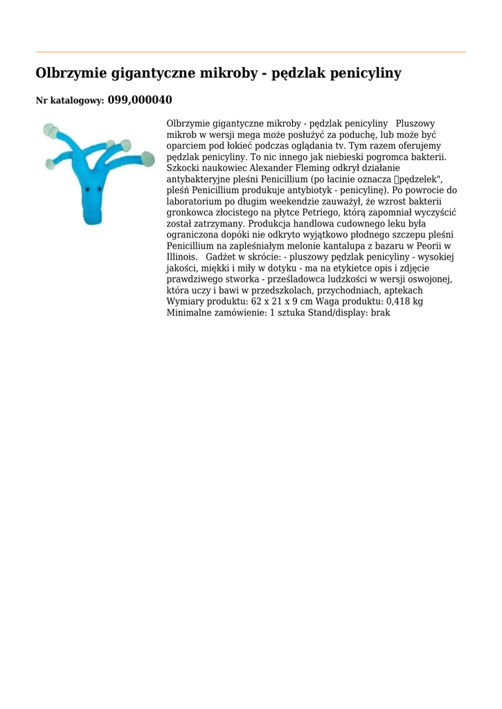 Olbrzymie gigantyczne mikroby - pędzlak penicyliny Nr katalogowy: 099,000040 Olbrzymie gigantyczne mikroby - pędzlak penicyliny Pluszowy mikrob w wersji mega może posłużyć za poduchę, lub może być oparciem pod łokieć podczas oglądania tv. Tym razem oferujemy pędzlak penicyliny. To nic innego jak niebieski pogromca bakterii. Szkocki naukowiec Alexander Fleming odkrył działanie antybakteryjne pleśni Penicillium (po łacinie oznacza pędzelek", pleśń Penicillium produkuje antybiotyk - penicylinę). Po powrocie do laboratorium po długim weekendzie zauważył, że wzrost bakterii gronkowca złocistego na płytce Petriego, którą zapomniał wyczyścić został zatrzymany. Produkcja handlowa cudownego leku była ograniczona dopóki nie odkryto wyjątkowo płodnego szczepu pleśni Penicillium na zapleśniałym melonie kantalupa z bazaru w Peorii w Illinois. Gadżet w skrócie: - pluszowy pędzlak penicyliny - wysokiej jakości, miękki i miły w dotyku - ma na etykietce opis i zdjęcie prawdziwego stworka - prześladowca ludzkości w wersji oswojonej, która uczy i bawi w przedszkolach, przychodniach, aptekach Wymiary produktu: 62 x 21 x 9 cm Waga produktu: 0,418 kg Minimalne zamówienie: 1 sztuka Stand/display: brak