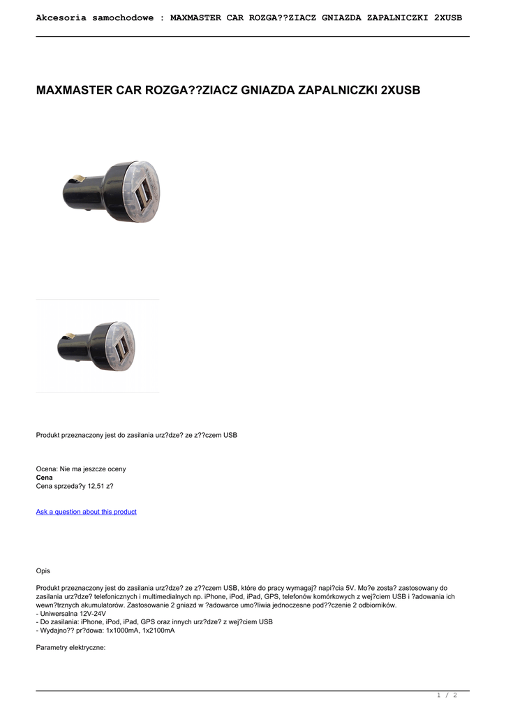 MAXMASTER CAR ROZGAŁĘZIACZ GNIAZDA ZAPALNICZKI 2XUSB