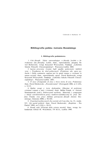 Człowiek w Kulturze 18 Bibliografía polska Antonia Rosminiego I. Bibliografía podmiotowa 1. Cele filozofii. Teksty wprowadzające w fdozofię [wybór z Introduzione alia filosofía], wybór, tłum., wprowadzenie, przypisy Pa weł Borkowski, wstęp Krzysztof Wroczyński, Fundacja „Lubelska Szkoła Filozofii Chrześcijańskiej", Warszawa-Lublin 2004. 2. Łączna przyczyna trwania bądź upadku społeczności ludzkich wraz z Przedmową do dziel politycznych [Prefazione alie opere po linche i Della sommaria cagione per la quale stanno o rovinano le umane società], tłum., wprowadzenie, oprać. Paweł Borkowski, wstęp Krzysztof Wroczyński, Fundacja „Lubelska Szkoła Filozofii Chrześ cijańskiej", Warszawa-Lublin 2001. 3. O etyce [Compendio di etica e breve storia di essa, Prefazione], tłum. Paweł Borkowski, „Poszukiwania" (Nowogard) 2006, nr 4 (45), s. 12-13. 4. Ogólne uwagi o życiu doskonałym [Massime di perfezione cristiana comuni a tutti i cristiani], tłum. Stefan Fiutak, w: Antoni Siemianowski (red.), Dobroczynne myślenie. Materiały z sympozjum z okazji czterdziestolecia pracy naukowo-dydaktycznej ks. prof. Ste fana Fiutaka oraz prace Jubilata poświęcone fdozofii Antonio Ros miniego, Gniezno 2000, s. 92-103. 5. O partiach politycznych [La società ed il suo fine, ks. I I , rozdz. X V , Dei partid politici], tłum. Paweł Borkows ki, „Rojalis ta - Pro Patria" 2001, nr 3 (34), s. 10-12. 6. Zasady etyki [Principii delia scienza morale], tłum., wstęp, ka lendarium Alfred M. Wierzbicki, TN K U L , Lublin 1999. 198 Bibliografia polska Antonia Rosminiego I I . Bibliografía przedmiotowa Skróty: CzK DM PK RF S SG SPhCh TP „Człowiek w Kulturze". Pismo poświęcone filozofii i kul turze (Lublin) Antoni Siemianowski (red.), Dobroczynne myślenie. Ma teriały z sympozjum z okazji czterdziestolecia pracy na ukowo-dydaktycznej ks. prof. Stefana Fiutaka oraz pra ce Jubilata poświęcone filozofii Antonio Rosminiego, Gniezno 2000 „Przegląd Kościelny" (Poznań) „Roczniki Filozoficzne" (Lublin) „Społeczeństwo". Studia - prace badawcze - dokumenty z zakresu nauki społecznej Kościoła (Warszawa) „Studia Gnesnensia" (Gniezno) „Studia Philosophiae Christianae" (Warszawa) „Tygodnik Powszechny" (Kraków) 1. Barański Michał, O potrzebie filozofii prawa, w: Maria Szyszkowska (red.), Filozofia prawa w życiu i nauczaniu, Temida 2, Bia łystok 2004, s. 47-53. 2. Barański Michał, Personalizm, w: Maria Szyszkowska (red.), Oczekiwane wartości w polityce, Instytut Wydawniczy „Książka i Pra sa", Warszawa 2005, s. 152-157. 3. Barański Michał, Prawo i moralność według Kanta - uwagi na tle „Filozofii prawa" Antonio Rosminiego, w: Maria Szyszkowska (red.), Filozofia Kanta w XXI wieku, Spółdzielnia Wydawnicza „Anagram", Warszawa 2005, s. 183-194. 4. Błędy Rosminiego, PK 1888 (10), półr. 2, s. 565-582. 5. Borkowski Paweł, Antonia Rosminiego filozofia polityki, w: A. Rosmini, Łączna przyczyna, s. 43-67. 6. Borkowski Paweł, Antonio Rosmini, „Rojalista - Pro Patria" (Wrocław) 2001, nr 3 (34), s. 12-13. 7. Borkowski Paweł, Dobro wspólne jako różnica dobra i zła. O realizmie politycznym na przykładzie Antonia Rosminiego, S 2006, nr 3, s. 475-490. Bibliografía polska Antonia Rosminiego 199 8. Borkowski Paweł, Glosa o Antoniu Rosminim, S 2004, nr 1, s. 143-149. 9. Borkowski Paweł, Pochodzenie władzy od Boga w ujęciu An tonia Rosminiego-Serbatiego, SPhCh 37(2001), nr 1, s. 85-93. 10. Borkowski Paweł, Podstawowe normy społeczno-polityczne w systemie filozoficznym Antonia Rosminiego, praca doktorska, Warszawa 2005 (egz. w bibliotece Uniwersytetu Kard. Stefana Wy szyńskiego w Warszawie). 11. Borkowski Paweł, Rola rządu społeczności obywatelskiej w myśli filozoficznej Antonia Rosminiego, praca magisterska, War szawa 2000 (egz. w bibliotece Uniwersytetu Kard. Stefana Wyszyń skiego w Warszawie). 12. Borkowski Paweł, Światło rozumu w epoce półcieni. Postać i dzieło księdza Antonia Rosminiego-Serbatiego, cz. 1-7, „Poszukiwa nia" (Nowogard) 2004, nr 2 (20), s. 9; nr 3 (21), s. 9; nr 4 (22), s. 9; nr 5 (23), s. 15; nr 6 (24), s. 15; nr 7 (25), s. 15; nr 8 (26), s. 13. 13. Borkowski Paweł, Trwanie i upadek państw. Cykl życia spo łeczności politycznych według Antonia Rosminiego, SPhCh 38(2002), nr 1, s. 98-109. 14. Borkowski Paweł, Wprowadzenie - od tłumacza, w: A. Ros mini, Cele filozofii, s. 15-21. 15. Burke Vernon J., Historia etyki, tłum. Aleksander Białek, Wyd. Krupski i S-ka, Warszawa 1994. 16. Campanini Giorgio, Zasada pomocniczości w ujęciu Antonia Rosminiego, tłum. Paweł Borkowski, S 2004, nr 1, s. 57-66. 17. Chełmicki Zygmunt, Rosmini Serbati Antonio, w: Podręczna encyklopedya kościelna, t. 33-34, Gebethner i Wolff, Warszawa-Lublin-Łódź 1914, s. 311-312. 18. Dekret św. Kongregacyi Inkwizycyi, potępiający niektóre zda nia i tezy filozoficzne Rosminiego, zawarte w jego Teozofii i innych dziełach filozoficznych, PK 1888 (10), półr. 1, s. 209-213. 19. Eborowicz Wacław, Rosmini i jego nauka o ideach, „Studia Pelplińskie" 1976, s. 195-201. 20. Fiutak Stefan, A. Rosmini - filozofia i jej podziały, SG 13(1999), s. 295-308. 200 Bibliografía polska Antonia Rosminiego 21. Fiutak Stefan, A. Rosmini - w poszukiwaniu światła rozumu i wiary, SG 12(1998), s. 269-277. 22. Fiutak Stefan, Antonio Rosmini - prekursor odrodzenia filo zofii chrześcijańskiej w XIX wieku, w: Ryszard Jadczak, Józef Pawlak (red.), Rozprawy z historii filozofii nowożytnej i współczesnej, U M K , Toruń 1997, s. 37-44. Toż w: D M , s. 39-46. 23. Fiutak Stefan, Idea bytu w doktrynie Antonia Rosminiego, SG 11(1997), s. 129-133. Toż w: D M , s. 47-51. 24. Fiutak Stefan, Nadprzyrodzony wymiar antropologii Anto nio Rosminiego, w: D M , s. 72-78. 25. Fiutak Stefan, Podstawy metafizyczne antropologii moralnej Rosminiego, w: D M , s. 63-71. 26. Fiutak Stefan, Teologia naturalna w doktrynie Antoniego Rosminiego, w: D M , s. 52-62. 27. Full