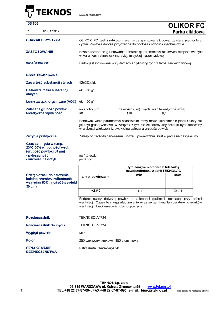www.teknos.com DS 006 2 OLIKOR FC 01.01.2017 Farba alkidowa CHARAKTERYSTYKA OLIKOR FC jest szybkoschnącą farbą gruntową alkidową, zawierającą fosforan cynku. Powłoka dobrze przyczepna do podłoża i odporna mechanicznie. ZASTOSOWANIE Przeznaczona do gruntowania konstrukcji i elementów stalowych eksploatowanych w warunkach atmosfery morskiej, miejskiej i przemysłowej. WŁAŚCIWOŚCI Farba jest stosowana w systemach antykorozyjnych z farbą nawierzchniową. DANE TECHNICZNE Zawartość substancji stałych 42±2% obj. Całkowita masa substancji stałych ok. 800 g/l Lotne związki organiczne (VOC) ok. 450 g/l Zalecana grubość powłoki i teoretyczna wydajność na sucho (µm) 50 na mokro (µm) wydajność teoretyczna (m2/l) 119 8,4 Ponieważ wiele parametrów właściwości farby może ulec zmianie jeżeli nałoży się jej zbyt grubą warstwę, w związku z tym nie zalecamy aby produkt był aplikowany w grubości większej niż dwukrotna zalecana grubość powłoki. Zużycie praktyczne Zależy od techniki nanoszenia, rodzaju powierzchni, strat w procesie natrysku itp. Czas schnięcia w temp. 23oC/50% wilgotności wzgl. (grubość powłoki 50 µm) - pyłosuchość - suchość na dotyk po 1,5 godz. po 3 godz. Odstęp czasu do nałożenia kolejnej warstwy (wilgotność względna 50%, grubość powłoki 50 µm) temp. powierzchni +23oC tym samym materiałem lub farbą nawierzchniową z serii TEKNOLAC min. max 6h 10 dni Podane czasy dotyczą powłoki o zalecanej grubości, schnącej przy dobrej wentylacji. Czasy te mogą ulec zmianie wraz ze zamianą temperatury, warunków wentylacji, ilości warstw i grubości pokrycia. 1 Rozcieńczalnik TEKNOSOLV 724 Rozcieńczalnik do mycia TEKNOSOLV 724 Wygląd powłoki Mat Kolor 250 czerwony tlenkowy, 850 aluminiowy OZNAKOWANIE BEZPIECZEŃSTWA Patrz Karta Charakterystyki TEKNOS Sp. z o.o. www.teknos.pl 03-885 WARSZAWA ul. Księcia Ziemowita 59 TEL +48 22 67-87-004; FAX +48 22 67-87-995; e-mail: [email protected] ciąg dalszy na następnej stronie OLIKOR FC SPOSÓB STOSOWANIA Przygotowanie podłoża DS 006 - 2 strona 2 Przed czyszczeniem zaleca się zmycie powierzchni wodą z dodatkiem OLICLEAN 123, a następnie spłukanie czystą wodą. Powierzchnia stalowa oczyszczona do stopnia czystości co najmniej St 3 wg PN-ISO 8501-1; powierzchnia sucha, pozbawiona tłuszczu i kurzu. Warunki podczas nakładania Powierzchnia do malowania musi być sucha. Temperatura otaczającego powietrza, malowanej powierzchni i farby powinna być wyższa niż +5°C, a wilgotność względna powietrza poniżej 80% zarówno podczas malowania jak i w czasie schnięcia wyrobu. Dodatkowo, temperatura malowanej powierzchni oraz farby musi być wyższa co najmniej o +3oC od temperatury punktu rosy otaczającego powietrza oraz musi być zapewniona dobra wentylacja. Nakładanie Farbę przed użyciem dokładnie wymieszać. Nanosić natryskiem bezpowietrznym lub pędzlem. Średnica dyszy do natrysku bezpowietrznego 0.013 - 0.017". INFORMACJE DODATKOWE Informacje dotyczące przechowywania umieszczone są na etykietce towaru. Farbę przechowywać w chłodnym pomieszczeniu, w opakowaniach szczelnie zamkniętych. Dodatkowe informacje na temat przygotowania powierzchni można znaleźć w normie ISO 12944-4 i ISO 8501-2. Informacje zawarte w karcie danych zostały stworzone w oparciu o badania laboratoryjne i praktyczne doświadczenie. Nie mając wpływu na warunki aplikacji jak również sposób postępowania możemy brać odpowiedzialność wyłącznie za jakość wyrobu i gwarantować, że odpowiada on naszym normom. Nie bierzemy również odpowiedzialności za straty lub uszkodzenia powstałe w wyniku nanoszenia wyrobów niezgodnie z zaleceniami lub z powodu niewłaściwego ich użycia. Produkt przeznaczony jest do użytku profesjonalnego. Oznacza to, że użytkownik posiada wystarczającą wiedzę do korzystania z produktu przestrzegając ściśle warunków technicznych i bezpieczeństwa pracy. Najnowsze wersje kart danych technicznych i charakterystyki znajdują się na stronie: www.teknos.com 2 TEKNOS Sp. z o.o. www.teknos.pl 03-885 WARSZAWA ul. Księcia Ziemowita 59 TEL +48 22 67-87-004; FAX +48 22 67-87-995; e-mail: [email protected]