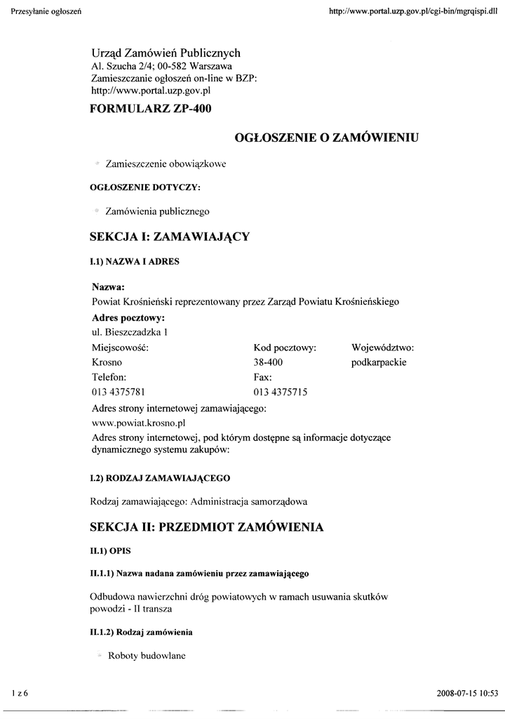 formularz zp-400 ogłoszenie o zamówieniu sekcja ii