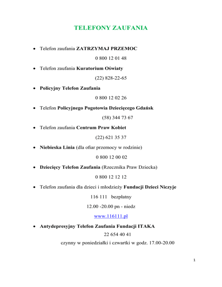 TELEFONY ZAUFANIA Telefon zaufania ZATRZYMAJ PRZEMOC 0 800 12 01 48 Telefon zaufania Kuratorium Oświaty (22) 828-22-65 Policyjny Telefon Zaufania 0 800 12 02 26 Telefon Policyjnego Pogotowia Dziecięcego Gdańsk (58) 344 73 67 Telefon zaufania Centrum Praw Kobiet (22) 621 35 37 Niebieska Linia (dla ofiar przemocy w rodzinie) 0 800 12 00 02 Dziecięcy Telefon Zaufania (Rzecznika Praw Dziecka) 0 800 12 12 12 Telefon zaufania dla dzieci i młodzieży Fundacji Dzieci Niczyje 116 111 bezpłatny 12.00 -20.00 pn - niedz www.116111.pl Antydepresyjny Telefon Zaufania Fundacji ITAKA 22 654 40 41 czynny w poniedziałki i czwartki w godz. 17.00-20.00 1 Infolinia dla osób z problemami psychicznymi lub dla ich rodzin (pod patronatem PTP) (22) 885 84 83 pn. – pt. 11 - 19 Stowarzyszenie Gdański Telefon Zaufania „Anonimowy Przyjaciel” (58) 301 00 00 E-mail: [email protected] godziny kontaktu: codziennie w godz. 16.00 – 6.00 Młodzieżowy Telefon Zaufania w Gdańsku (58) 551 92 89 PRZEMOC SEKSUALNA Ogólnopolska grupa wsparciowo – terapeutyczna dla kobiet molestowanych w dzieciństwie 0 666 283 283 [email protected] http://www.survivors.pl/ NARKOTYKI Telefon Zaufania Monar (58) 302 04 42 Pomoc Rodzinie Pogotowie Makowe 0 801 10 96 96 Antynarkotykowy Telefon Zaufania 0 801 199 990 Antynarkotykowa Poradnia Internetowa www.narkomania.org.pl 2 CYBERPRZEMOC HELPLINE www.helpline.org.pl 0 800 100 100 www.saferinternet.pl www.sieciaki.pl www.dyzurnet.pl 3