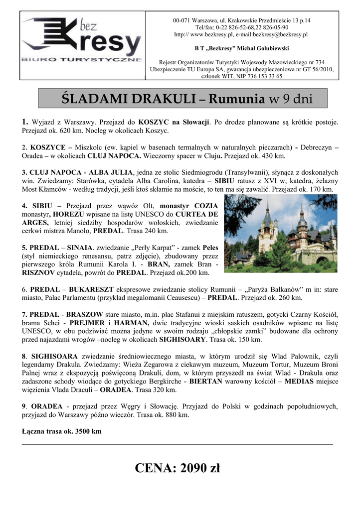 00-071 Warszawa, ul. Krakowskie Przedmieście 13 p.14 Tel/fax: 0-22 826-52-68,22 826-05-90 http:// www.bezkresy.pl, e-mail:[email protected] B T „Bezkresy” Michał Golubiewski Rejestr Organizatorów Turystyki Wojewody Mazowieckiego nr 734 Ubezpieczenie TU Europa SA, gwarancja ubezpieczeniowa nr GT 56/2010, członek WIT, NIP 736 153 33 65 ŚLADAMI DRAKULI – Rumunia w 9 dni 1. Wyjazd z Warszawy. Przejazd do KOSZYC na Słowacji. Po drodze planowane są krótkie postoje. Przejazd ok. 620 km. Nocleg w okolicach Koszyc. 2. KOSZYCE – Miszkolc (ew. kąpiel w basenach termalnych w naturalnych pieczarach) - Debreczyn – Oradea – w okolicach CLUJ NAPOCA. Wieczorny spacer w Cluju. Przejazd ok. 430 km. 3. CLUJ NAPOCA - ALBA JULIA, jedna ze stolic Siedmiogrodu (Transylwanii), słynąca z doskonałych win. Zwiedzamy: Starówka, cytadela Alba Carolina, katedra – SIBIU ratusz z XVI w, katedra, żelazny Most Kłamców - według tradycji, jeśli ktoś skłamie na moście, to ten ma się zawalić. Przejazd ok. 170 km. 4. SIBIU – Przejazd przez wąwóz Olt, monastyr COZIA monastyr, HOREZU wpisane na listę UNESCO do CURTEA DE ARGES, letniej siedziby hospodarów wołoskich, zwiedzanie cerkwi mistrza Manolo, PREDAL. Trasa 240 km. 5. PREDAL – SINAIA. zwiedzanie „Perły Karpat” - zamek Peles (styl niemieckiego renesansu, patrz zdjęcie), zbudowany przez pierwszego króla Rumunii Karola I. - BRAN, zamek Bran RISZNOV cytadela, powrót do PREDAL. Przejazd ok.200 km. 6. PREDAL – BUKARESZT ekspresowe zwiedzanie stolicy Rumunii – „Paryża Bałkanów” m in: stare miasto, Pałac Parlamentu (przykład megalomanii Ceausescu) – PREDAL. Przejazd ok. 260 km. 7. PREDAL - BRASZOW stare miasto, m.in. plac Stafanui z miejskim ratuszem, gotycki Czarny Kościół, brama Schei - PREJMER i HARMAN, dwie tradycyjne wioski saskich osadników wpisane na listę UNESCO, w obu podziwiać można jedyne w swoim rodzaju „chłopskie zamki” budowane dla ochrony przed najazdami wrogów –nocleg w okolicach SIGHISOARY. Trasa ok. 150 km. 8. SIGHISOARA zwiedzanie średniowiecznego miasta, w którym urodził się Wlad Palownik, czyli legendarny Drakula. Zwiedzamy: Wieża Zegarowa z ciekawym muzeum, Muzeum Tortur, Muzeum Broni Palnej wraz z ekspozycją poświęconą Drakuli, dom, w którym przyszedł na świat Wlad - Drakula oraz zadaszone schody wiodące do gotyckiego Bergkirche - BIERTAN warowny kościół – MEDIAS miejsce więzienia Vlada Draculi – ORADEA. Trasa 320 km. 9. ORADEA - przejazd przez Węgry i Słowację. Przyjazd do Polski w godzinach popołudniowych, przyjazd do Warszawy późno wieczór. Trasa ok. 880 km. Łączna trasa ok. 3500 km CENA: 2090 zł TERMIN: 02.07 - 10.07.2011 INFORMACJE: ŚWIADCZENIA ZAWARTE W CENIE: 8 noclegów w hotelach w pokojach dwuosobowych (ewentualnie na życzenie w miarę możliwości również część pokoi trzyosobowych) z łazienkami wyżywienie: 8 śniadań, 8 kolacji transport autokarem o wysokim standardzie przy długich przejazdach obecność dwóch kierowców pilot polski na całej trasie opłaty graniczne, parkingi i ekologiczne ubezpieczenie NNW i KL VAT CENA NIE ZAWIERA: opłaty za wejścia do zwiedzanych obiektów - ok. min. 60 Euro dopłata do pokoju jednoosobowego wynosi – 545 PLN UWAGA: Wycieczka zostanie zrealizowana przy zgłoszeniu się min. 30 osób 30 dni przed rozpoczęciem imprezy. Przy zgłoszeniu się mniejszej ilości osób wycieczka zostanie odwołana. biuro zastrzega sobie prawo do wprowadzania niewielkich zmian w programie oraz zmiany w cenie po istotnych wahaniach kursu dolara. UWAGA: Nigdy nie ma nocnych przejazdów a każdy nocleg przewiduje pełną ilość godzin wypoczynku.