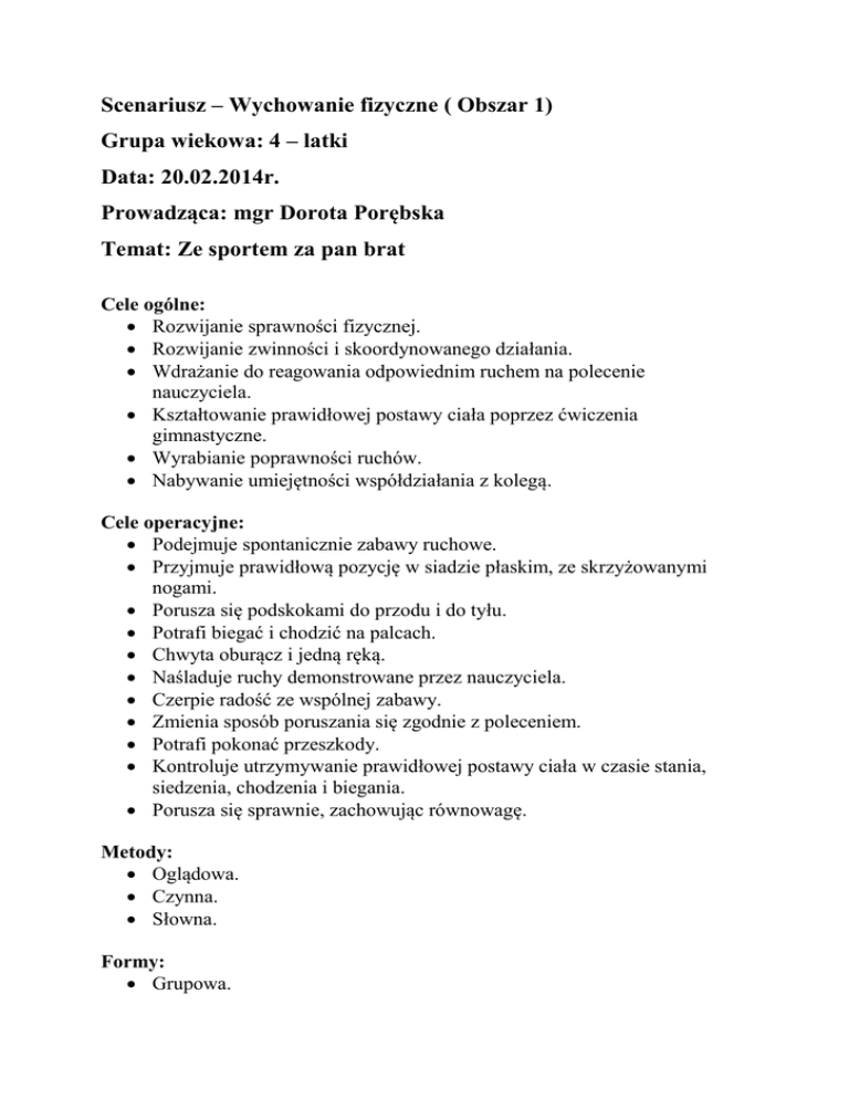 Scenariusz – Wychowanie fizyczne ( Obszar 1) Grupa wiekowa: 4