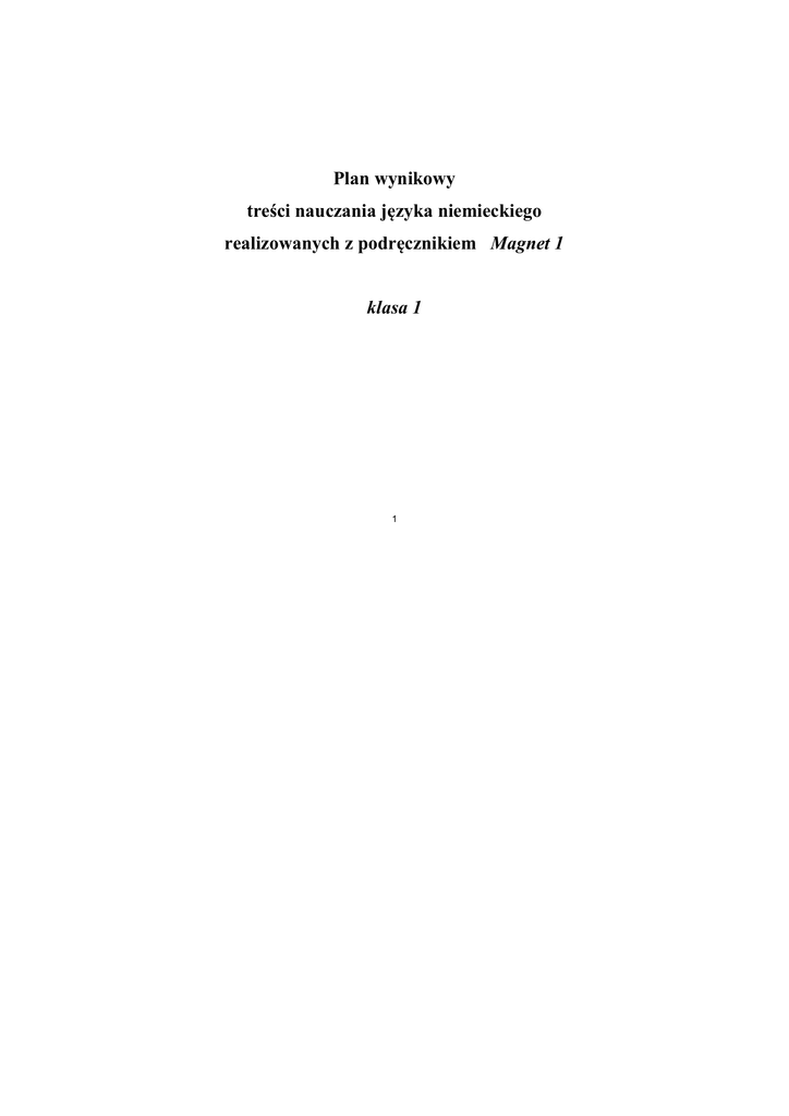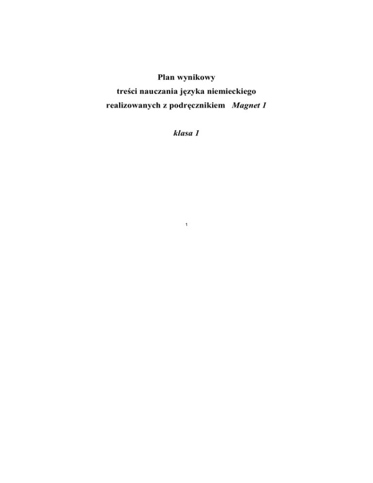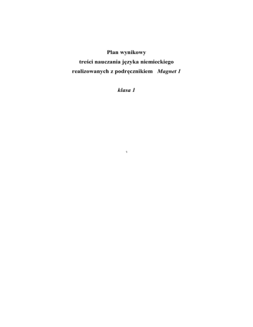 Plan wynikowy treści nauczania języka niemieckiego realizowanych z podręcznikiem Magnet 1 klasa 1 1 Magnet 1 Plan wynikowy do kursu Magnet 1 Tematy, teksty, sytuacje Liczba lekcji Wymagania edukacyjne Środki językowe Materiał podręcznikowy Guter Start! Hallo! Wie geht‘s? Eins, zwei, drei 2 3 Uczeń o umiejętnościach na poziomie podstawowym: – stosuje typowe zwroty na powitane i pożegnanie – przyporządkowuje usłyszane zwroty do osób, automatyzuje prawidłową wymowę – pyta o samopoczucie – określa swoje samopoczucie – prowadzi krótkie dialogi według wzoru Uczeń o umiejętnościach na poziomie podstawowym: – zna i aktywnie stosuje liczebniki główne do 20 – pyta o cenę produktu – podaje ceny wybranych produktów – notuje usłyszane numery telefonów – zakreśla usłyszane ceny Podręcznik str. 6-9 Ćwiczenia str. 4-6 – liczebniki od 0-100 – szyk zadania prostego i pytającego Podręcznik str. 10-12 Ćwiczenia str. 7-9 Uczeń o umiejętnościach na poziomie ponadpodstawowym: – samodzielnie prowadzi krótkie dialogi, wykorzystując podane zwroty i wyrażenia Was ist das? 2 Uczeń o umiejętnościach na poziomie podstawowym: – przyporządkowuje odpowiednio usłyszane nazwy do zdjęć – nazywa przedmioty i ich cechy – identyfikuje kolory – identyfikuje rodzajniki określone i nieokreślone i przeczenie kein – zna alfabet niemiecki – rodzajnik określony i nieokreślony w mianowniku – przeczenie kein Podręcznik str. 12-15 Ćwiczenia str. 10-13 Uczeń o umiejętnościach na poziomie ponadpodstawowym: – opisuje krótko wybrane przedmioty – prowadzi samodzielnie krótkie dialogi 2 Tematy, teksty, sytuacje Liczba lekcji Infobox Landeskunde 1 Wymagania edukacyjne Środki językowe Uczeń o umiejętnościach na poziomie podstawowym: – czas Perfekt – rozróżnia powitania i pożegnania charakterystyczne dla różnych rejonów Niemiec i pozostałych krajów DACH Materiał podręcznikowy Podręcznik str. 16 Uczeń o umiejętnościach na poziomie ponadpodstawowym: – wyszukuje w Internecie inne typowe powitania i pożegnania Rozdział 1: Das bin ich Ich wohne in Berlin 2 Uczeń o umiejętnościach na poziomie podstawowym: – zna nazwy i identyfikuje na mapie niektóre miasta krajów DACH – przyporządkowuje na podstawie wysłuchanego tekstu opisy miast do fotografii – przedstawia się – pyta inną osobę o imię, nazwisko, miejsce zamieszkania, wiek – rekonstruuje dialogi, wykorzystując podane słownictwo Uczeń o umiejętnościach na poziomie ponadpodstawowym: – wyszukuje w Internecie informacje o wybranym mieście i prezentuje je podczas lekcji – prowadzi samodzielnie dialogi, wykorzystując poznane słownictwo 3 – odmiana czasowników w liczbie pojedynczej – zdania pytające i oznajmujące Podręcznik str. 18-20 Ćwiczenia str. 14-15 Wo liegt Hamburg? 2 Uczeń o umiejętnościach na poziomie podstawowym: – zna nazwy i identyfikuje na mapie kraje DACH – określa położenie miast – potwierdza lub zaprzecza – określa pochodzenie innych osób – identyfikuje zdania oznajmujące i pytające – pyta o pochodzenie i miejsce zamieszkania – zdania pytające i oznajmujące – zaimki osobowe w liczbie pojedynczej Podręcznik str. 21-23 Ćwiczenia str. 15-18 Uczeń o umiejętnościach na poziomie ponadpodstawowym: – opowiada o wybranej osobie – prawidłowo stosuje zdania pytające i oznajmujące Tematy, teksty, sytuacje Liczba lekcji Wie ist deine Adresse? 2 Wymagania edukacyjne Środki językowe Uczeń o umiejętnościach na poziomie podstawowym: – pyta o miejsce zamieszkania i adres internetowy – dopasowuje usłyszane wypowiedzi do osób – automatyzuje w ćwiczeniach odmianę czasowników w liczbie pojedynczej – pisze dyktando – notuje usłyszane informacje o osobach Materiał podręcznikowy Podręcznik str. 24-25 Ćwiczenia str. 19-21 Uczeń o umiejętnościach na poziomie ponadpodstawowym: – prawidłowo stosuje czasowniki – opowiada o sobie i wybranej osobie z podręcznika Infobox Landeskunde: Nazwy miast 1 Uczeń zna nazwy miast krajów DACH i ich polskie odpowiedniki 1 Uczeń o umiejętnościach na poziomie podstawowym: – nazywa sposoby spędzania wolnego czasu – zaznacza usłyszane czynności – określa swoje zainteresowania i swoje hobby Podręcznik str. 26 Rozdział 2: Meine Hobbys Freizeitaktivitäten – odmiana czasowników Podręcznik str. 28-29 Ćwiczenia str. 22-23 Uczeń o umiejętnościach na poziomie ponadpodstawowym: – opowiada o swoim hobby 4 – udziela informacji o hobby innych osób w klasie Was machst du in deiner Freizeit? 2 Uczeń o umiejętnościach na poziomie podstawowym: – odpowiada na pytania na podstawie wysłuchanego tekstu – pyta inne osoby o ich zainteresowania i hobby – wyraża upodobania – wyraża opinię na temat sposobów spędzania czasu wolnego, wykorzystując podane słownictwo – zaimki dzierżawcze – szyk przestawny w zdaniu oznajmującym Podręcznik str. 30-31 Ćwiczenia str. 23-24 Uczeń o umiejętnościach na poziomie ponadpodstawowym: – opowiada o sposobach spędzania wolnego czasu – prowadzi samodzielnie dialogi, wykorzystując poznane słownictwo Tematy, teksty, sytuacje Welche Sprachen sprichst du? Liczba lekcji 2 Wymagania edukacyjne Środki językowe Uczeń o umiejętnościach na poziomie podstawowym: – odpowiada na pytania na podstawie wysłuchanego tekstu – nazywa języki obce – określa swoje umiejętności, stosując podane słownictwo – uzupełnia tabelę wysłuchanymi informacjami – prowadzi dialogi według wzoru – opisuje krótko osoby, wykorzystując podane o nich informacje – wyraża życzenia, stosując konstrukcję ich möchte – konstrukcja ich möchte – czasowniki nieregularne Materiał podręcznikowy Podręcznik str. 32 Ćwiczenia str. 24-27 Uczeń o umiejętnościach na poziomie ponadpodstawowym: – przeprowadza ankietę w klasie i prezentuje jej wyniki – charakteryzuje osoby i ich z