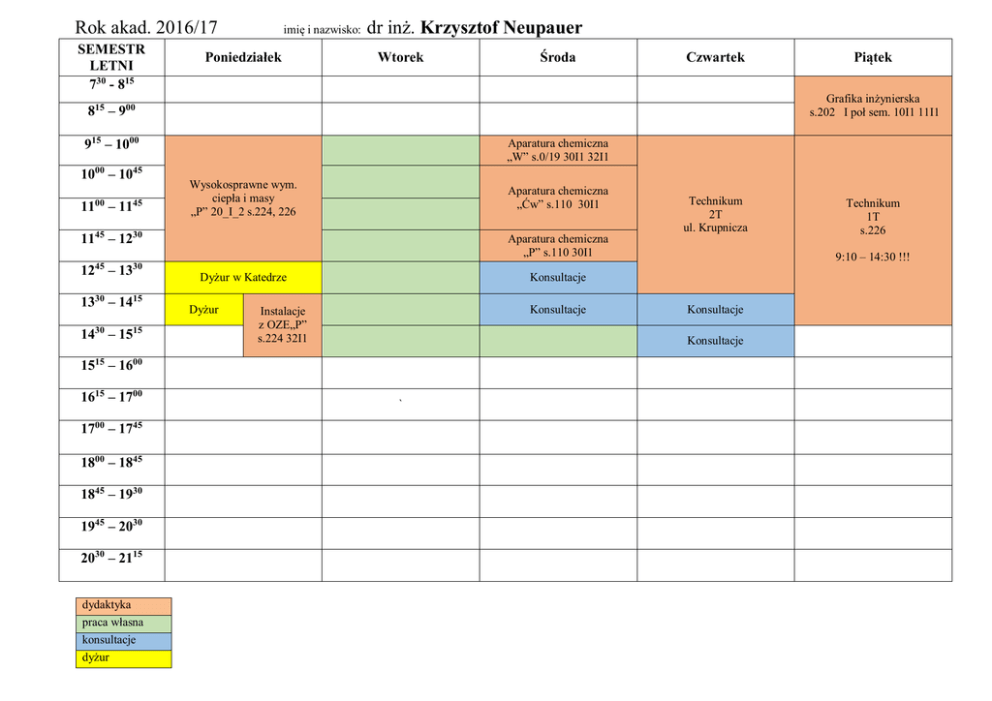 Rok akad. 2016/17 SEMESTR LETNI 730 - 815 imię i nazwisko: Poniedziałek dr inż. Krzysztof Neupauer Wtorek Środa Czwartek Grafika inżynierska s.202 I poł sem. 10I1 11I1 815 – 900 915 – 1000 1000 – 1045 00 45 11 – 11 Aparatura chemiczna „W” s.0/19 30I1 32I1 Wysokosprawne wym. ciepła i masy „P” 20_I_2 s.224, 226 Aparatura chemiczna „Ćw” s.110 30I1 1145 – 1230 1245 – 1330 1330 – 1415 1430 – 1515 1700 – 1745 1800 – 1845 1845 – 1930 1945 – 2030 2030 – 2115 dydaktyka praca własna konsultacje dyżur Technikum 2T ul. Krupnicza Aparatura chemiczna „P” s.110 30I1 Dyżur w Katedrze Dyżur Konsultacje Instalacje z OZE„P” s.224 32I1 Konsultacje Konsultacje ` Technikum 1T s.226 9:10 – 14:30 !!! Konsultacje 1515 – 1600 1615 – 1700 Piątek