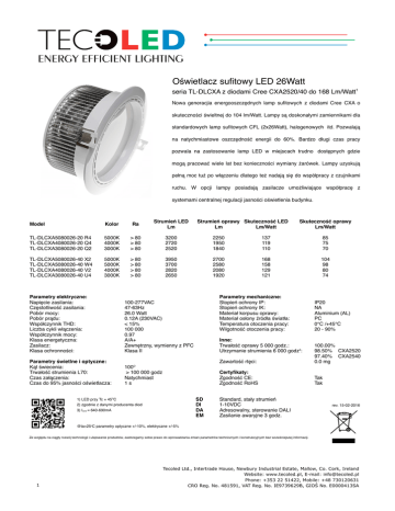 Oświetlacz sufitowy LED 26Watt seria TL-DLCXA z diodami Cree CXA2520/40 do 168 Lm/Watt1 Nowa generacjia energooszczędnych lamp sufitowych z diodami Cree CXA o skuteczności świeltnej do 104 lm/Watt. Lampy są doskonałymi zamiennikami dla standardowych lamp sufitowych CFL (2x26Watt), halogenowych itd. Pozwalają na natychmiastowe oszczędność energii do 60%. Bardzo długi czas pracy pozwala na zastosowanie lamp LED w miejscach trudno dostępnych gdzie mogą pracować wiele lat bez konieczności wymiany żarówek. Lampy uzyskują pełną moc tuż po włączeniu dlatego też nadają się do współpracy z czujnikami ruchu. W opcji lampy posiadają zasilacze umożliwiające współpracę z systemami centralnej regulacji jasności oświetlenia budynku. Model Kolor Ra Strumień LED Lm TL-DLCXA5080026-20 R4 TL-DLCXA4080026-20 Q4 TL-DLCXA3080026-20 Q2 5000K 4000K 3000K > 80 > 80 > 80 3200 2720 2520 2250 1950 1840 137 119 110 85 75 70 TL-DLCXA5080026-40 X2 TL-DLCXA5080026-40 W4 TL-DLCXA4080026-40 V2 TL-DLCXA3080026-40 U4 5000K 5000K 4000K 3000K > 80 > 80 > 80 > 80 3950 3700 2820 2650 2700 2580 2080 1920 168 158 129 121 104 98 80 74 Parametry elektryczne: Napięcie zasilania: Częstotliwość zasilania: Pobór mocy: Pobór prądu: Współczynnik THD: Liczba cykli włączenia: Współczynnik mocy: Klasa energetyczna: Zasilacz: Klasa ochronności: 100-277VAC 47-63Hz 26.0 Watt 0.12A (230VAC) < 15% 100 000 0.97 A/A+ Zewnętrzny, wymienny z PFC Klasa II Parametry świetlne i optyczne: Kąt świecenia: Trwałość strumienia L70: Czas załączenia: Czas do 95% jasności oświetlacza: 100O > 100 000 godz Natychmiast 1s Śtrumień oprawy Skuteczność LED Lm Lm/Watt Parametry mechaniczne: Stopień ochrony IP: Stopień ochrony IK: Materiał korpusu oprawy: Materiał osłony źródła światła: Temperatura otoczenia pracy: Wilgotność otoczenia pracy: Inne: Trwałość oprawy 5 000 godz.: Utrzymanie strumienia 6 000 godz2: SD DI DA EM 1) LED przy Tc = 45OC 2) zgodnie z danymi producenta diod 3) ILED = 640-690mA Skuteczność oprawy Lm/Watt IP20 NA Aluminium (AL) PC 0°C /+45°C 20 - 90% Zawartość rtęci: 100.00% 98.50% CXA2520 97.40% CXA2540 0.0 mg Certyfikaty: Zgodność CE: Zgodność RoHS Tak Tak Standard, stały strumień 1-10VDC Adresowalny, sterowanie DALI Zasilanie awaryjne 3 godz. rev. 15-02-2016 @ta=25oC parametry optyczne +/-10%, elektryczne +/-5% Ze względu na ciągły rozwój technologii i ulepszanie produktów, zastrzegamy sobie prawo do wprowadzania zmian parametrów technicznych i konstrukcyjnych bez wcześniejszej informacji. 1 Tecoled Ltd., Intertrade House, Newbury Industrial Estate, Mallow, Co. Cork, Ireland Website: www.tecoled.pl, E-mail: [email protected] Phone: +353 22 51422, Mobile: +48 730120631 CRO Reg. No. 481591, VAT Reg. No. IE9739629B, GIOŚ No. E0000413SA Oświetlacz sufitowy LED 36Watt seria TL-DLCXA z diodami Cree CXA2520/40 do 152 Lm/Watt1 Nowa generacjia energooszczędnych lamp sufitowych z diodami Cree CXA o skuteczności świeltnej do 95 lm/Watt. Lampy są doskonałymi zamiennikami dla standardowych lamp sufitowych CFL (2x32Watt), halogenowych itd. Pozwalają na natychmiastowe oszczędność energii do 60%. Bardzo długi czas pracy pozwala na zastosowanie lamp LED w miejscach trudno dostępnych gdzie mogą pracować wiele lat bez konieczności wymiany żarówek. Lampy uzyskują pełną moc tuż po włączeniu dlatego też nadają się do współpracy z czujnikami ruchu. W opcji lampy posiadają zasilacze umożliwiające współpracę z systemami centralnej regulacji jasności oświetlenia budynku. Model Kolor Ra Strumień LED Lm TL-DLCXA5080036-20 R4 TL-DLCXA4080036-20 Q4 TL-DLCXA3080036-20 Q2 5000K 4000K 3000K > 80 > 80 > 80 3850 3350 3120 2820 2450 2280 123 107 99 78 68 63 TL-DLCXA5080036-40 X2 TL-DLCXA5080036-40 W4 TL-DLCXA4080036-40 V2 TL-DLCXA3080036-40 U4 5000K 5000K 4000K 3000K > 80 > 80 > 80 > 80 4900 4700 3550 3300 3420 3340 2600 2420 152 149 117 110 95 93 73 68 Parametry elektryczne: Napięcie zasilania: Częstotliwość zasilania: Pobór mocy: Pobór prądu: Współczynnik THD: Liczba cykli włączenia: Współczynnik mocy: Klasa energetyczna: Zasilacz: Klasa ochronności: 100-277VAC 47-63Hz 36.0 Watt 0.17A (230VAC) < 15% 100 000 0.94 A/A+ Zewnętrzny, wymienny z PFC Klasa II Parametry świetlne i optyczne: Kąt świecenia: Trwałość strumienia L70: Czas załączenia: Czas do 95% jasności oświetlacza: 100O > 100 000 godz Natychmiast 1s Śtrumień oprawy Skuteczność LED Lm Lm/Watt Skuteczność oprawy Lm/Watt Parametry mechaniczne: Stopień ochrony IP: Stopień ochrony IK: Materiał korpusu oprawy: Materiał osłony źródła światła: Temperatura otoczenia pracy: Wilgotność otoczenia pracy: Inne: Trwałość oprawy 5 000 godz.: Utrzymanie strumienia 6 000 godz2: Zawartość rtęci: 100.00% 98.50% CXA2520 97.40% CXA2540 0.0 mg Certyfikaty: Zgodność CE: Zgodność RoHS Tak Tak CXA2540 SD DI DA EM 1) LED przy Tc = 55OC 2) zgodnie z danymi producenta diod 3) ILED = 850-940mA IP20 NA Aluminium (AL) PC 0°C /+45°C 20 - 90% Standard, stały strumień 1-10VDC Adresowalny, sterowanie DALI Zasilanie awaryjne 3 godz. rev. 15-02-2016 @ta=25oC parametry optyczne +/-10%, elektryczne +/-5% Ze względu na ciągły rozwój technologii i ulepszanie produktów, zastrzegamy sobie prawo do wprowadzania zmian parametrów technicznych i konstrukcyjnych bez wcześniejszej informacji. 2 Tecoled Ltd., Intertrade House, Newbury Industrial Estate, Mallow, Co. Cork, Ireland Website: www.tecoled.pl, E-mail: [email protected] Phone: +353 22 51422, Mobile: +48 730120631 CRO Reg. No. 481591, VAT Reg. No. IE9739629B, GIOŚ No. E0000413SA Oświetlacz sufitowy LED 26/36Watt - wymiary: Wymiary i masa: Waga oprawy z zasilaczem: Wymiary oprawy: Średnica otworu montażowego: 1.65 Ø240x110 mm Ø210 mm CXA2520 CXA2540 rev. 15-02-2016 Ze względu na ciągły rozwój technologii i ulepszanie produktów, zastrzegamy sobie prawo do wprowadzania zmian parametrów technicznych i kon