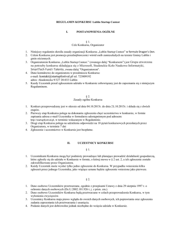 REGULAMIN KONKURSU Lublin Startup Contest I. POSTANOWIENIA OGÓLNE § 1. Cele Konkursu, Organizator 1. 2. 3. Niniejszy regulamin określa zasady organizacji Konkursu „Lublin Startup Contest” w formule Dragon’s Den. Celem Konkursu jest promocja przedsiębiorczości wśród osób zamieszkałych na terenie Gminy Lublin i gmin ościennych. Organizatorem Konkursu „Lublin Startup Contest.” (zwanego dalej “Konkursem”) jest Grupa utworzona na potrzeby konkursu składająca się z Microsoft, Studenckie Koło Naukowe Informatyki, SmartTech Fund i Talento, zwana dalej "Organizatorem". 4. Dane kontaktowe do organizatora w przedmiocie Konkursu: e-mail: [email protected] tel. 723809192 adres: Akademicka 9/327 20-033 Lublin 5. Kazdy Uczestnik przed zgłoszeniem udziału w Konkursie zobowiązany jest do zapoznania się z niniejszym Regulaminem. § 2. Zasady ogólne Konkursu Konkurs przeprowadzany jest w okresie od dnia 04.10.2015r. do dnia 21.10.2015r. i składa się z dwóch etapów. 2. Pierwszy etap Konkursu polega na dokonaniu zgłoszenia chęci uczestnictwa w konkursie, w formie zapisania adresu e-mail Uczestnika w formularzu udostępnionym pod adresem: http://startupfestival.pl, w terminie wskazanym w Regulaminie. 3. Drugi etap Konkursu polega na udzieleniu odpowiedzi na 10 pytań konkursowych przesłanych przez Organizatora, w terminie 7 dni 4. Zgłoszenie i uczestnictwo w Konkursie jest bezpłatne. 1. II. UCZESTNICY KONKURSU § 1. 1. 2. Uczestnikami Konkursu mogą być podmioty prowadzące lub planujące prowadzić działalność gospodarczą, które zgłosiły się do udziału w Konkursie w formie, o której mowa w § 2 ust. 2, a ich zgłoszenie zostało zakwalifikowane przez Organizatora. Każdy Uczestnik może wysłać tylko jedno zgłoszenie do Konkursu. W przypadku wniesienia kilku zgłoszeń przez jednego Uczestnika, jako wiążące uznane będzie zgłoszenie wniesione jako pierwsze. § 2. 1. 2. 3. 4. Dane osobowe Uczestników przetwarzane, zgodnie z przepisami Ustawy z dnia 29 sierpnia 1997 r. o ochronie danych osobowych (Dz.U.2002.101.926 t. j. z pózn. zm.). Dane osobowe Uczestników Konkursu będą przetwarzane w celach przeprowadzenia Konkursu, w tym wyłonienia zwycięzców. Uczestnicy Konkursu maja prawo wglądu do swoich danych osobowych, ich poprawiania oraz zgłoszenia zadania zaprzestania ich przetwarzania i usunięcia. Podanie danych jest dobrowolne jednak niezbędne do wzięcia udziału w Konkursie. 5. 6. 7. Zgromadzone dane podlegają starannej ochronie, zgodnie z obowiązującymi przepisami. Użytkownik zobowiązany jest podać prawdziwe dane w formularzu zgłoszeniowym. Organizator nie ponosi odpowiedzialności za konsekwencje podania nieprawidłowych danych. Zgoda na przetwarzanie danych osobowych Uczestnika Konkursu obejmuje także publikacje imienia i nazwiska Uczestnika Konkursu na liście finalistów pierwszego etapu oraz laureatów drugiego etapu. III. PRZEBIEG KONKURSU § 1. Zgłoszenia 1. 2. 3. 4. Początek przyjmowania zgłoszeń konkursowych nastąpi w dniu 04 października 2015r. Zakończenie przyjmowania zgłoszeń konkursowych nastąpi w dniu 18 października 2015 r. o godz. 23.59. Odpowiedzi, o których mowa w § 2 ust. 3, Uczestnik musi przesłać do dnia 17 października 2015 r., do godz. 23.59, pod rygorem skreślenia z listy Uczestników. Ogłoszenie Laureatów Drugiego Etapu Konkursu nastąpi najpóźniej w dniu 20 października 2015 r., i zostanie dokonane droga mailowa lub telefoniczna. § 2. Komisja Konkursowa 1. 2. W drugim etapie organem oceniającym jest Komisja Konkursowa. W skład Komisji wchodzą: a) Dwóch przedstawicieli od Organizatora, b) Przedstawiciel Microsoft c) przedstawiciel środowiska lubelskich przedsiębiorców. Komisja wybiera Sekretarza, który protokołuje przebieg obrad Komisji Konkursowej oraz dokonuje ogłoszeń wyników. § 3. A. Zadanie konkursowe – Drugi Etap 1. 2. 3. 4. Zadaniem postawionym przed Uczestnikami w drugim etapie Konkursu jest przedstawienie własnego projektu lub pomysłu biznesowego związanego z tematem Konkursu i udzielenie odpowiedzi na pytania Konkursowe. Każdy Uczestnik otrzyma identyczny zestaw pytań. Pytania Konkursowe przesłane będą na podany przez Uczestnika podczas pierwszego etapu Konkursu, adres mailowy. Uczestnik udziela odpowiedzi w wyznaczonym w Regulaminie terminie. Odpowiedzi powinny być przesłane w treści wiadomości e-mail lub jako załącznik w formacie .doc, .docx, .ppt, .pptx lub .pdf. na adres [email protected] Momentem dokonania udzielenia odpowiedzi jest moment wysłania wiadomości e-mail przez Uczestnika na adres, o którym mowa w zdaniu poprzednim. W drugim etapie Konkursu Komisja Konkursowa wybierze maksymalnie 60 projektów, które otrzymały najwyższa liczbę punktów. B. Prezentacja – Trzeci Etap 5. Zadaniem postawionym przed Uczestnikami w drugim etapie konkursu jest przygotowanie i przedstawienie 3 – 5 minutowej prezentacji (tzw. Pitch) dotyczącej projektu opisanego w pierwszym etapie Konkursu. Prezentacja może być przeprowadzona przy pomocy prezentacji multimedialnej, z elementami video, prototypów, gotowych produktów lub z użyciem innych pomocy. W przypadku konieczności wyświetlenia lub odtworzenia prezentacji na specjalistycznych urządzeniach, Uczestnik zobowiązany będzie do zapewnienia tych urządzeń lub wcześniejszej konsultacji z Organizatorem, co do możliwości zapewnienia takich warunków technicznych przez Organizatora. 6. Prezentacja, obok kryteriów wskazanych w § 3 ust. 5 powyżej, ocenia będzie także pod katem umiejętności przedstawienia i prezentacji projektu potencjalnym inwestorom, znajomości rynku i klientów, do których projekt jest kierowany, przeprowadzonej analizy sprzedażowej i biznesowej dla realizacji przedstawionego projektu. C. Laureaci 7. 8. 9. 10. Każdy uczestnik może uzyskać nagrodę od każdego przedstawiciela w jury. Nagrody dla Laureatów zostaną przygotowane w gestii każdego członka jury.