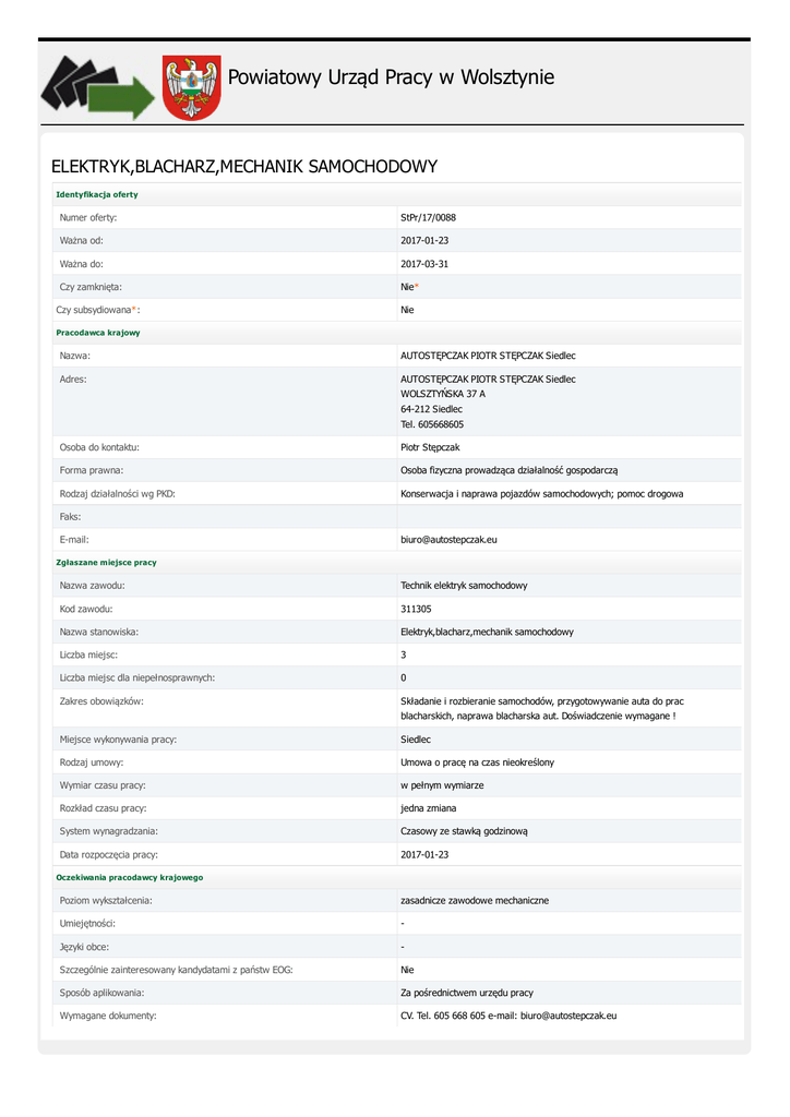 Powiatowy Urząd Pracy w Wolsztynie ELEKTRYK,BLACHARZ,MECHANIK SAMOCHODOWY Identyfikacja oferty Numer oferty: StPr/17/0088 Ważna od: 2017-01-23 Ważna do: 2017-03-31 Czy zamknięta: Nie* Czy subsydiowana*: Nie Pracodawca krajowy Nazwa: AUTOSTĘPCZAK PIOTR STĘPCZAK Siedlec Adres: AUTOSTĘPCZAK PIOTR STĘPCZAK Siedlec WOLSZTYŃSKA 37 A 64-212 Siedlec Tel. 605668605 Osoba do kontaktu: Piotr Stępczak Forma prawna: Osoba fizyczna prowadząca działalność gospodarczą Rodzaj działalności wg PKD: Konserwacja i naprawa pojazdów samochodowych; pomoc drogowa Faks: E-mail: [email protected] Zgłaszane miejsce pracy Nazwa zawodu: Technik elektryk samochodowy Kod zawodu: 311305 Nazwa stanowiska: Elektryk,blacharz,mechanik samochodowy Liczba miejsc: 3 Liczba miejsc dla niepełnosprawnych: 0 Zakres obowiązków: Składanie i rozbieranie samochodów, przygotowywanie auta do prac blacharskich, naprawa blacharska aut. Doświadczenie wymagane ! Miejsce wykonywania pracy: Siedlec Rodzaj umowy: Umowa o pracę na czas nieokreślony Wymiar czasu pracy: w pełnym wymiarze Rozkład czasu pracy: jedna zmiana System wynagradzania: Czasowy ze stawką godzinową Data rozpoczęcia pracy: 2017-01-23 Oczekiwania pracodawcy krajowego Poziom wykształcenia: zasadnicze zawodowe mechaniczne Umiejętności: - Języki obce: - Szczególnie zainteresowany kandydatami z państw EOG: Nie Sposób aplikowania: Za pośrednictwem urzędu pracy Wymagane dokumenty: CV. Tel. 605 668 605 e-mail: [email protected]