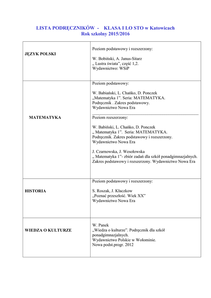 LISTA PODRĘCZNIKÓW - KLASA I LO STO w Katowicach Rok szkolny 2015/2016 Poziom podstawowy i rozszerzony: JĘZYK POLSKI W. Bobiński, A. Janus-Sitarz „ Lustra świata”, część 1,2. Wydawnictwo: WSiP Poziom podstawowy: MATEMATYKA W. Babiański, L. Chańko, D. Ponczek „Matematyka 1”. Seria: MATEMATYKA. Podręcznik . Zakres podstawowy. Wydawnictwo Nowa Era __________________________________________________ Poziom rozszerzony: W. Babiński, L. Chańko, D. Ponczek „ Matematyka 1”. Seria: MATEMATYKA. Podręcznik. Zakres podstawowy i rozszerzony. Wydawnictwo Nowa Era J. Czarnowska, J. Wesołowska „ Matematyka 1”- zbiór zadań dla szkół ponadgimnazjalnych. Zakres podstawowy i rozszerzony. Wydawnictwo Nowa Era Poziom podstawowy i rozszerzony: HISTORIA WIEDZA O KULTURZE S. Roszak, J. Kłaczkow „Poznać przeszłość. Wiek XX” Wydawnictwo Nowa Era W. Panek „Wiedza o kulturze”. Podręcznik dla szkół ponadgimnazjalnych. Wydawnictwo Polskie w Wołominie. Nowa podst.progr. 2012 Poziom podstawowy: Z. Smutek, J. Maleska „ Wiedza o społeczeństwie”. Zakres podstawowy. Seria „ Odkrywamy na nowo”. Wydawnictwo Operon ______________________________________________ Poziom rozszerzony: WIEDZA O SPOŁECZEŃSTWIE I okres : Z. Smutek, J. Maleska „ Wiedza o społeczeństwie”. Zakres podstawowy. Seria „ Odkrywamy na nowo”. Wydawnictwo Operon Od II okresu : J. Maleska, Z. Smutek, B. Surmacz „Wiedza o społeczeństwie”. Zakres rozszerzony. Seria „Odkrywamy na nowo”. Wydawnictwo Operon Poziom podstawowy: R. Puliszak,K. Wiedermann „Oblicza geografii”. Podręcznik do szkół ponadgimnazjalnych. Zakres podstawowy. Wydawnictwo Nowa Era ______________________________________________ Poziom rozszerzony: GEOGRAFIA I okres : Z. Zaniewicz „Geografia”. Seria „Ciekawi świata”. Podręcznik –zakres podstawowy. Wydawnictwo Operon od II okres: R. Malarz, M. Więckowski Seria „Oblicza geografii 1”. Podręcznik 1 - zakres rozszerzony. Wydawnictwo Nowa Era Poziom podstawowy: E. Bonat, W. Krzeszowiec-Jeleń i inni „Biologia na czasie 1”- zakres podstawowy. Wydawnictwo Nowa Era ____________________________________________ Poziom rozszerzony: BIOLOGIA I okres : E. Bonat, W. Krzeszowiec-Jeleń i inni „Biologia na czasie 1”. Zakres podstawowy Wydawnictwo Nowa Era od II okresu : M. Guzik, E. Jastrzębska i inni „ Biologia na czasie 1”. Zakres rozszerzony. Zakres rozszerzony. Podręcznik dla szkół ponadgimnazjalnych. Wydawnictwo Operon Poziom podstawowy: K. Pazdro, R. Szmigielski „ Chemia na co dzień”, Podręcznik - zakres podstawowy, Oficyna Wydawnicza Krzysztof Pazdro _______________________________________________ Poziom rozszerzony: CHEMIA I okres : K. Pazdro, R. Szmigielski „ Chemia na co dzień”, Podręcznik - zakres podstawowy, Oficyna Wydawnicza Krzysztof Pazdro od II okresu : K. Pazdro „Chemia. Fundamenty”. Podręcznik dla liceów i techników. Zakres rozszerzony. Oficyna Wydawnicza Krzysztof Pazdro Poziom podstawowy: FIZYKA Pod red. M. Fiałkowskiej „Świat fizyki”. Podręcznik dla szkół ponadgimnazjalnych. Zakres podstawowy. Wydawnictwo Zamkor/ obecnie WSiP FIZYKA Poziom rozszerzony – dwa podręczniki: I okres: Pod red. M. Fiałkowskiej „Świat fizyki”. Podręcznik dla szkół ponadgimnazjalnych. Zakres podstawowy. Wydawnictwo Zamkor/ obecnie WsiP II okres: Maria Fiałkowska, Barbara Sagnowska „ Z fizyką w przyszłość”. Podręcznik dla szkół ponadgimnazjalnych. Zakres rozszerzony. Część 1. Wydawnictwo Zamkor/ obecnie WSiP PRZEDSIĘBIORCZOŚĆ J. Korba, Z. Smutek „ Podstawy przedsiębiorczości”. Seria „Odkrywamy na nowo”. Podręcznik – szkoły ponadgimnazjalne. Wydawnictwo Operon ZAMAWIAJĄ NAUCZYCIELE WE WRZEŚNIU JĘZYK ANGIELSKI B. Czarnecka-Cicha, M. Kłos, A. Sikorzyńska „Gateway Plus 3” WYDAWNICTWO:Macmillan Lub J. Comyns-Carr, J. Parsons, P. Moran i inni “ My Matura Success” Wydawnictwo Pearson ZAMAWIAJĄ NAUCZYCIELE WE WRZEŚNIU JĘZYK FRANCUSKI JĘZYK HISZPAŃSKI C. Himber, F. Gallon, C. Marguart- Martin, K. Grau „ En Action 1” , Wydawnictwo Hachette FLE I. Bueso, R. Gomez, C.Oliva, I. Pardo, M.Ruiz de Gauna, R. Vazquez „ PRISMA Comienza A1” Wydawnictwo "Nowela" Sp. z o.o. / Edinumen ZAMAWIAJĄ NAUCZYCIELE WE WRZEŚNIU JĘZYK NIEMIECKI B. Sekulski, N. Drabich, T. Gajownik, C. Serzysko „ Infos 2” (kontynuacja nauki j.niemieckiego) Wydawnictwo Pearson lub S. Mróz- Dwornikowska, U. Górecka „ Welttour 1”, Wydawnictwo Nowa Era ( grupa początkująca) Poziom podstawowy: Edward Krawczyński, Maria Wilk, Zbigniew Talaga „Informatyka nie tylko dla uczniów”. Podręcznik. Zakres podstawowy. Wydawnictwo Szkolne PWN INFORMATYKA Poziom rozszerzony: Grażyna Zawadzka Informatyka Europejczyka. Informatyka. Podręcznik dla szkół ponadgimnazjalnych. Zakres rozszerzony. Część 1 (Wydanie II) Wydawnictwo Helion ETYKA Bez podręcznika. RELIGIA Bez podręcznika.