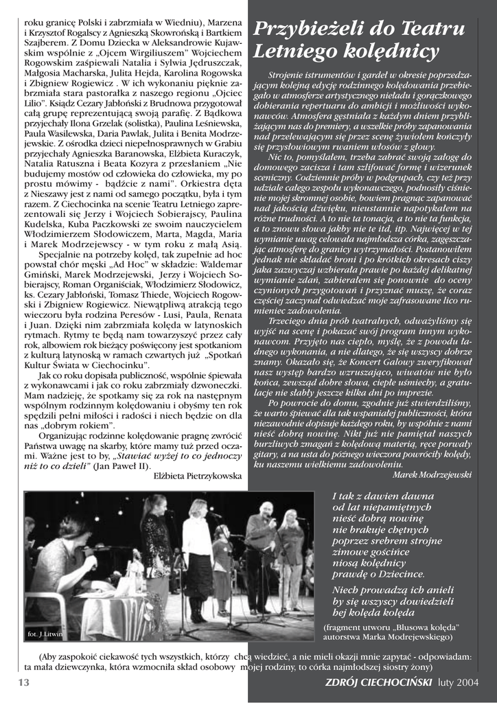 roku granic´ Polski i zabrzmia∏a w Wiedniu), Marzena i Krzysztof Rogalscy z Agnieszkà Skowroƒskà i Bartkiem Szajberem. Z Domu Dziecka w Aleksandrowie Kujawskim wspólnie z „Ojcem Wirgiliuszem” Wojciechem Rogowskim zaÊpiewali Natalia i Sylwia J´druszczak, Ma∏gosia Macharska, Julita Hejda, Karolina Rogowska i Zbigniew Rogiewicz . W ich wykonaniu pi´knie zabrzmia∏a stara pastora∏ka z naszego regionu „Ojciec Lilio”. Ksiàdz Cezary Jab∏oƒski z Brudnowa przygotowa∏ ca∏à grup´ reprezentujàcà swojà parafi´. Z Bàdkowa przyjecha∏y Ilona Grzelak (solistka), Paulina LeÊniewska, Paula Wasilewska, Daria Pawlak, Julita i Benita Modrzejewskie. Z oÊrodka dzieci niepe∏nosprawnych w Grabiu przyjecha∏y Agnieszka Baranowska, El˝bieta Kuraczyk, Natalia Ratuszna i Beata Kozyra z przes∏aniem „Nie budujemy mostów od cz∏owieka do cz∏owieka, my po prostu mówimy - bàdêcie z nami”. Orkiestra d´ta z Nieszawy jest z nami od samego poczàtku, by∏a i tym razem. Z Ciechocinka na scenie Teatru Letniego zaprezentowali si´ Jerzy i Wojciech Sobierajscy, Paulina Kudelska, Kuba Paczkowski ze swoim nauczycielem W∏odzimierzem S∏odowiczem, Marta, Magda, Maria i Marek Modrzejewscy - w tym roku z ma∏à Asià. Specjalnie na potrzeby kol´d, tak zupe∏nie ad hoc powsta∏ chór m´ski „Ad Hoc” w sk∏adzie: Waldemar Gmiƒski, Marek Modrzejewski, Jerzy i Wojciech Sobierajscy, Roman OrganiÊciak, W∏odzimierz S∏odowicz, ks. Cezary Jab∏oƒski, Tomasz Thiede, Wojciech Rogowski i Zbigniew Rogiewicz. Niewàtpliwà atrakcjà tego wieczoru by∏a rodzina Peresów - Lusi, Paula, Renata i Juan. Dzi´ki nim zabrzmia∏a kol´da w latynoskich rytmach. Rytmy te b´dà nam towarzyszyç przez ca∏y rok, albowiem rok bie˝àcy poÊwi´cony jest spotkaniom z kulturà latynoskà w ramach czwartych ju˝ „Spotkaƒ Kultur Âwiata w Ciechocinku”. Jak co roku dopisa∏a publicznoÊç, wspólnie Êpiewa∏a z wykonawcami i jak co roku zabrzmia∏y dzwoneczki. Mam nadziej´, ˝e spotkamy si´ za rok na nast´pnym wspólnym rodzinnym kol´dowaniu i obyÊmy ten rok sp´dzili pe∏ni mi∏oÊci i radoÊci i niech b´dzie on dla nas „dobrym rokiem”. Organizujàc rodzinne kol´dowanie pragn´ zwróciç Paƒstwa uwag´ na skarby, które mamy tu˝ przed oczami. Wa˝ne jest to by, „Stawiaç wy˝ej to co jednoczy ni˝ to co dzieli” (Jan Pawe∏ II). El˝bieta Pietrzykowska Przybie˝eli do Teatru Letniego kol´dnicy Strojenie istrumentów i garde∏ w okresie poprzedzajàcym kolejnà edycj´ rodzinnego kol´dowania przebiega∏o w atmosferze artystycznego nie∏adu i goràczkowego dobierania repertuaru do ambicji i mo˝liwoÊci wykonawców. Atmosfera g´stnia∏a z ka˝dym dniem przybli˝ajàcym nas do premiery, a wszelkie próby zapanowania nad przelewajàcym si´ przez scen´ ˝ywio∏em koƒczy∏y si´ przys∏owiowym rwaniem w∏osów z g∏owy. Nic to, pomyÊla∏em, trzeba zabraç swojà za∏og´ do domowego zacisza i tam szlifowaç form´ i wizerunek sceniczny. Codziennie próby w podgrupach, czy te˝ przy udziale ca∏ego zespo∏u wykonawczego, podnosi∏y ciÊnienie mojej skromnej osobie, bowiem pragnàc zapanowaç nad jakoÊcià dêwi´ku, nieustannie napotyka∏em na ró˝ne trudnoÊci. A to nie ta tonacja, a to nie ta funkcja, a to znowu s∏owa jakby nie te itd, itp. Najwi´cej w tej wymianie uwag celowa∏a najm∏odsza córka, zag´szczajàc atmosfer´ do granicy wytrzyma∏oÊci. Postanowi∏em jednak nie sk∏adaç broni i po krótkich okresach ciszy jaka zazwyczaj wzbiera∏a prawie po ka˝dej delikatnej wymianie zdaƒ, zabiera∏em si´ ponownie do oceny czynionych przygotowaƒ i przyznaç musz´, ˝e coraz cz´Êciej zaczyna∏ odwiedzaç moje zafrasowane lico rumieniec zadowolenia. Trzeciego dnia prób teatralnych, odwa˝yliÊmy si´ wyjÊç na scen´ i pokazaç swój program innym wykonawcom. Przyj´to nas ciep∏o, myÊl´, ˝e z powodu ∏adnego wykonania, a nie dlatego, ˝e si´ wszyscy dobrze znamy. Okaza∏o si´, ˝e Koncert Galowy zweryfikowa∏ nasz wyst´p bardzo wzruszajàco, wiwatów nie by∏o koƒca, zewszàd dobre s∏owa, ciep∏e uÊmiechy, a gratulacje nie s∏ab∏y jeszcze kilka dni po imprezie. Po powrocie do domu, zgodnie ju˝ stwierdziliÊmy, ˝e warto Êpiewaç dla tak wspania∏ej publicznoÊci, która niezawodnie dopisuje ka˝dego roku, by wspólnie z nami nieÊç dobrà nowin´. Nikt ju˝ nie pami´ta∏ naszych burzliwych zmagaƒ z kol´dowà materià, r´ce porwa∏y gitary, a na usta do póênego wieczora powróci∏y kol´dy, ku naszemu wielkiemu zadowoleniu. Marek Modrzejewski I tak z dawien dawna od lat niepami´tnych nieÊç dobrà nowin´ nie brakuje ch´tnych poprzez srebrem strojne zimowe goÊciƒce niosà kol´dnicy prawd´ o Dziecince. Niech prowadzà ich anieli by si´ wszyscy dowiedzieli hej kol´da kol´da fot. J.Litwin (fragment utworu „Blusowa kol´da” autorstwa Marka Modrejewskiego) (Aby zaspokoiç ciekawoÊç tych wszystkich, którzy chcà wiedzieç, a nie mieli okazji mnie zapytaç - odpowiadam: ta ma∏a dziewczynka, która wzmocni∏a sk∏ad osobowy mojej rodziny, to córka najm∏odszej siostry ˝ony) 13 ZDRÓJ CIECHOCI¡SKI luty 2004
