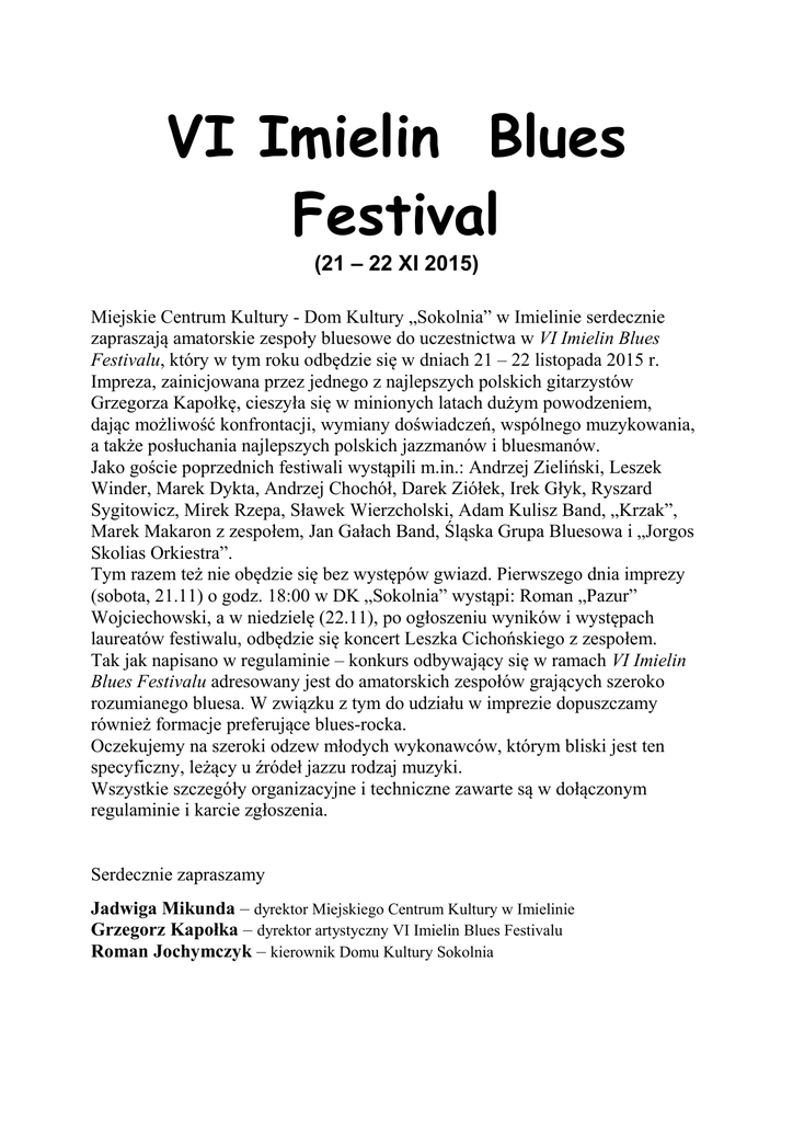 VI Imielin Blues Festival (21 – 22 XI 2015) Miejskie Centrum Kultury - Dom Kultury „Sokolnia” w Imielinie serdecznie zapraszają amatorskie zespoły bluesowe do uczestnictwa w VI Imielin Blues Festivalu, który w tym roku odbędzie się w dniach 21 – 22 listopada 2015 r. Impreza, zainicjowana przez jednego z najlepszych polskich gitarzystów Grzegorza Kapołkę, cieszyła się w minionych latach dużym powodzeniem, dając możliwość konfrontacji, wymiany doświadczeń, wspólnego muzykowania, a także posłuchania najlepszych polskich jazzmanów i bluesmanów. Jako goście poprzednich festiwali wystąpili m.in.: Andrzej Zieliński, Leszek Winder, Marek Dykta, Andrzej Chochół, Darek Ziółek, Irek Głyk, Ryszard Sygitowicz, Mirek Rzepa, Sławek Wierzcholski, Adam Kulisz Band, „Krzak”, Marek Makaron z zespołem, Jan Gałach Band, Śląska Grupa Bluesowa i „Jorgos Skolias Orkiestra”. Tym razem też nie obędzie się bez występów gwiazd. Pierwszego dnia imprezy (sobota, 21.11) o godz. 18:00 w DK „Sokolnia” wystąpi: Roman „Pazur” Wojciechowski, a w niedzielę (22.11), po ogłoszeniu wyników i występach laureatów festiwalu, odbędzie się koncert Leszka Cichońskiego z zespołem. Tak jak napisano w regulaminie – konkurs odbywający się w ramach VI Imielin Blues Festivalu adresowany jest do amatorskich zespołów grających szeroko rozumianego bluesa. W związku z tym do udziału w imprezie dopuszczamy również formacje preferujące blues-rocka. Oczekujemy na szeroki odzew młodych wykonawców, którym bliski jest ten specyficzny, leżący u źródeł jazzu rodzaj muzyki. Wszystkie szczegóły organizacyjne i techniczne zawarte są w dołączonym regulaminie i karcie zgłoszenia. Serdecznie zapraszamy Jadwiga Mikunda – dyrektor Miejskiego Centrum Kultury w Imielinie Grzegorz Kapołka – dyrektor artystyczny VI Imielin Blues Festivalu Roman Jochymczyk – kierownik Domu Kultury Sokolnia