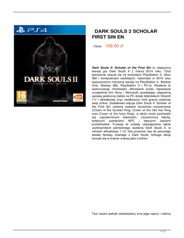 DARK SOULS 2 SCHOLAR FIRST SIN EN Cena: 159.00 zł Dark Souls II: Scholar of the First Sin to ulepszona wersja gry Dark Souls II z marca 2014 roku. Tytuł pierwotnie ukazał się na konsolach PlayStation 3, Xbox 360 i komputerach osobistych, natomiast w 2015 roku wypuszczono rzeczoną wersję na PlayStation 4, Xboksa One, Xboksa 360, PlayStation 3 i PC-ty. Wydanie to wykorzystuje możliwości oferowane przez najnowsze urządzenia firm Sony i Microsoft, posiadając ulepszoną oprawę graficzną (także na PC dzięki bibliotekom DirectX 11) i dźwiękową oraz zwiększony limit graczy podczas sesji online. Dodatkowo edycja Dark Souls II: Scholar of the First Sin zawiera wydane wcześniej rozszerzenia (Crown of the Sunken King, Crown of the Old Iron King oraz Crown of the Ivory King), a także może pochwalić się usprawnionym balansem, rozszerzoną fabułą, kolejnymi postaciami NPC i lepszymi opisami przedmiotów. Funkcje te zostały udostępnione także użytkownikom pierwotnego wydania Dark Souls II, w ramach aktualizacji 1.10. Gra przenosi nas do ponurego świata fantasy znanego z Dark Souls, którego akcja toczyła się w krainie znanej jako Lordran. Tym razem jednak odwiedzamy inne jego rejony i robimy 1/2 to w skórze nowego bohatera. Historia śmiałka i samego uniwersum została podana w typowy, niechronologiczny i poszatkowany sposób. Poznają ją więc tylko osoby, które wyłapią wszystkie poszlaki ukryte w dialogach, a nawet opisach przedmiotów i ułożą je w całość. Druga część Dark Souls jest kontynuacją pomysłów z pierwowzoru. Podczas rozgrywki przemierzamy więc labirynt powiązanych ze sobą lokacji w poszukiwaniu remedium na klątwę, jaka nęka bohatera. Najważniejsze aspekty zabawy to eksploracja, walka oraz rozwój postaci. Każde starcie, nawet ze zwykłym wrogiem, stanowi niemałe wyzwanie i czasami wymaga paru prób. Powtarzanie scen i uczenie się gry jest wpisane w rozgrywkę. Wraz z postępami w zabawie nasz bohater nabywa doświadczenie, dzięki czemu staje się coraz potężniejszy. Gracze posiadają pełną swobodę w kształtowaniu jego ścieżki rozwoju i sami mogą dopasować jego statystyki. Duże znaczenie ma także dobór broni, gdyż niemal każda z nich oferuje zupełnie inne formy ataku. Standardowo w grze pojawiają się także dziedziny magiczne – piromancja, cuda i inne formy rzucania zaklęć. W porównaniu z pierwowzorem znacznemu ulepszeniu i rozbudowaniu uległ tryb wieloosobowy. Teraz system bazuje na strukturze serwerowej, co poprawiło jakość rozgrywki i umożliwiło rozbudowanie jej o parę funkcji. Stałą częścią trybu online jest motyw pisania i odczytywania podpowiedzi zostawianych w świecie gry przez innych graczy. Ważne zmiany zaszły także w kwestii oprawy graficznej- gra korzysta z nowego, znacznie lepszego silnika. Zobacz wideo: Źródło: http://www.gry-online.pl/S016.asp?ID=24903 2/2 Powered by TCPDF (www.tcpdf.org)