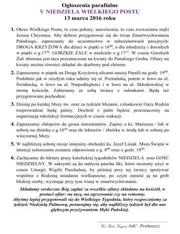 Ogłoszenia parafialne V NIEDZIELA WIELKIEGO POSTU 13 marca 2016 roku 1. Okres Wielkiego Postu, to czas pokuty, nawrócenia, to czas rozważania męki Jezusa Chrystusa. Aby dobrze przygotować się do świąt Zmartwychwstania Pańskiego, zapraszamy do uczestnictwa w nabożeństwach pasyjnych: DROGA KRZYŻOWA dla dzieci w piątki o 1600, a dla młodzieży i dorosłych w piątki o g.1730. GORZKIE ŻALE w niedziele o g.1715. W czasie Gorzkich Żali zbierana jest taca przeznaczona na kwiaty do Pańskiego Grobu. Ofiary na kwiaty można również składać do skarbony pod chórem. 2. Zapraszamy w piątek na Drogę Krzyżową ulicami naszej Parafii na godz. 1900. Podobnie jak w zeszłym roku udamy się ul. Poznańską, potem w lewo na ul. Świdnicką, w lewo na ul. Niepodległości i w lewo na ul. Skłodowskiej w stronę kościoła. Zabieramy ze sobą świece z osłonkami. Będą też przygotowane pochodnie. 3. Dzisiaj po każdej Mszy św. oraz za tydzień Mszami, członkowie Oazy Rodzin rozprowadzać będą palmy. Dochód z palm będzie przeznaczony na organizację rekolekcji formacyjnych w czasie wakacji. 4. Zapraszamy chłopców do grona ministrantów. Zapisy u ks. Mariusza / lub w sobotę na zbiórkę o g.1030 oraz do lektorów / zbiórka w środę lub w sobotę po wieczornej Mszy. 5. W najbliższą sobotę swoje imieniny obchodzi ks. Józef Lisiak. Msza Święta w intencji solenizanta zostanie odprawiona o g. 800 oraz o godz. 1800. 6. Zachęcamy do lektury prasy katolickiej tygodników NIEDZIELA oraz GOŚĆ NIEDZIELNY. W zakrystii są do nabycia pascha liki, które możemy użyć w czasie Liturgii Wigilii Paschalnej, by później przy tej świecy spożywać wspólnie z Rodziną śniadanie wielkanocne, po czym zanieść ją na grób bliskiej osoby, wyznając przy tym wiarę w zmartwychwstanie. Składamy serdeczne Bóg zapłać za wszelkie ofiary składane na kościół, w postaci ofiar: na tacę, na ogrzewanie czy na remonty. Abyśmy lepiej przygotowali się do Wielkiego Tygodnia, który rozpoczniemy za tydzień Niedzielą Palmową, postarajmy się, aby najbliższy tydzień był dla nas głębszym przeżywaniem Męki Pańskiej. ….…………………………………. Ks. Piotr Kopera SAC – Proboszcz