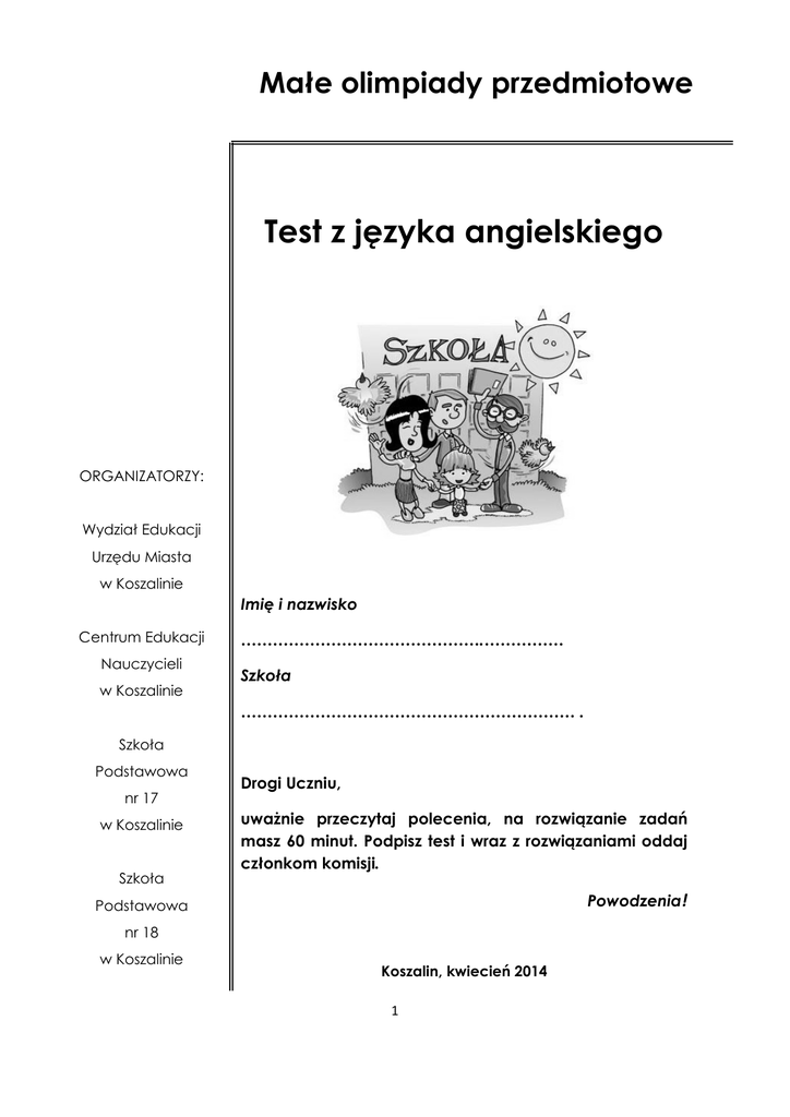 Małe olimpiady przedmiotowe Test z języka angielskiego ORGANIZATORZY: Wydział Edukacji Urzędu Miasta w Koszalinie Imię i nazwisko Centrum Edukacji Nauczycieli ……………………………………….…………… Szkoła w Koszalinie ……………………………………………………… . Szkoła Podstawowa Drogi Uczniu, nr 17 w Koszalinie uważnie przeczytaj polecenia, na rozwiązanie zadań masz 60 minut. Podpisz test i wraz z rozwiązaniami oddaj członkom komisji. Szkoła Powodzenia! Podstawowa nr 18 w Koszalinie Koszalin, kwiecień 2014 1 ROZUMIENIE ZE SŁUCHU Zapoznaj się z zadaniem. Usłyszysz dwukrotnie quiz na temat znanych wynalazków. Uzupełnij brakujące informacje. Za każdą poprawną odpowiedź otrzymasz 1 punkt. INVENTOR INVENTION DATE PLACE telescope .......... Italy - his largest telescope was 120cm long - he used it to study the ............................ and Mars ...................... ........... USA - telephones first used in US cities - by 1887, more than ............................ phones in USA light bulb .......... USA - Edison also invented the ............................... automobile ............ Germany - first car had only ...................... wheels, a steel frame and went ...................... kph - by 1888 Benz had 50 workers building the 3-wheeled cars aeroplane 1903 GALILEO ALEXANDER G. BELL NOTES THOMAS EDISON KARL BENZ THE WRIGHT BROTHERS USA -first plane flew ............ feet in ................... seconds - Orville Wright was the first person to fly an aeroplane (adapted from Express Publishing) 2 ROZUMIENIE TEKSTU CZYTANEGO 1 Przeczytaj ulotkę informacyjną na temat internetu. Dopasuj pytania A-G do luk w tekście, ponumerowanych 1-6. Za każdą poprawną odpowiedź otrzymasz 1 punkt. UWAGA: Jedno pytanie podane zostało dodatkowo i nie pasuje do żadnej luki. THE INTERNET: FAQs (Frequently Asked Questions) The Internet is without doubt one of the most important inventions in history. It was started in 1968 by the US government, but at first it was used mainly by scientists. Since 1990, when the World Wide Web was created, it has changed the world, and its uses are growing every day. 1 .......... The Internet is a network (several networks, in fact) of millions of computers around the world, connected by phone lines, satellite or cable, so that all the computers on the net can exchange information with each other. 2 .......... Not quite. The Internet links computers, and the World Wide Web is a system which links the information stored inside these computers. 3 .......... A company or organisation stores its information in electronic documents on one of the Internet computers, somewhere in the world. This computer space - the company's website - has an address. In the same way that every telephone has a number. To visit a website, you simply enter the address. Your computer is connected to the website, a document is downloaded, and a page appears on your computer screen. 4 .......... When you visit a website looking for information, some words on the page may be underlined, showing that there is more information about the subject in another document. If you click on one of these words, the Web automatically connects your computer to a new document or website, even if this is stored thousands of kilometres away. You're surfing the net! 5 .......... The main use of the Internet is to find information - for your schoolwork or job, or just to find out more about your hobbies, sports or current events. You can also use the Internet to read newspapers and magazines, play games, plan your holiday or buy things from your favourite shop. E-mail makes it possible to send electronic messages anywhere in the world in seconds, and you can use the Internet to 'chat' with people and make new friends. 3 6 .......... If you don't already use the Internet, all you need to get started is a computer, a modem and a phone line. Using the Internet is getting cheaper and easier all the time. Are you ready to surf the net? There's a whole exciting internet world out there waiting for you! (adapted from Express Publishing) A Where can I buy a computer and a modem? B What do I need in order to use the Internet? C How do I 'surf the net'? D That's the same thing as the Web, isn't it? E What exactly is the Internet? F What can I use the Internet for? G What is a web site, and how I visit one? 2 Przeczytaj tekst jeszcze raz i zdecyduj, które z podanych zdań są prawdziwe (T-true), a które nie (F-false). Zaznacz znakiem x odpowiednią rubrykę w tabeli. Za każdą poprawną odpowiedź otrzymasz 1 punkt. True 1. 2. 3. 4. 5. False The Internet was started in 1990. The Internet links computers. To visit a web site, you simply enter the telephone number. The main use of the Internet is to find mistakes. Using the Internet is getting more expensive. 3 Przeczytaj uważnie opisy pięciu wynalazków i dopasuj ich nazwy do opisów. Za każdą poprawną odpowiedź otrzymasz 1 punkt. video compass radar Walkman space blanket A ....................... This invention completely changed the lives of music-lovers around the world. At first Sony executives thought the idea of people walking round with headphones on their heads would not be a success. But its creator, Akio Morita, always knew that the portable device , smaller than a paperback book, would be popular. 4 B ........................ This device was the most important navigation instrument to be invented in the last millennium. Originally, sailors used the position of the Sun and the North Star to know which way they were going, but clouds often caused them to lose their way. This invention made possible the exploration of distant lands, including America. C ......................... The first machines were built in the 1950s but for many years its cost limited its use to the television and film industry. By the early 1980s cheaper versions were introduced and have since become as common as telev