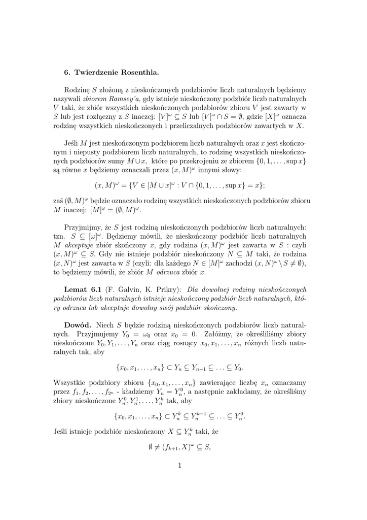 Lemat 6.8 (F. Galvin, K. Prikry): Jeśli rodzina nieskończonych podzbiorów