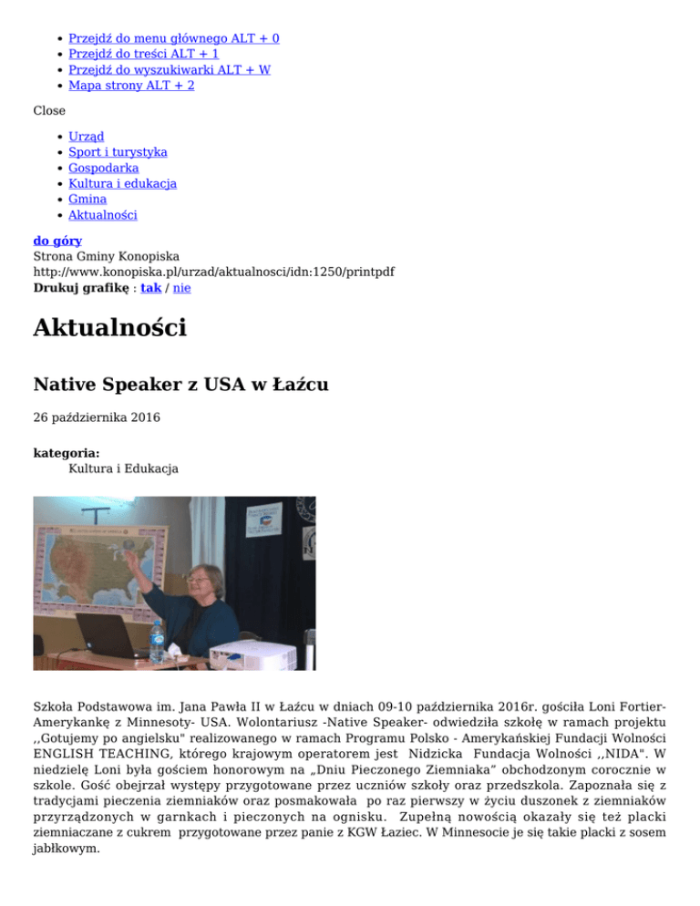 Przejdź do menu głównego ALT + 0 Przejdź do treści ALT + 1 Przejdź do wyszukiwarki ALT + W Mapa strony ALT + 2 Close Urząd Sport i turystyka Gospodarka Kultura i edukacja Gmina Aktualności do góry Strona Gminy Konopiska http://www.konopiska.pl/urzad/aktualnosci/idn:1250/printpdf Drukuj grafikę : tak / nie Aktualności Native Speaker z USA w Łaźcu 26 października 2016 kategoria: Kultura i Edukacja Szkoła Podstawowa im. Jana Pawła II w Łaźcu w dniach 09-10 października 2016r. gościła Loni FortierAmerykankę z Minnesoty- USA. Wolontariusz -Native Speaker- odwiedziła szkołę w ramach projektu ,,Gotujemy po angielsku" realizowanego w ramach Programu Polsko - Amerykańskiej Fundacji Wolności ENGLISH TEACHING, którego krajowym operatorem jest Nidzicka Fundacja Wolności ,,NIDA". W niedzielę Loni była gościem honorowym na „Dniu Pieczonego Ziemniaka” obchodzonym corocznie w szkole. Gość obejrzał występy przygotowane przez uczniów szkoły oraz przedszkola. Zapoznała się z tradycjami pieczenia ziemniaków oraz posmakowała po raz pierwszy w życiu duszonek z ziemniaków przyrządzonych w garnkach i pieczonych na ognisku. Zupełną nowością okazały się też placki ziemniaczane z cukrem przygotowane przez panie z KGW Łaziec. W Minnesocie je się takie placki z sosem jabłkowym. Na imprezę przybyli zaproszeni goście w osobach: Wójt Gminy Konopiska Jerzy Żurek, radna Łaźca pani Agnieszka Chmielewska(jednocześnie koordynator projektu), radny Wąsosza pan Andrzej Jarosz, sołtys Łaźca pani Jadwiga Kromołowska, sołtys Wąsosza pani Jan Błaszczyk, pani Zofia Szczerbak przewodnicząca KGW Łaziec wraz z członkiniami oraz rodzice uczniów i mieszkańcy. Wizyta Loni wywołała wiele pozytywnych reakcji i emocji wśród lokalnej społeczności - wszyscy bardzo ciepło ją powitali i miło gościli. W poniedziałek Loni przeprowadziła zajęcia w szkole z przedszkolakami, uczestnikami projektu oraz przedstawiła ciekawą prelekcję nt. „ Życie Amerykańskich Dzieci”. Prezentacja skierowana była do uczniów z klas 4-6 SP w Łaźcu oraz do delegacji dyrektorów, nauczycieli języka angielskiego oraz uczniów klas szóstych ZSP w Aleksandrii, ZSP w Konopiskach, ZSP w Kopalni, ZSP w Rększowicach, SP w Jamkach- Korzonku oraz kl. 1 gimnazjum ZSP w Hutkach. Uczniowie z ciekawością i zainteresowaniem słuchali Loni, a po prezentacji zadawali pytania dotyczące codziennego życia w Minnesocie. Była to doskonała okazja do posłuchania „żywego” języka angielskiego. Po zajęciach Loni Fortier w towarzystwie wójta gminy Konopiska Jerzego Żurka zwiedziała pole golfowe w Konopiskach. Loni gra w golfa w Minnesocie ale przyznała, że nigdy wcześniej nie widziała tak pięknego pola golfowego jak to. W poniedziałkowe popołudnie pożegnaliśmy Loni, pełną nowej wiedzy, zadowolenia,,ogromnego szczęścia i podziwu dla polskiej gościnności. Wolontariuszka pojechała do szkoły w Nowych Skalmierzycach. Szkoła w Łaźcu była jedenastą szkołą w Polsce, którą odwiedziła. Monika Wewiór-Mendrela/Agnieszka Chmielewska 26 paź 2016 Native Speaker z USA w Łaźcu Native Native Native Native Speaker Speaker Speaker Speaker z z z z USA USA USA USA powrót do listy aktualności w w w w Łaźcu Łaźcu Łaźcu Łaźcu