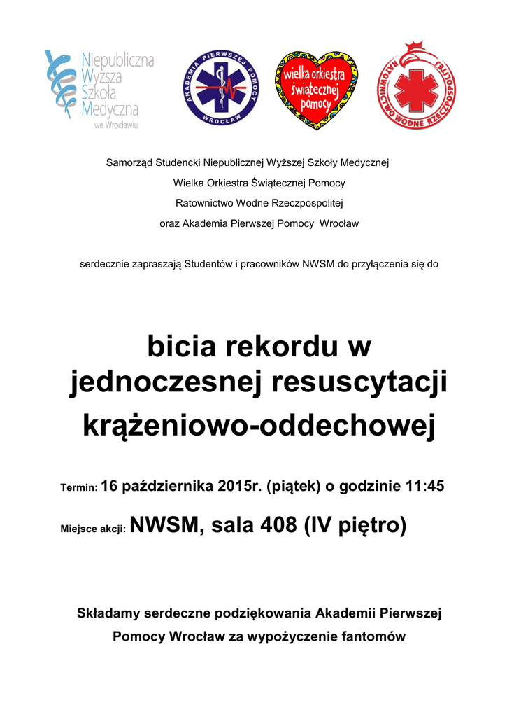 Samorząd Studencki Niepublicznej Wyższej Szkoły Medycznej Wielka Orkiestra Świątecznej Pomocy Ratownictwo Wodne Rzeczpospolitej oraz Akademia Pierwszej Pomocy Wrocław serdecznie zapraszają Studentów i pracowników NWSM do przyłączenia się do bicia rekordu w jednoczesnej resuscytacji krążeniowo-oddechowej Termin: 16 października 2015r. (piątek) o godzinie 11:45 Miejsce akcji: NWSM, sala 408 (IV piętro) Składamy serdeczne podziękowania Akademii Pierwszej Pomocy Wrocław za wypożyczenie fantomów