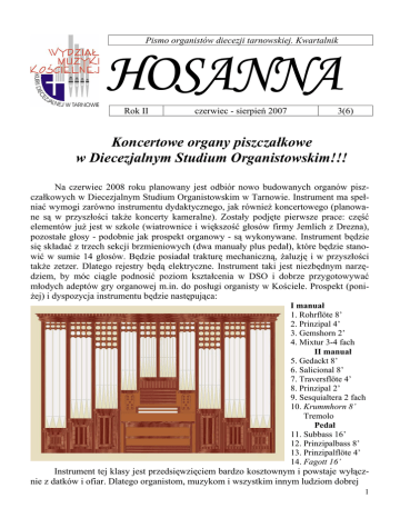 Pismo organistów diecezji tarnowskiej. Kwartalnik HOSANNA Rok II czerwiec - sierpień 2007 3(6) Koncertowe organy piszczałkowe w Diecezjalnym Studium Organistowskim!!! Na czerwiec 2008 roku planowany jest odbiór nowo budowanych organów piszczałkowych w Diecezjalnym Studium Organistowskim w Tarnowie. Instrument ma spełniać wymogi zarówno instrumentu dydaktycznego, jak również koncertowego (planowane są w przyszłości także koncerty kameralne). Zostały podjęte pierwsze prace: część elementów już jest w szkole (wiatrownice i większość głosów firmy Jemlich z Drezna), pozostałe głosy - podobnie jak prospekt organowy - są wykonywane. Instrument będzie się składać z trzech sekcji brzmieniowych (dwa manuały plus pedał), które będzie stanowić w sumie 14 głosów. Będzie posiadał trakturę mechaniczną, żaluzję i w przyszłości także zetzer. Dlatego rejestry będą elektryczne. Instrument taki jest niezbędnym narzędziem, by móc ciągle podnosić poziom kształcenia w DSO i dobrze przygotowywać młodych adeptów gry organowej m.in. do posługi organisty w Kościele. Prospekt (poniżej) i dyspozycja instrumentu będzie następująca: I manuał 1. Rohrflöte 8’ 2. Prinzipal 4’ 3. Gemshorn 2’ 4. Mixtur 3-4 fach II manuał 5. Gedackt 8’ 6. Salicional 8’ 7. Traversflöte 4’ 8. Prinzipal 2’ 9. Sesquialtera 2 fach 10. Krummhorn 8’ Tremolo Pedał 11. Subbass 16’ 12. Prinzipalbass 8’ 13. Prinzipalflöte 4’ 14. Fagott 16’ Instrument tej klasy jest przedsięwzięciem bardzo kosztownym i powstaje wyłącznie z datków i ofiar. Dlatego organistom, muzykom i wszystkim innym ludziom dobrej 1 woli, którzy zechcą mieć swoją piszczałkę w * Trwają zapisy do Diecezjalnego Studium Organistowskiego powstającym instrumencie - choćby najmniejszą - i na rok szkolny 2007/8. Dokumenty wesprą powstające dzieło, składamy już dziś szczenależy składać w Diecezjalnym re BÓG ZAPŁAĆ! Studium Organistowskim przy ul. Dwernickiego 1 lub w Wydziale Muzyki Kościelnej Kurii DieceKonto, na które można wpłacać ofiary: zjalnej w Tarnowie do 30 czerwca (możliwy termin dodatkowy: do 20 Wydział Muzyki Kościelnej IX - w miarę wolnych miejsc). Kurii Diecezjalnej w Tarnowie, Wszystkie szczegółowe informacje PEKAO S.A. I O/Tarnów znajdują się na stronie internetowej 84 1240 1910 1111 0010 1325 2053 Wydziału z dopiskiem: „Organy” www.muzyka.diecezja.tarnow.pl/ Szkoła Organistowska. * I Przegląd Schol Diecezji Tarnowskiej odbędzie się 29 września 2007 roku w Tarnowie. Do udziału w przeglądzie zapraszamy wszystkie schole działające w naszej diecezji. Regulamin przeglądu oraz pozostałe informacje znajdują się na stronie internetowej Wydziału www.muzyka.diecezja.tarnow.pl/ Przegląd schol. * Dziewczęcy Chór Katedralny Puellae Orantes otrzymał nominację do „Fryderyka 2006” za nagraną w minionym roku płytę Magnificate et glorificate Dominum - GRATULUJEMY!!! * 15 IV br. ks. bp Wiktor Skworc dokonał konsekracji kościoła i poświęcenia nowo wybudowanych organów piszczałkowych w parafii Miłosierdzia Bożego w Woli Rzędzińskiej (bliższe inf. na temat instrumentu w poprzednim numerze pisma Hosanna). Prezentacji organów dokonał ks. G. Piekarz. * * * 2 * * * Obecnie w Szkole Organistowskiej znajdują się dwa elektroniczne instrumenty organowe firmy Viscount i sześć pianin. Nie można jednak myśleć o ciągłym podnoszeniu poziomu kształcenia bez posiadania przynajmniej jednego instrumentu piszczałkowego o trakturze mechanicznej. Tylko bowiem przy takim instrumencie przyszły adept gry organowej może poznać pewne tajniki gry związane z artykulacją, a co za tym idzie, także z zadęciem dźwięku, z jego nabrzmieniem oraz wybrzmieniem. Te i wiele innych tajników gry są nie do uchwycenia przy instrumencie elektronicznym. Także traktura mechaniczna organów piszczałkowych najlepiej wpływa na skuteczne kształtowanie techniki gry u ucznia. Ponadto każdy dodatkowy instrument ułatwi zajęcia dydaktyczne indywidualne z uczniami. Należy wspomnieć, że w szkole zajęcia z gry na organach oraz z gry na fortepianie są zajęciami indywidualnymi ucznia z profesorem i trwają przez cztery lata - cały okres kształcenia. Mając na uwadze fakt, iż w szkole obecnie kształci się 85 uczniów, trzeba zauważyć, że każdy nowy instrument jest na wagę złota. Dlatego też wszystkich chętnych, którzy chcą się kształcić w tym kierunku i czują pragnienie, by w przyszłości móc jako fachowiec godnie zasiadać przy królewskim instrumencie, zapraszamy do naszej szkoły. (xgp) Posługa organisty jako powołanie (cz. VI) W kontekście tych teologicznych rozważań warto przytoczyć myśl Josefa Antona Saladina zawartą w wykładzie, który wygłosił do organistów zebranych na diecezjalnym zjeździe w dniach 16-19 sierpnia 1955 r. w Ochsenhausen. Wykład, którego temat brzmiał Posługa i zadania organów w kulcie Kościoła katolickiego, omawia w pierwszym punkcie organy i ich użycie w liturgii; w drugim instrument jako brzmiący znak krzyża w liturgicznym miejscu; a w trzecim organy jako symboliczny wyraz współofiary wspólnoty1. Można powiedzieć, iż cały wykład prowadził do końcowej refleksji, którą profesor wypowiedział w ostatnim zdaniu, a która wskazuje na głębokie teologicznie uzasadnienie użycia organów w liturgii: „one [gra, brzmienie, posługa] powinny prowadzić od Misterium Wcielenia przez Misterium krzyża, aż do Misterium wiecznego zmartwychwstania z Chrystusem”2. To stwierdzenie, które można by umieścić w miejscu pracy każdego organisty, profesor uzasadnia bardzo wnikliwie. W Misterium Wcielenia Syna Bożego widzi pewną analogię do roli organów w liturgii: tak jak Maryja podczas zwiastowania wyrzekła swoje „fiat”, stając się do końca swojego życia poddaną woli Boga, tak i organista podobnie powinien traktować swoją funkcję podczas liturgii – jako 