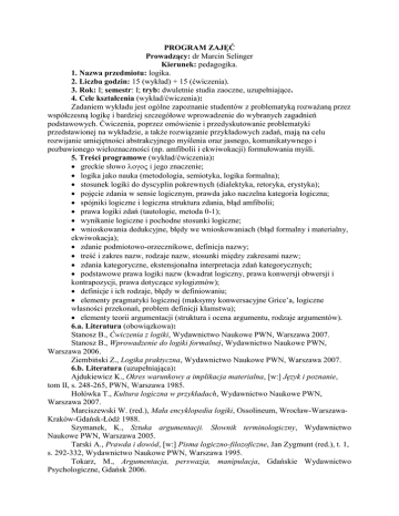 PROGRAM ZAJĘĆ Prowadzący: dr Marcin Selinger Kierunek: pedagogika. 1. Nazwa przedmiotu: logika. 2. Liczba godzin: 15 (wykład) + 15 (ćwiczenia). 3. Rok: I; semestr: I; tryb: dwuletnie studia zaoczne, uzupełniające. 4. Cele kształcenia (wykład/ćwiczenia): Zadaniem wykładu jest ogólne zapoznanie studentów z problematyką rozważaną przez współczesną logikę i bardziej szczegółowe wprowadzenie do wybranych zagadnień podstawowych. Ćwiczenia, poprzez omówienie i przedyskutowanie problematyki przedstawionej na wykładzie, a także rozwiązanie przykładowych zadań, mają na celu rozwijanie umiejętności abstrakcyjnego myślenia oraz jasnego, komunikatywnego i pozbawionego wieloznaczności (np. amfibolii i ekwiwokacji) formułowania myśli. 5. Treści programowe (wykład/ćwiczenia): greckie słowo i jego znaczenie; logika jako nauka (metodologia, semiotyka, logika formalna); stosunek logiki do dyscyplin pokrewnych (dialektyka, retoryka, erystyka); pojęcie zdania w sensie logicznym, prawda jako naczelna kategoria logiczna; spójniki logiczne i logiczna struktura zdania, błąd amfibolii; prawa logiki zdań (tautologie, metoda 0-1); wynikanie logiczne i pochodne stosunki logiczne; wnioskowania dedukcyjne, błędy we wnioskowaniach (błąd formalny i materialny, ekwiwokacja); zdanie podmiotowo-orzecznikowe, definicja nazwy; treść i zakres nazw, rodzaje nazw, stosunki między zakresami nazw; zdania kategoryczne, ekstensjonalna interpretacja zdań kategorycznych; podstawowe prawa logiki nazw (kwadrat logiczny, prawa konwersji obwersji i kontrapozycji, prawa dotyczące sylogizmów); definicje i ich rodzaje, błędy w definiowaniu; elementy pragmatyki logicznej (maksymy konwersacyjne Grice’a, logiczne własności przekonań, problem definicji kłamstwa); elementy teorii argumentacji (struktura i ocena argumentu, rodzaje argumentów). 6.a. Literatura (obowiązkowa): Stanosz B., Ćwiczenia z logiki, Wydawnictwo Naukowe PWN, Warszawa 2007. Stanosz B., Wprowadzenie do logiki formalnej, Wydawnictwo Naukowe PWN, Warszawa 2006. Ziembiński Z., Logika praktyczna, Wydawnictwo Naukowe PWN, Warszawa 2007. 6.b. Literatura (uzupełniająca): Ajdukiewicz K., Okres warunkowy a implikacja materialna, [w:] Język i poznanie, tom II, s. 248-265, PWN, Warszawa 1985. Hołówka T., Kultura logiczna w przykładach, Wydawnictwo Naukowe PWN, Warszawa 2007. Marciszewski W. (red.), Mała encyklopedia logiki, Ossolineum, Wrocław-WarszawaKraków-Gdańsk-Łódź 1988. Szymanek, K., Sztuka argumentacji. Słownik terminologiczny, Wydawnictwo Naukowe PWN, Warszawa 2005. Tarski A., Prawda i dowód, [w:] Pisma logiczno-filozoficzne, Jan Zygmunt (red.), t. 1, s. 292-332, Wydawnictwo Naukowe PWN, Warszawa 1995. Tokarz, M., Argumentacja, perswazja, manipulacja, Gdańskie Wydawnictwo Psychologiczne, Gdańsk 2006.